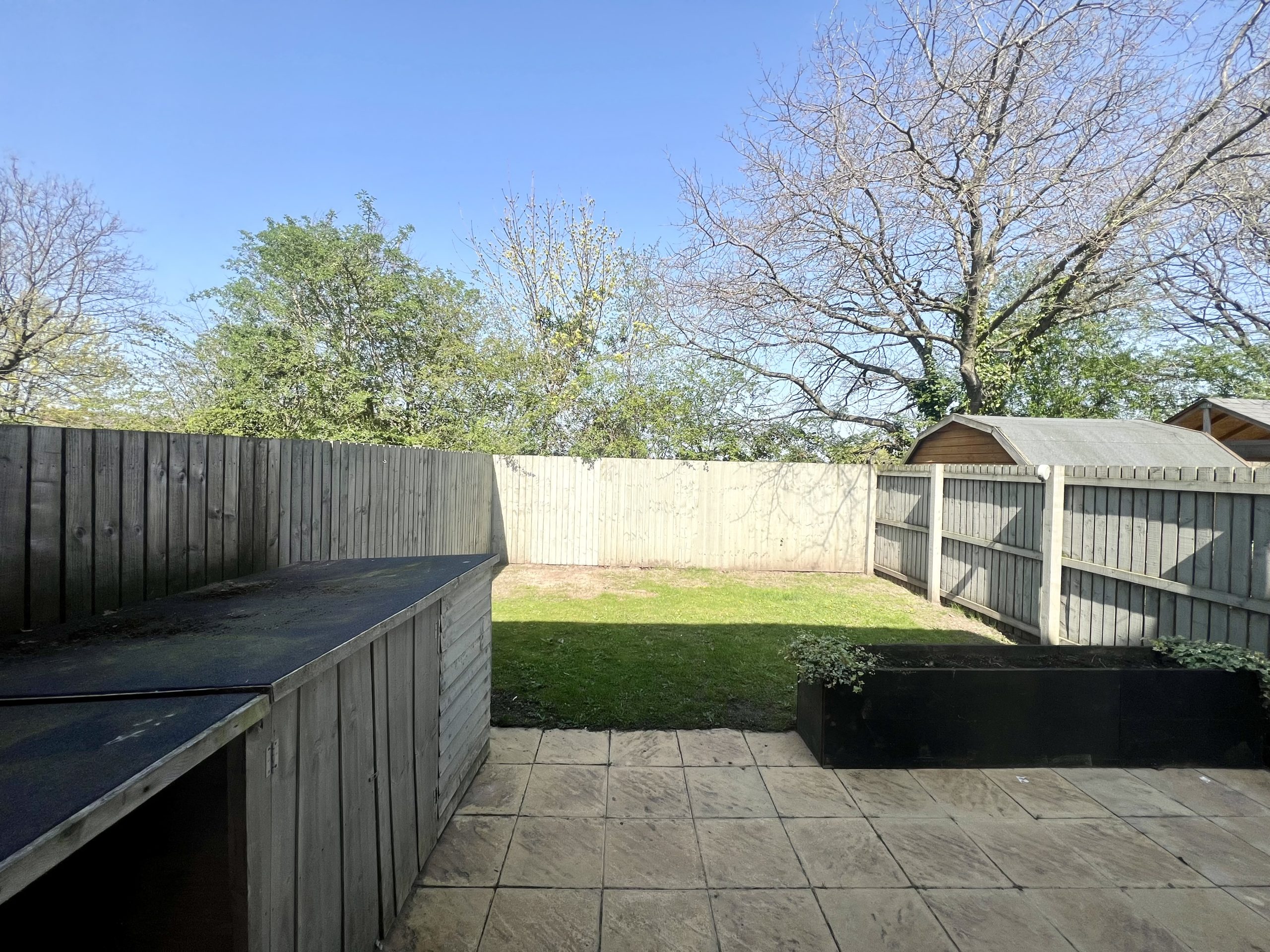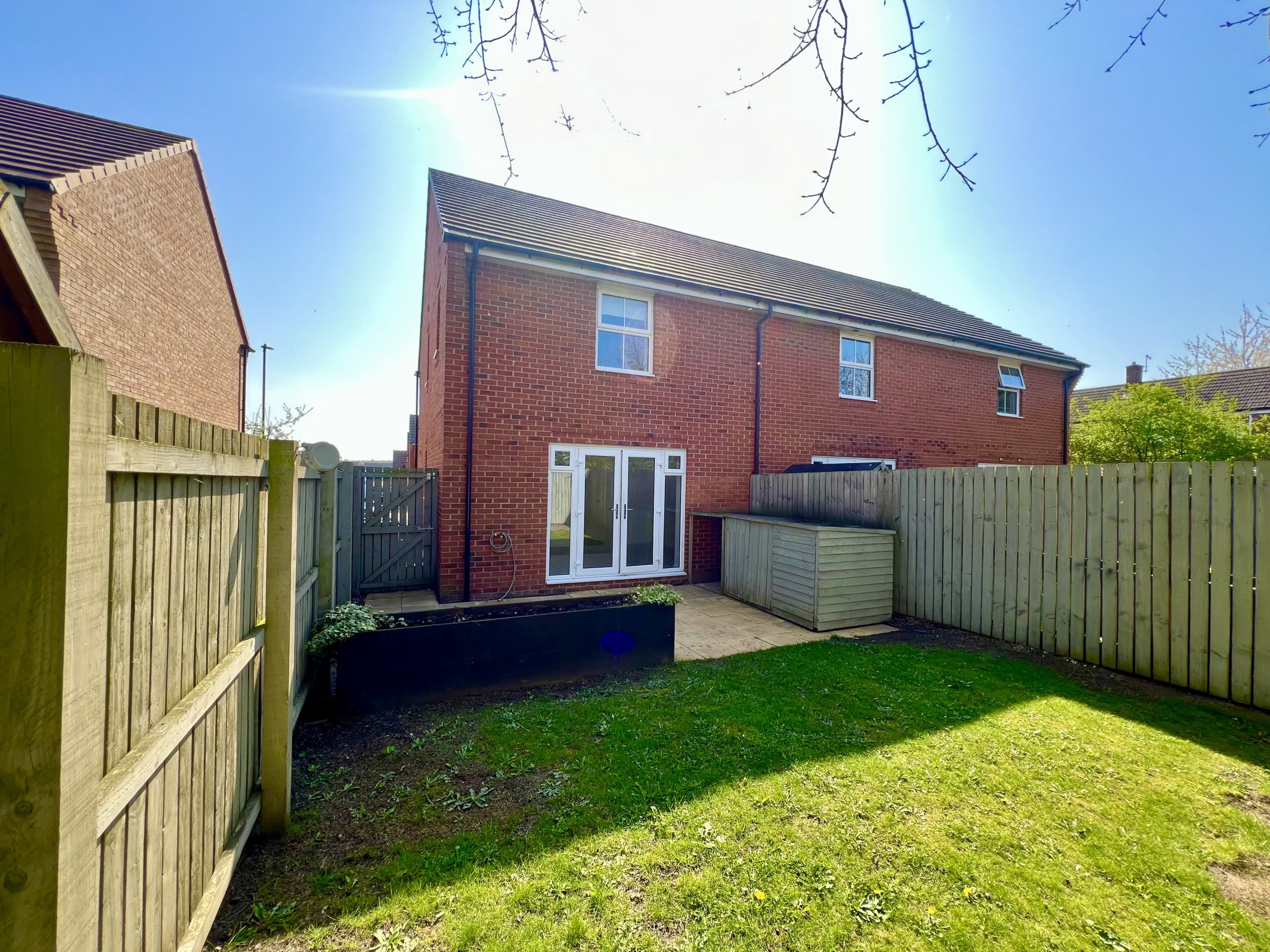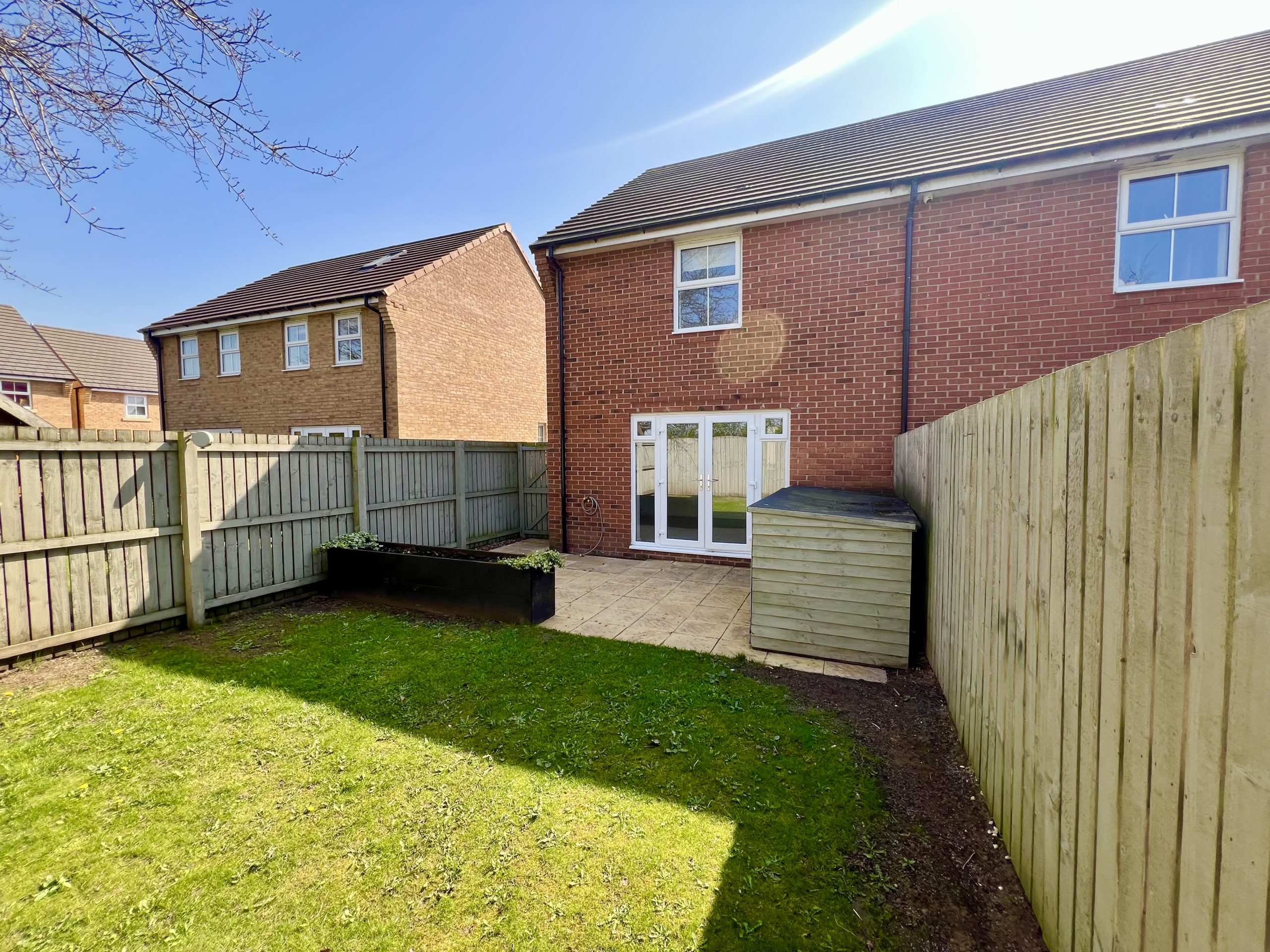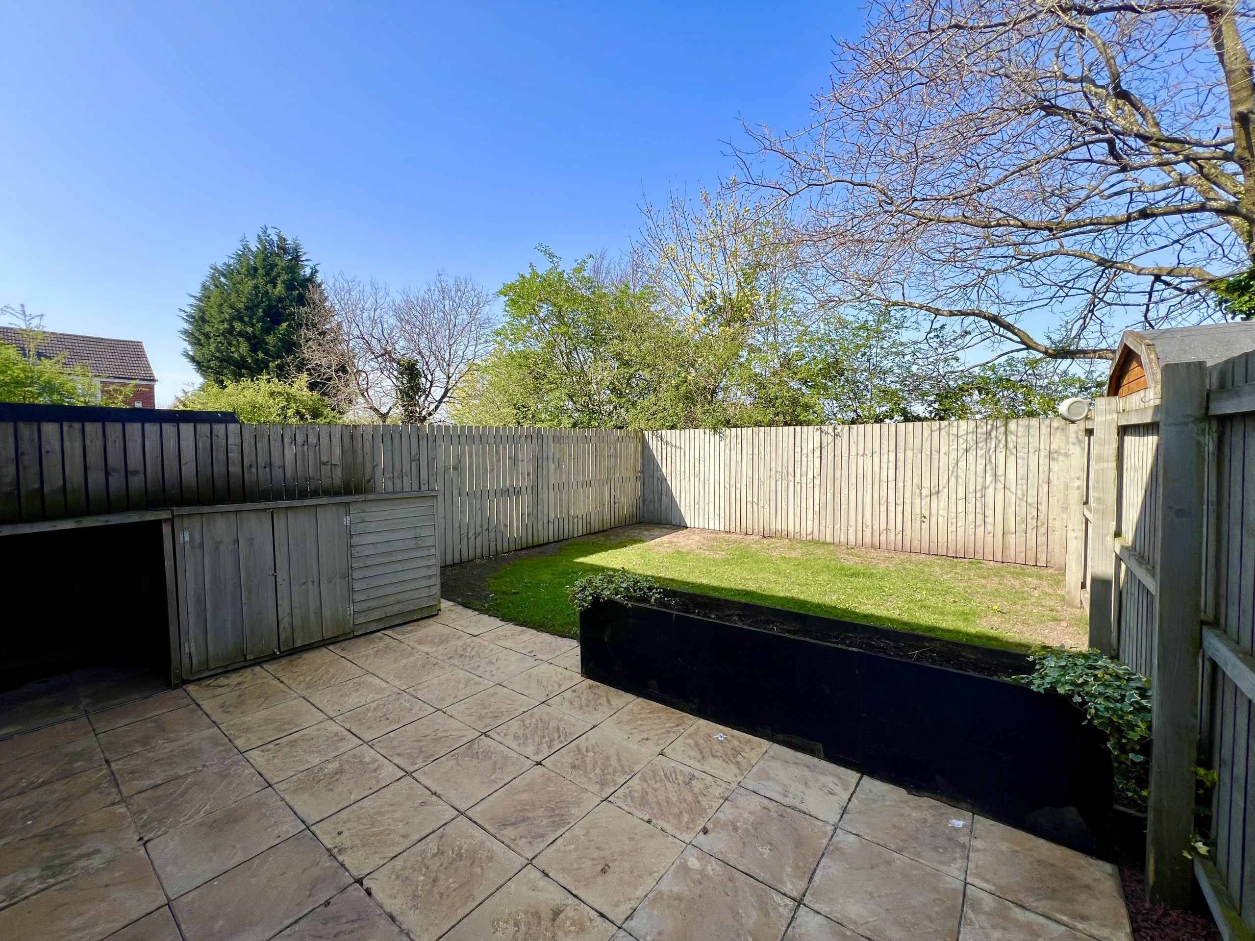 The property offers a well-maintained and secure rear garden, mainly laid to lawn with a patio area ideal for outdoor seating or dining. The garden includes shrub borders and a gated pathway providing access to the front of the property. To the front, there is a driveway offering parking for two vehicles.