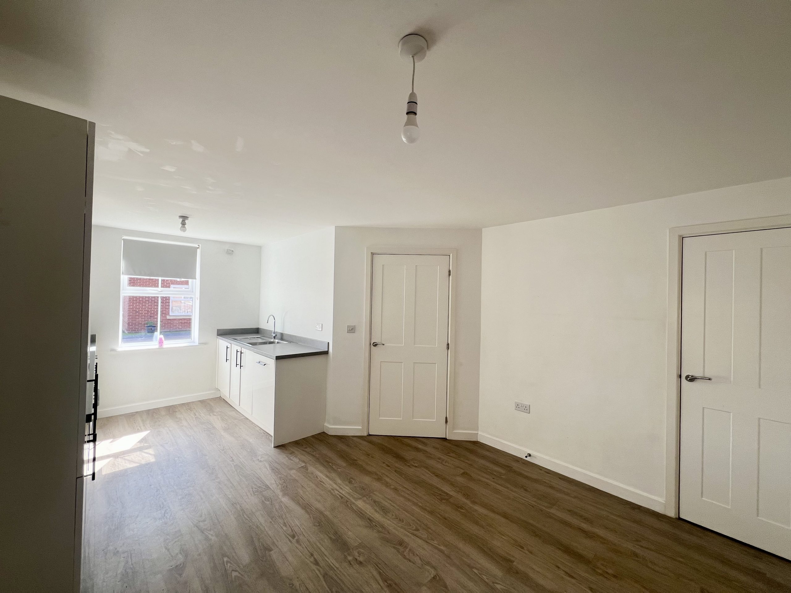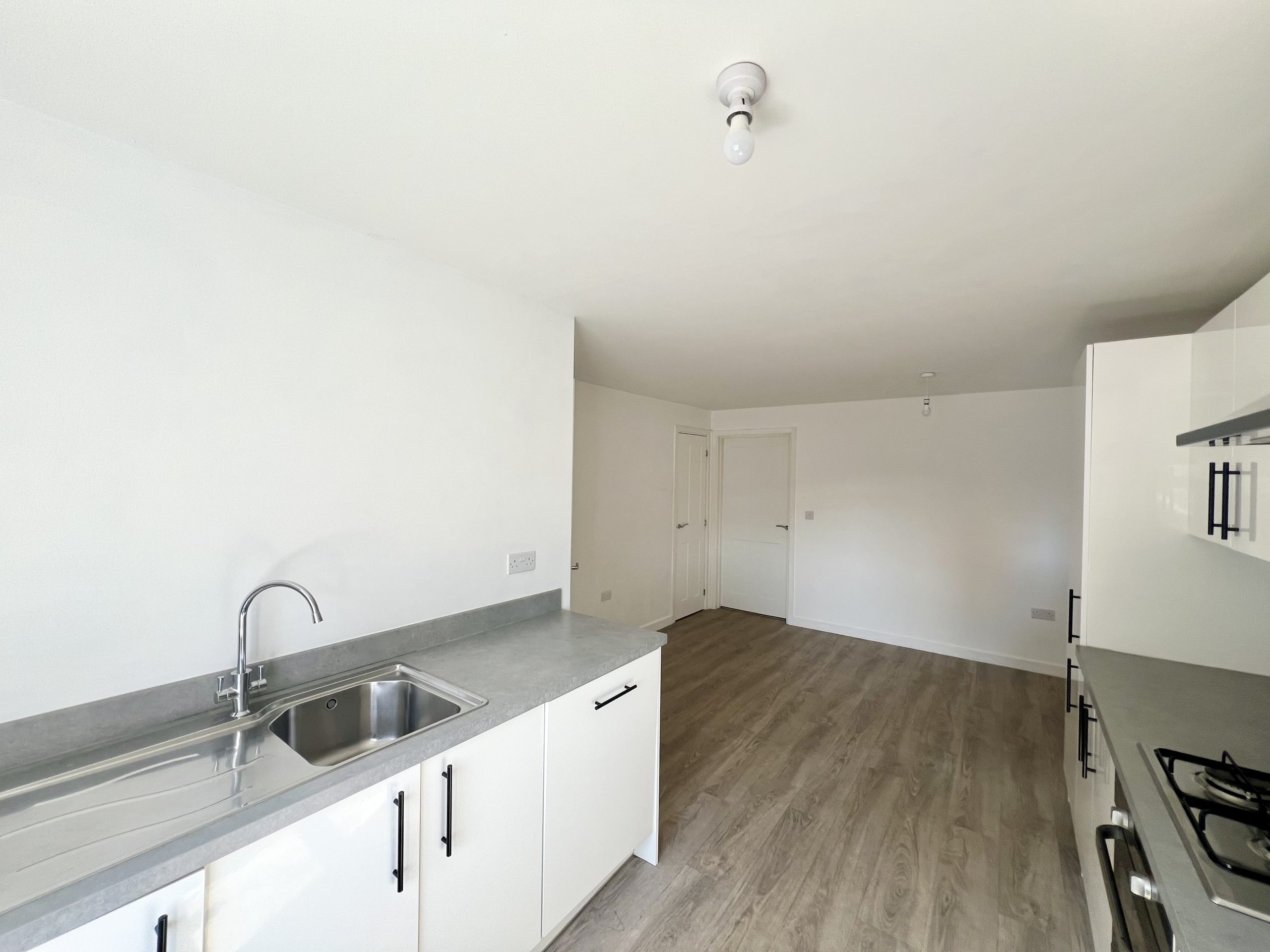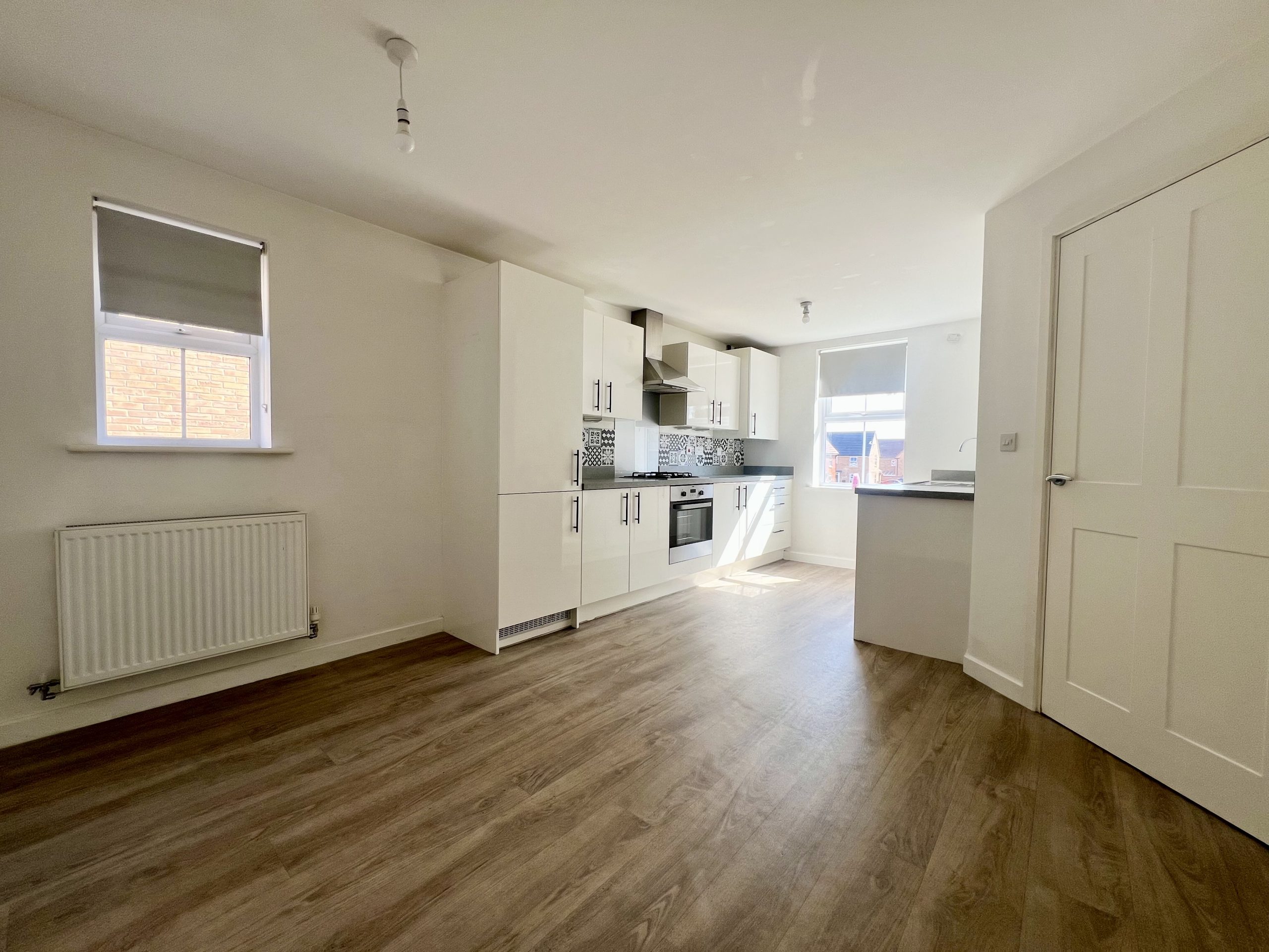 There is a well-appointed kitchen/diner which is fitted with a range of contemporary high-gloss white wall and base units, complemented by contrasting work surfaces. Integrated appliances include an oven with gas hob and extractor hood, dishwasher, fridge, freezer, and washing machine. The space further benefits from a useful storage cupboard and provides direct access to the lounge. The dining area offers ample space for a table and chairs and is finished with wood-effect flooring, a radiator, and pendant lighting, creating a bright and versatile setting ideal for both everyday living and entertaining.