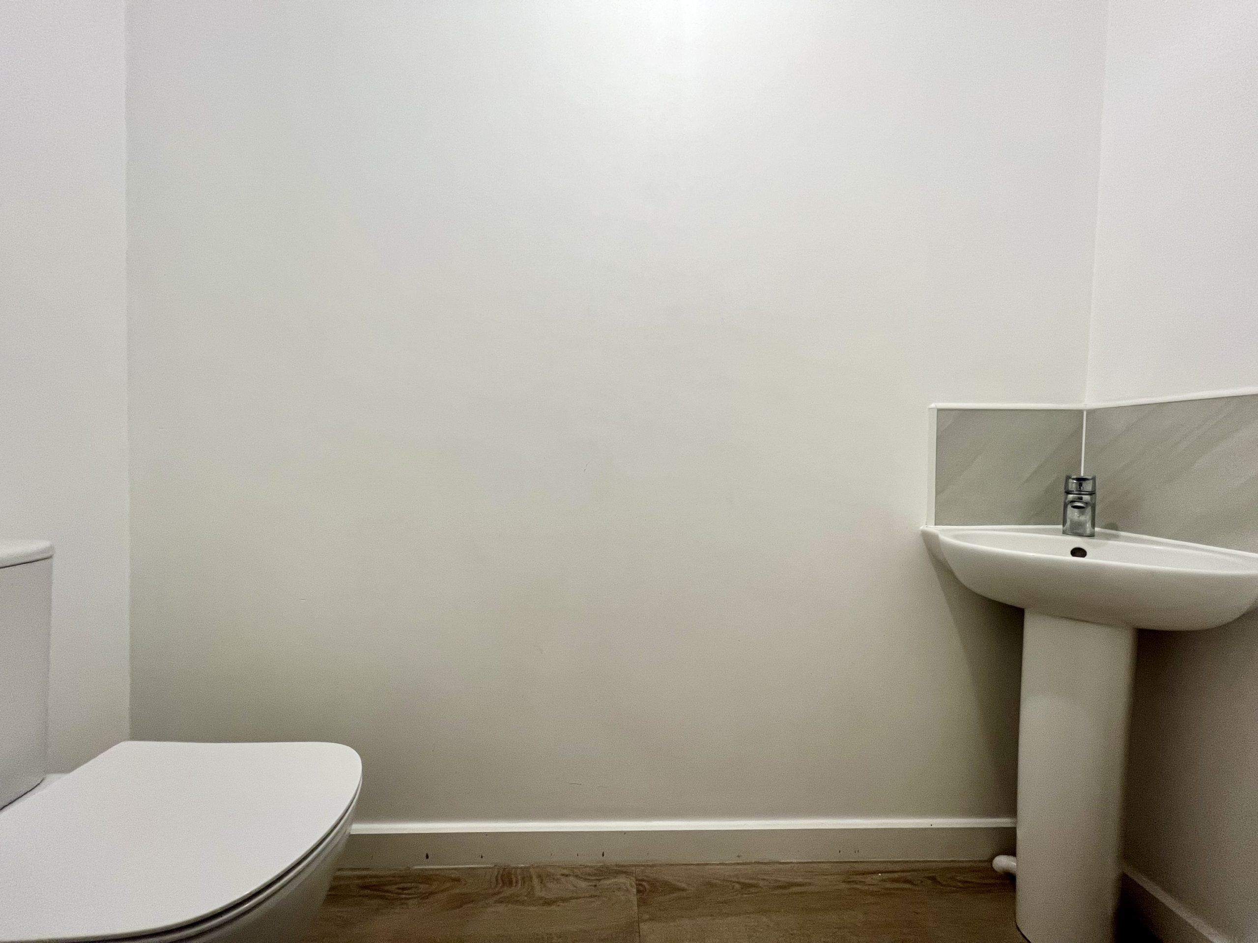 The WC is fitted with a hand basin and toilet, with vinyl flooring, a radiator and pendant lighting.