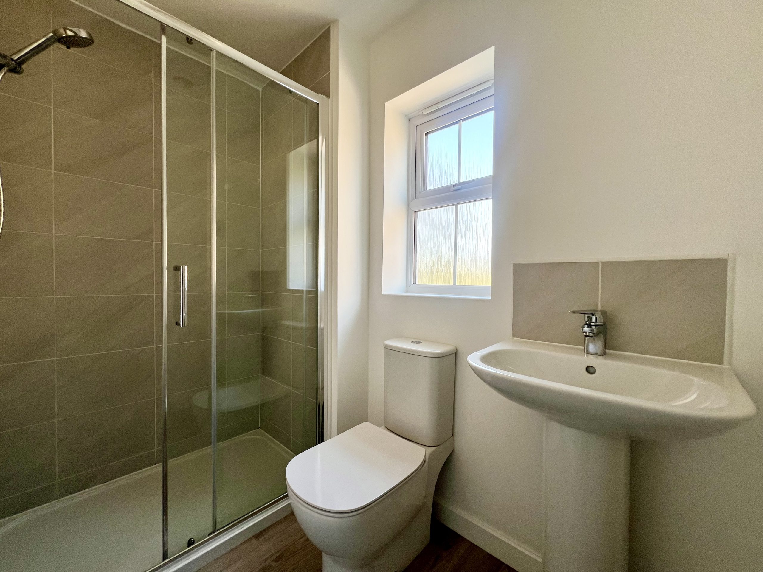 The ensuite is appointed with a shower cubicle, WC, and hand basin, complemented by a heated towel rail. A side-facing obscure-glass window allows for natural light while ensuring privacy, resulting in a well-designed and functional space.