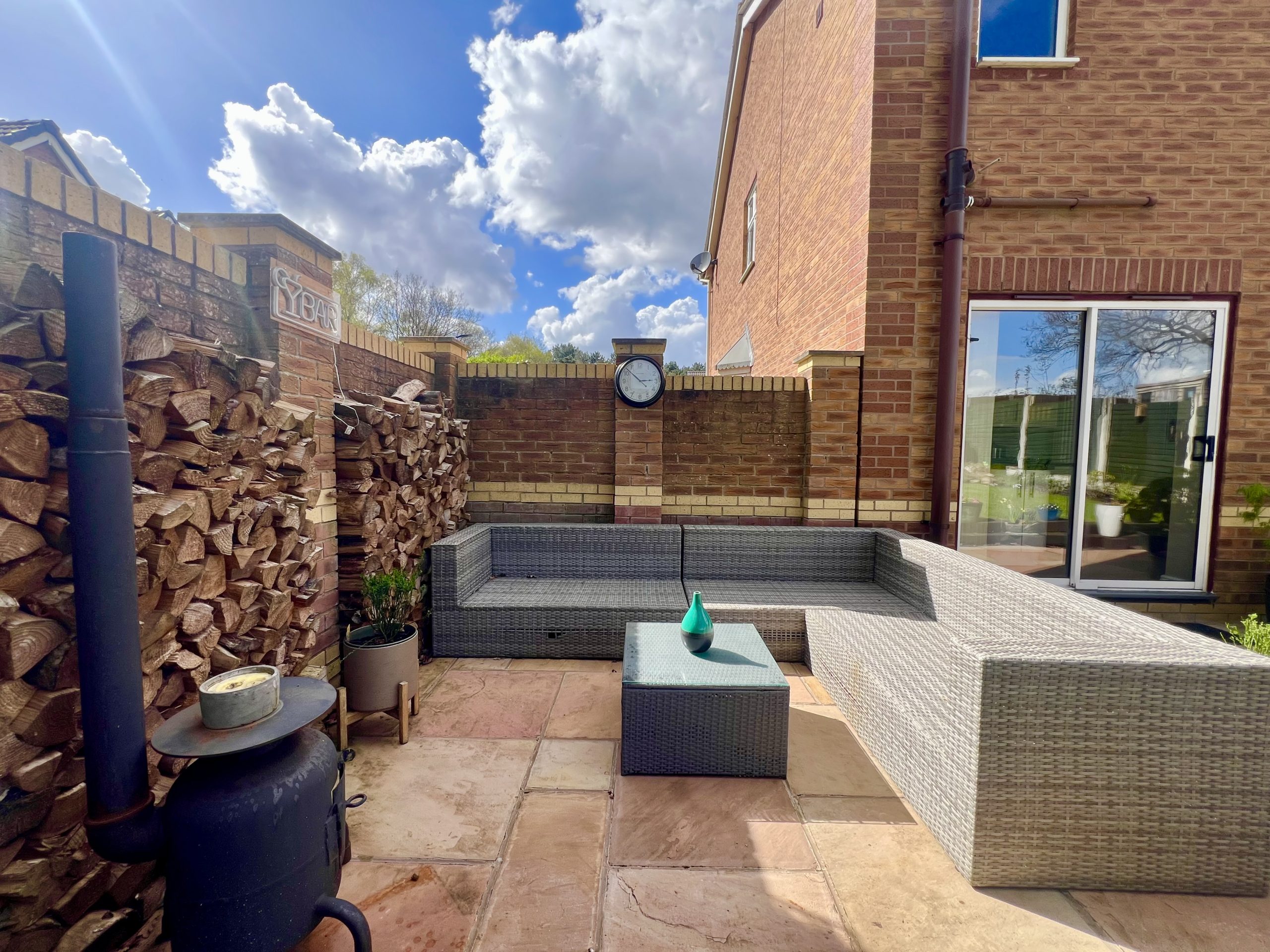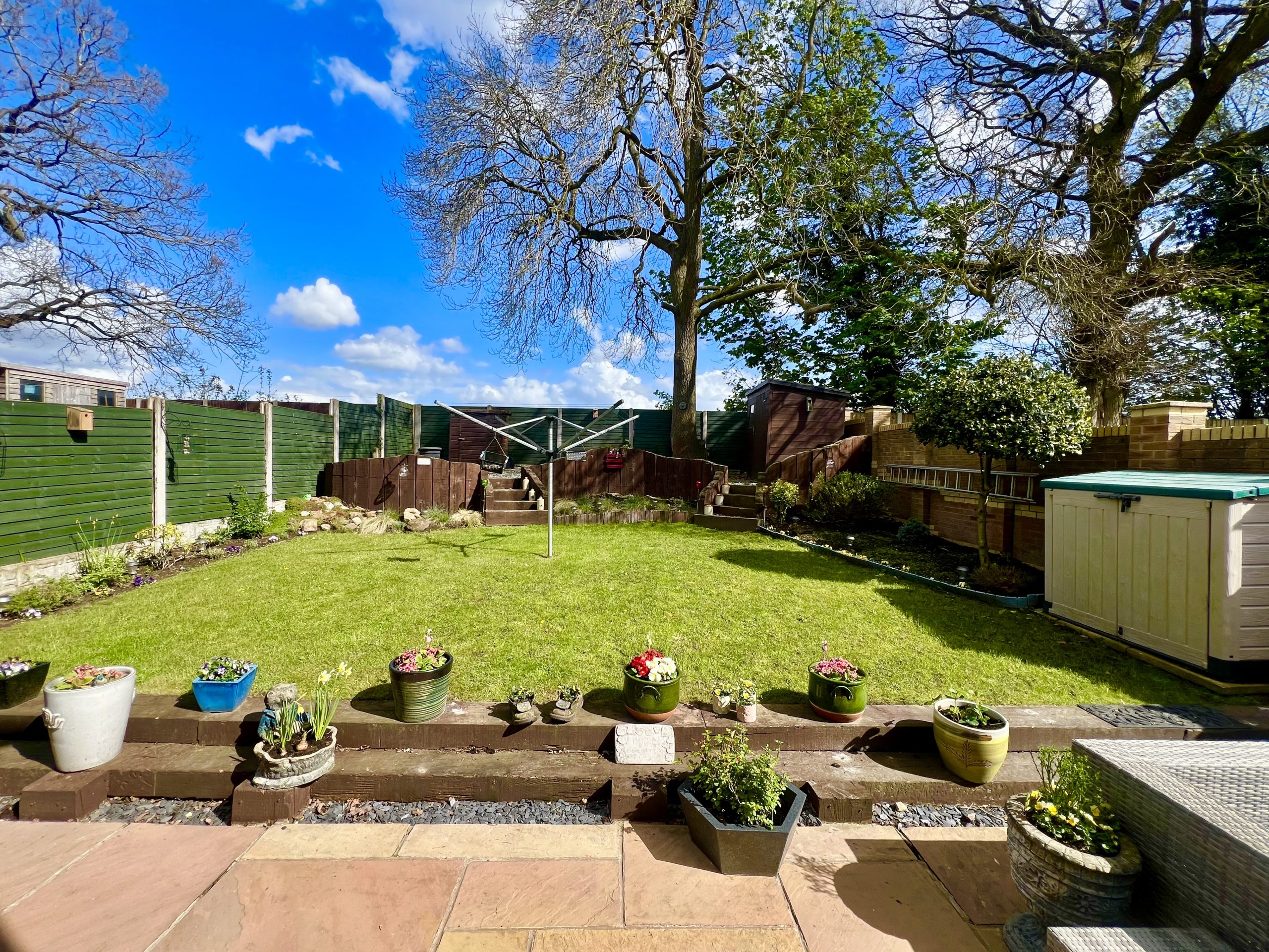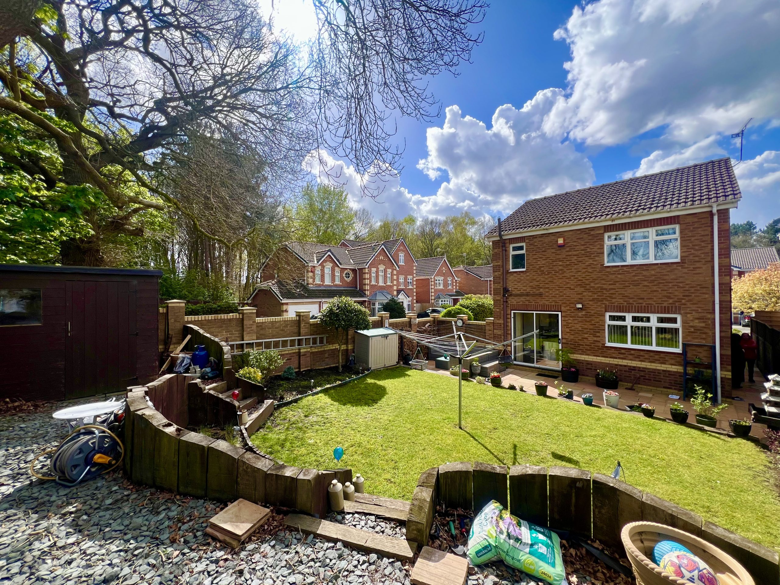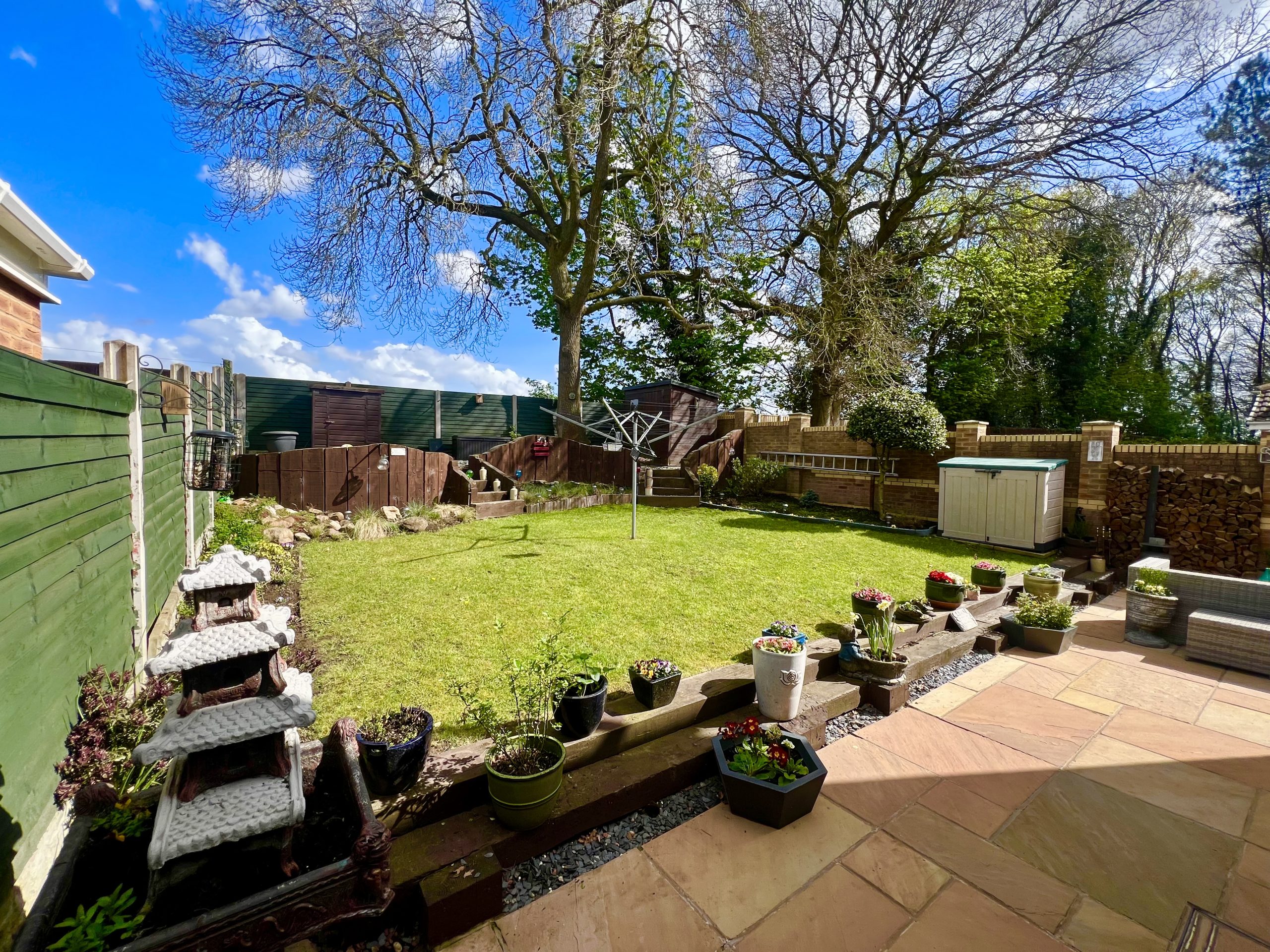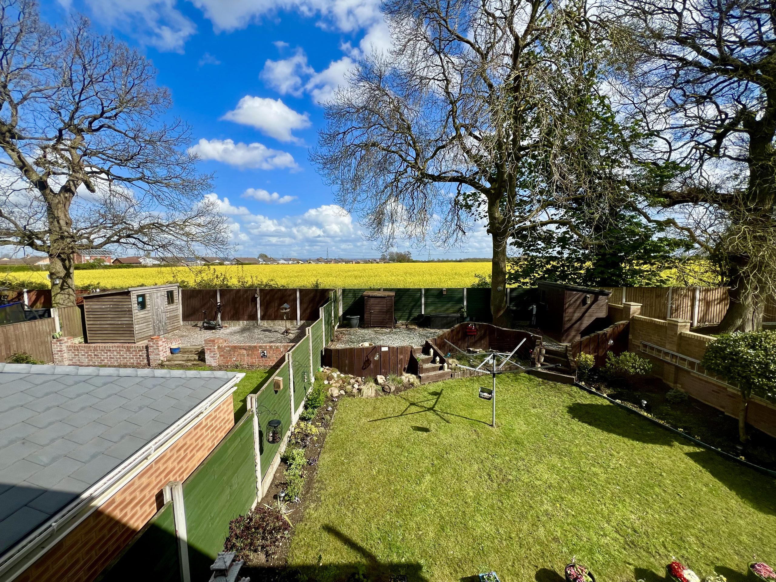 The private rear garden enjoys open views over adjoining fields and is attractively landscaped, featuring a patio seating area and a split-level lawn. The garden is further enhanced by mature shrubs and established planting, along with a useful storage shed, creating a well-appointed and peaceful outdoor setting.