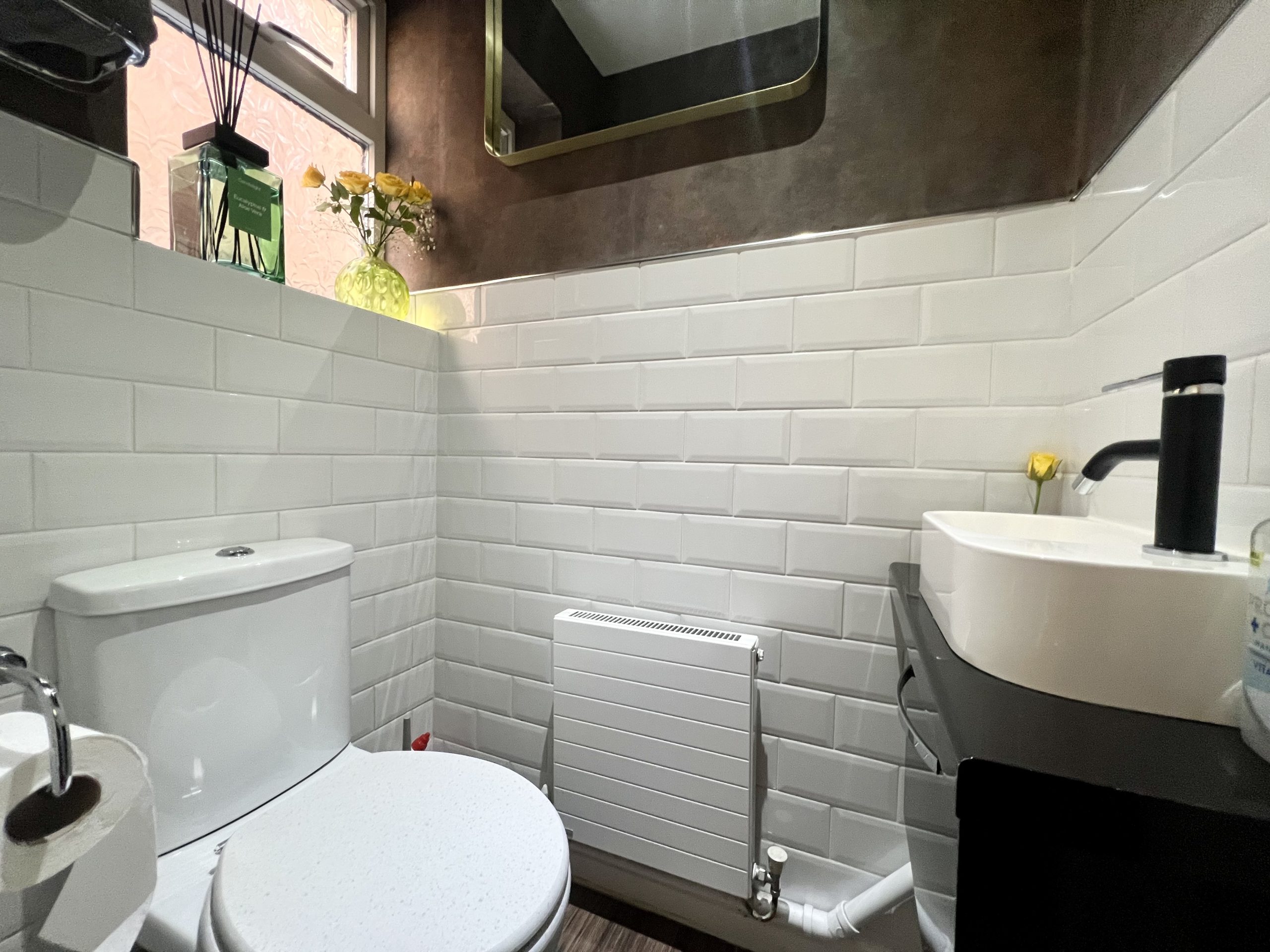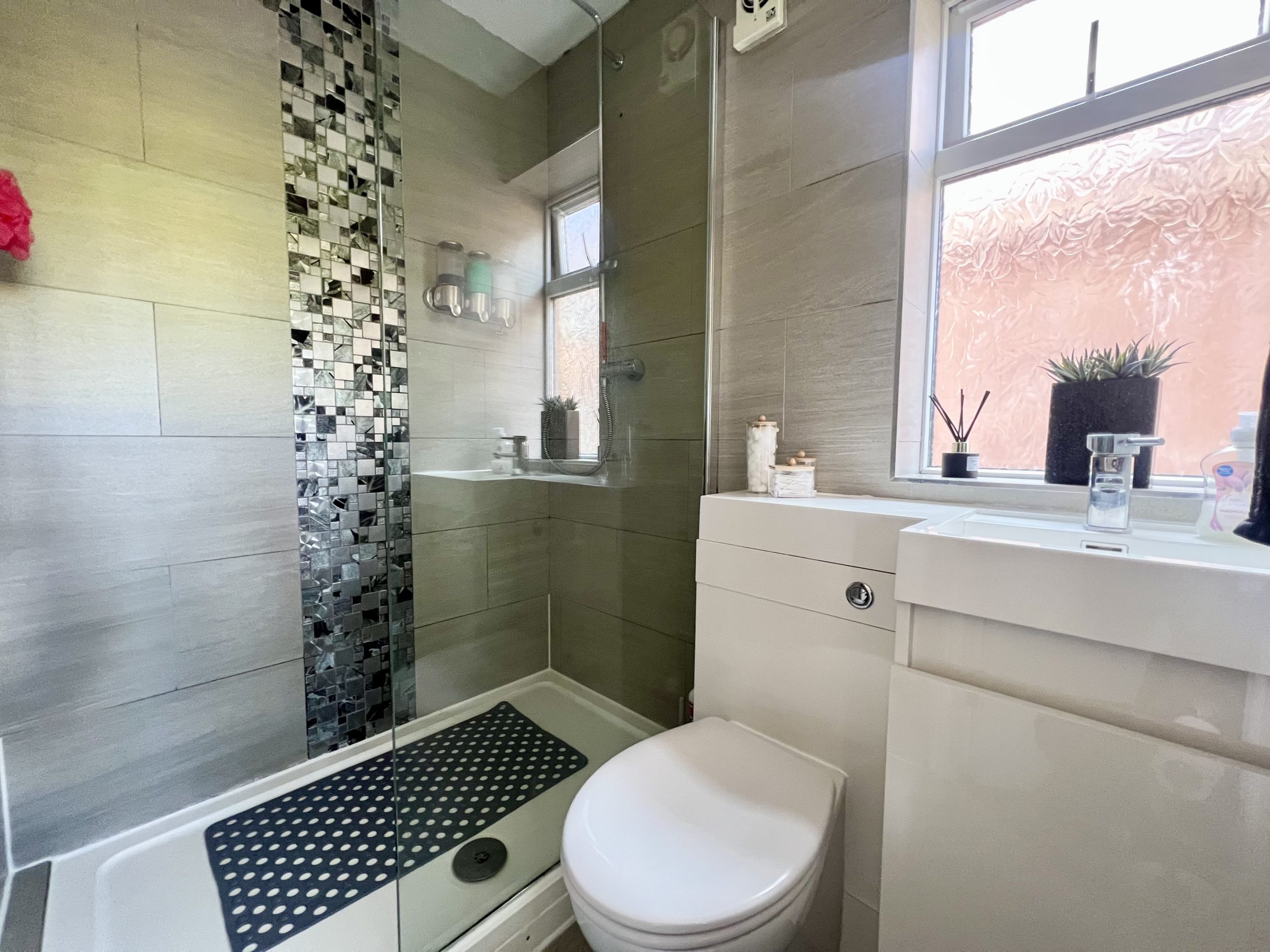 The en suite is fitted with a shower cubicle, WC, wash hand basin and a radiator. The space is fully tiled and benefits from inset spot lighting, along with a side-facing obscure window providing natural light while maintaining privacy.
