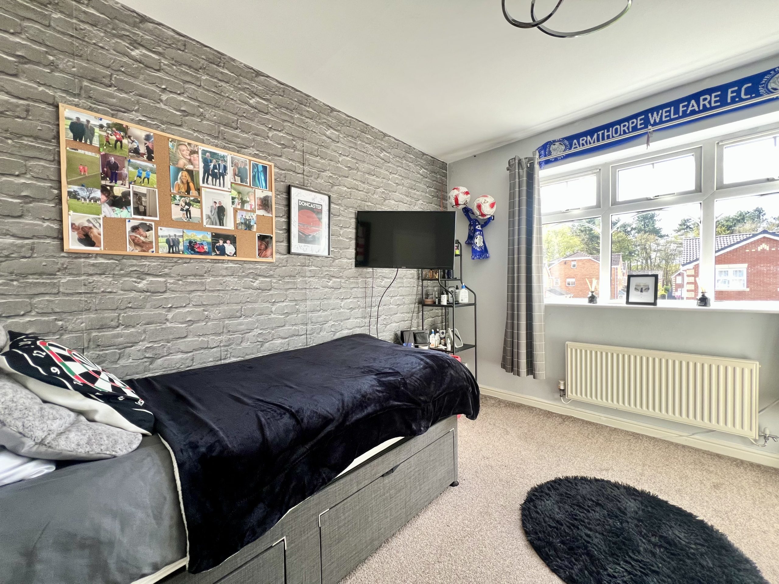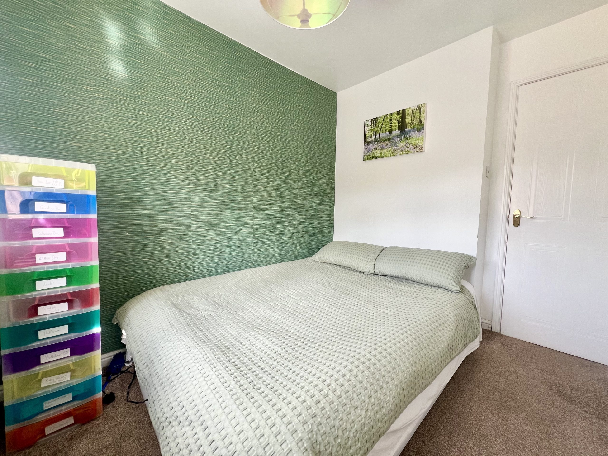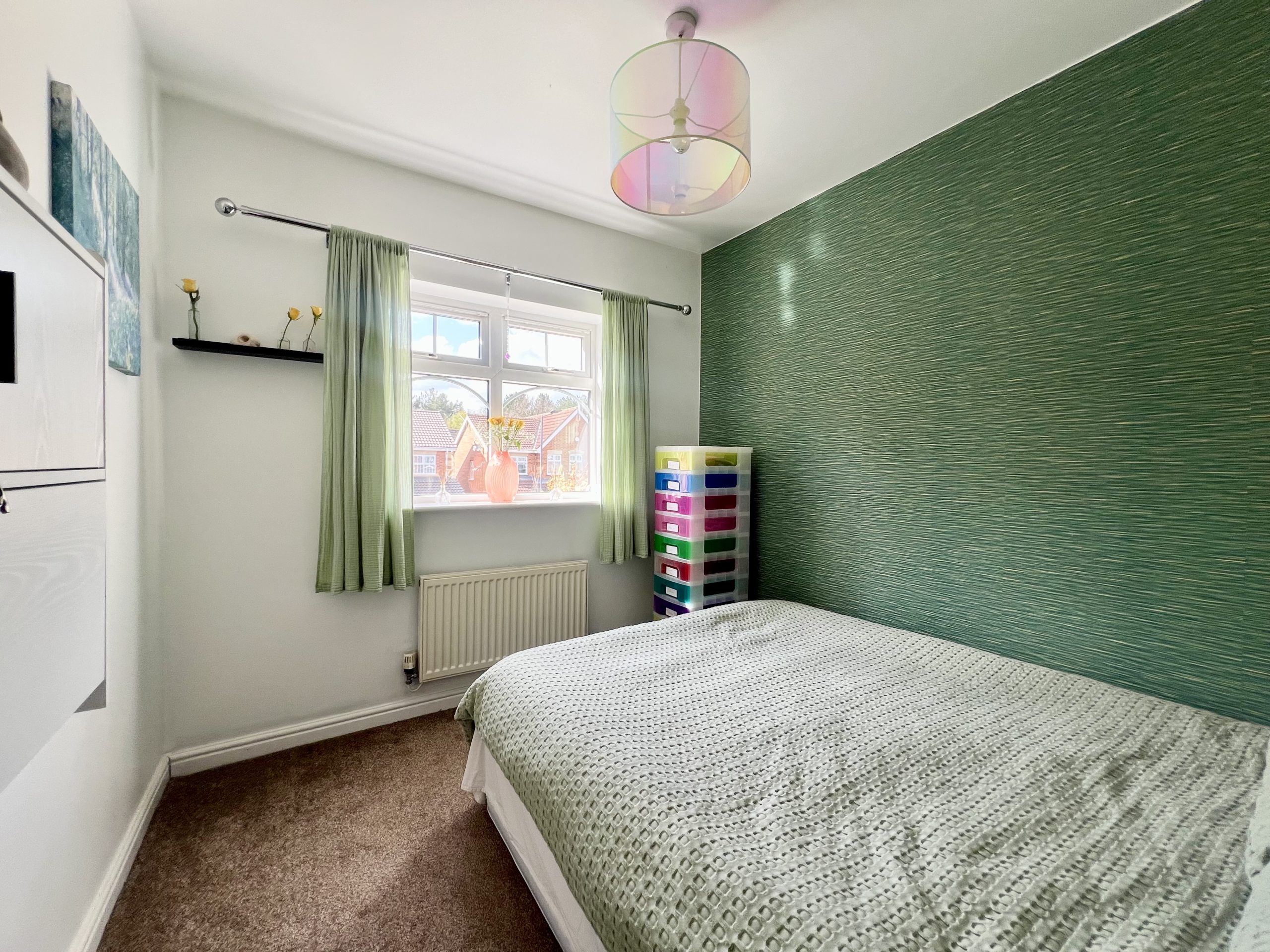 Bedroom Three is a well-proportioned double room, positioned to the front of the property. The room benefits from a front-facing window, carpeted flooring, a radiator, and a single pendant light fitting.