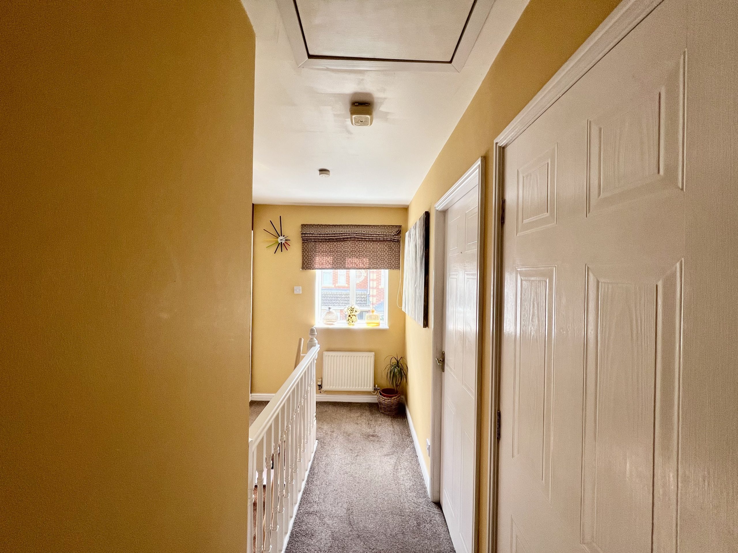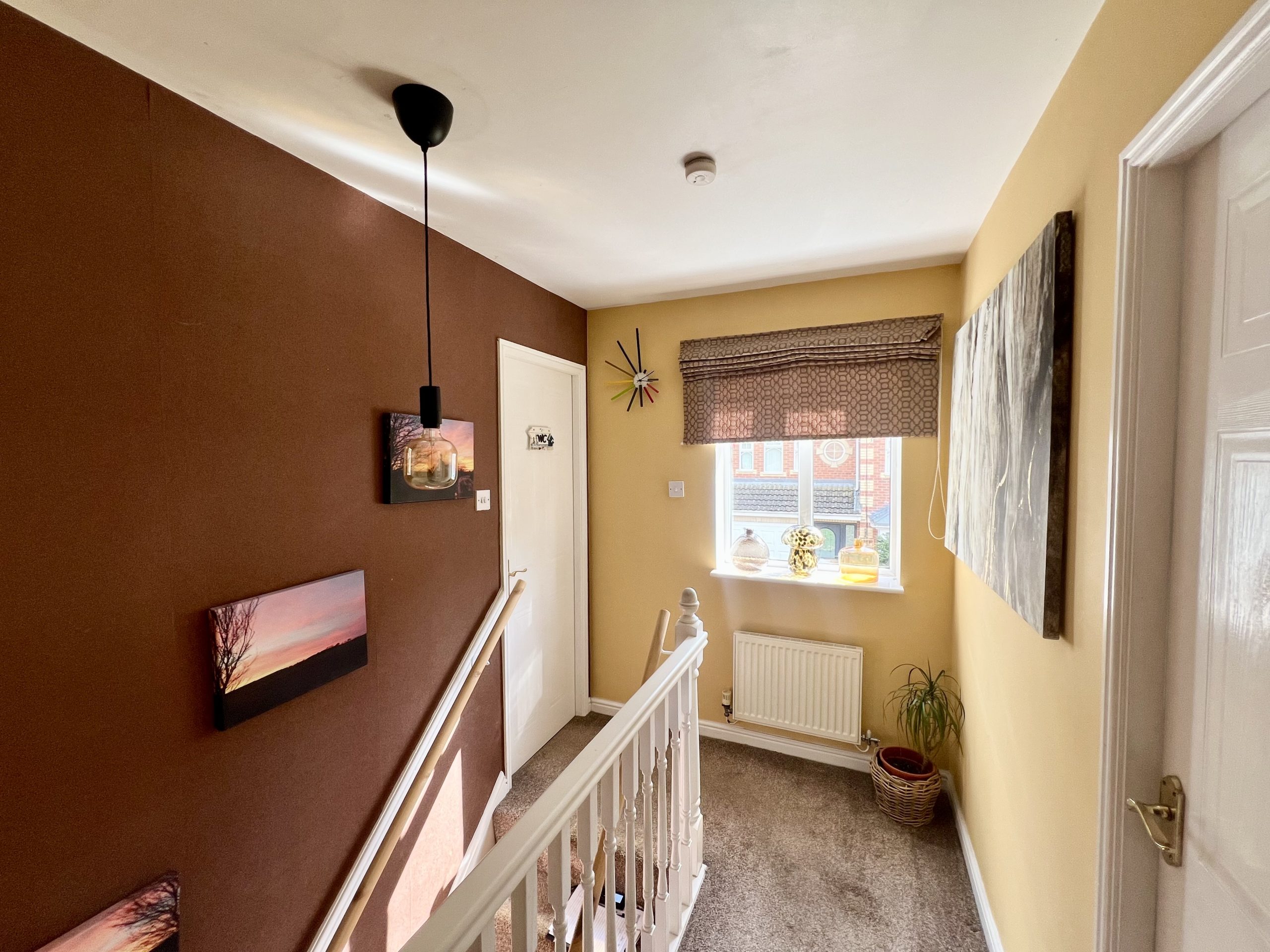The first-floor landing is light and spacious, providing access to the family bathroom and three well-proportioned double bedrooms. The area is finished with carpeted flooring, a single pendant light fitting, and a radiator, while a side-facing window allows for excellent natural light, enhancing the sense of openness.