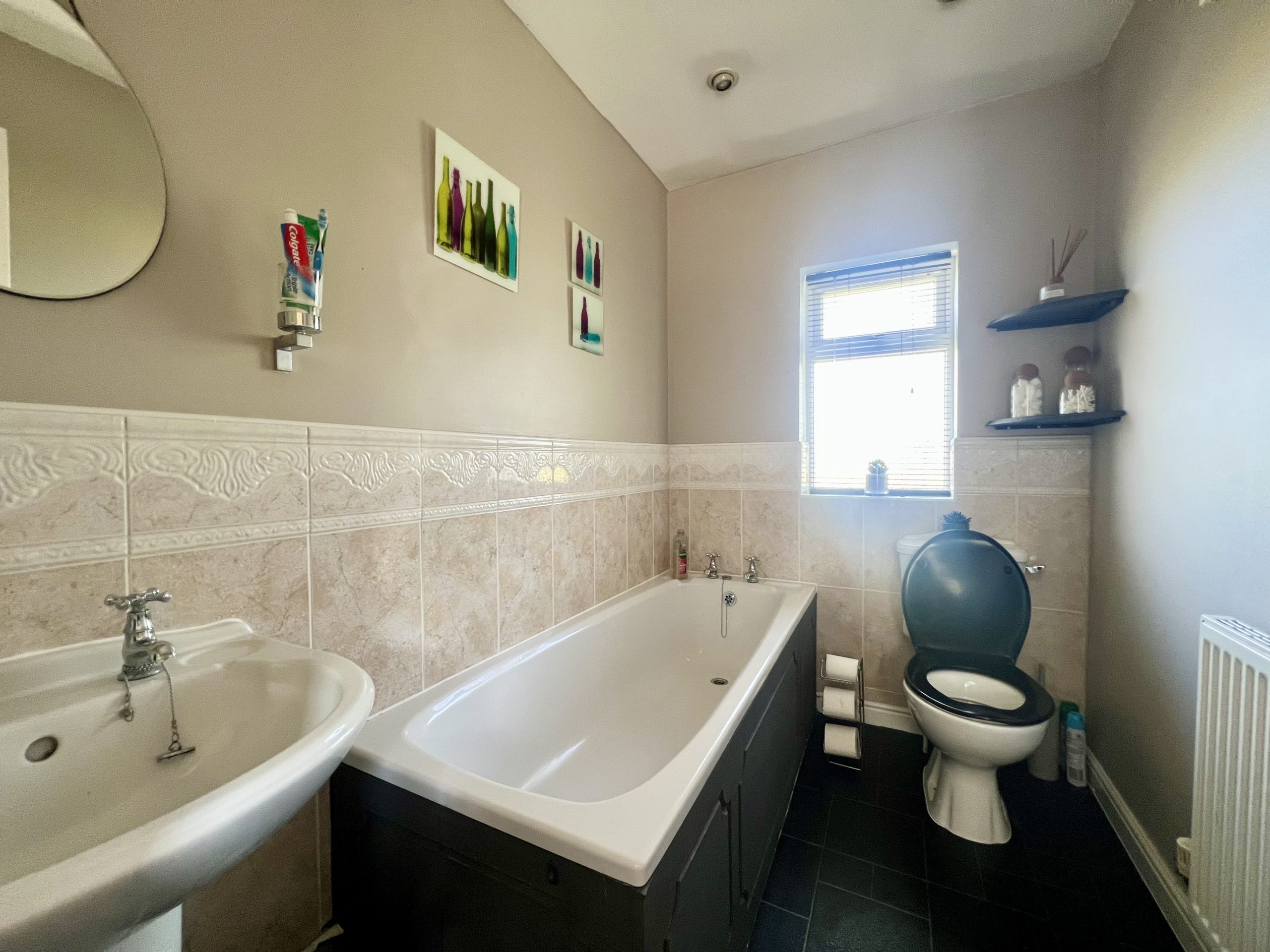 The family bathroom is located to the rear of the property and is fitted with a panelled bath, wash hand basin, and WC. The room benefits from an obscure rear-facing window providing natural light while maintaining privacy, along with inset spot lighting, a radiator, and wood-effect flooring.