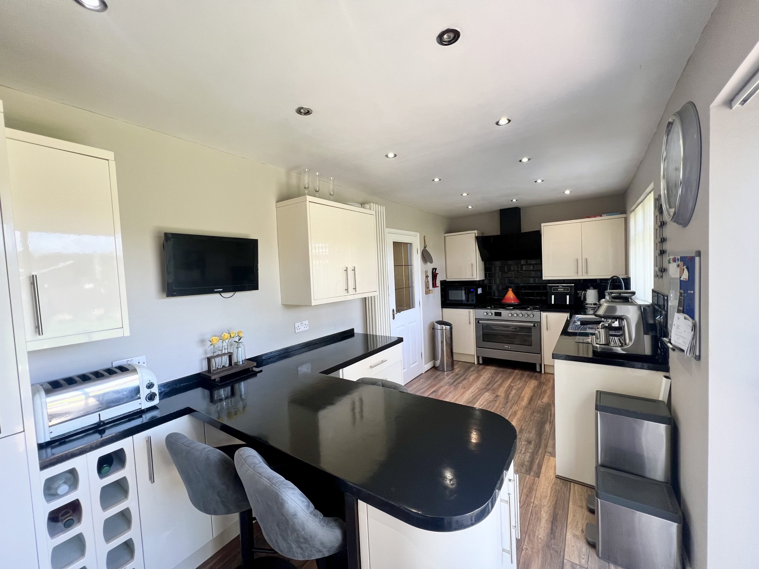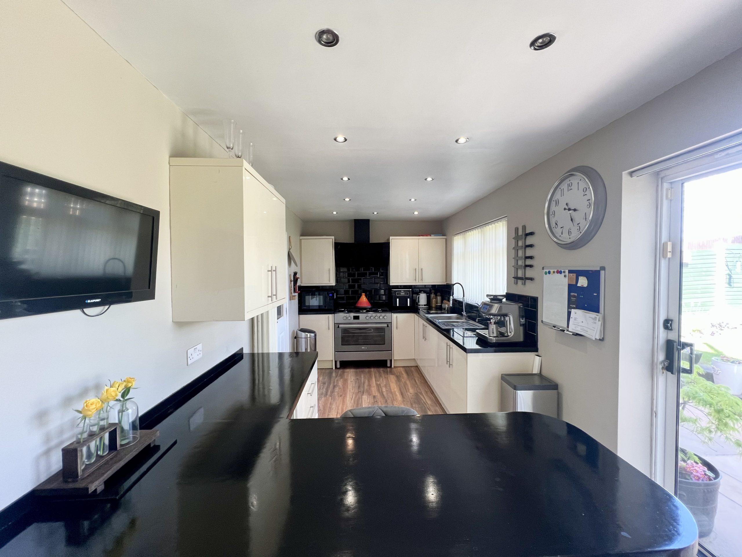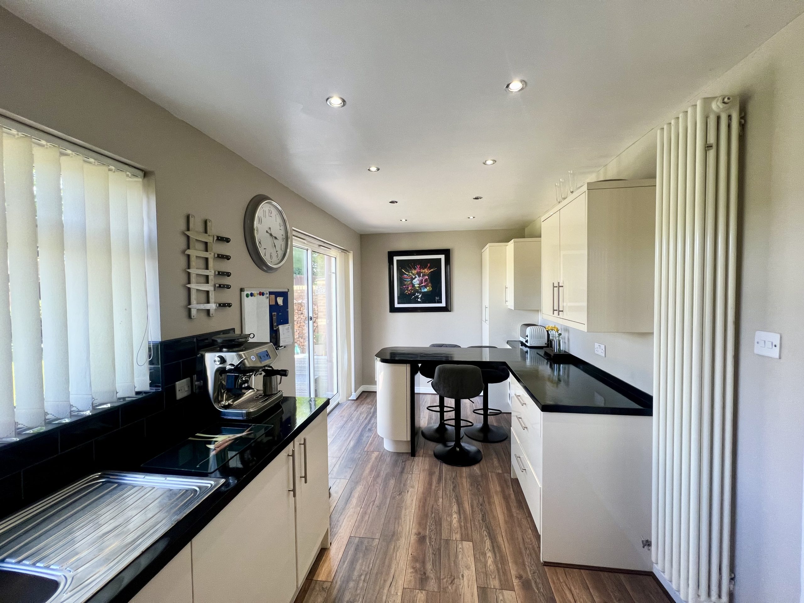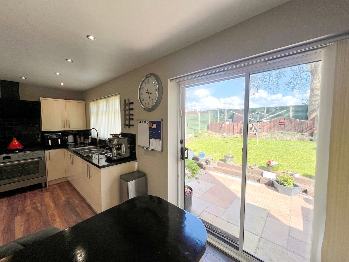 The kitchen/diner is positioned to the rear of the property, enjoying views over the private garden. The space benefits from French doors opening onto a patio area, together with a rear-facing window, allowing for excellent levels of natural light. The kitchen is comprehensively fitted with a range of high-quality wall and base units, complemented by contrasting work surfaces, and incorporates a selection of integrated appliances, including a dishwasher, fridge/freezer, oven, and hob. Further features include inset spot lighting, a radiator, and a breakfast bar, providing an ideal space for informal dining and everyday family living.