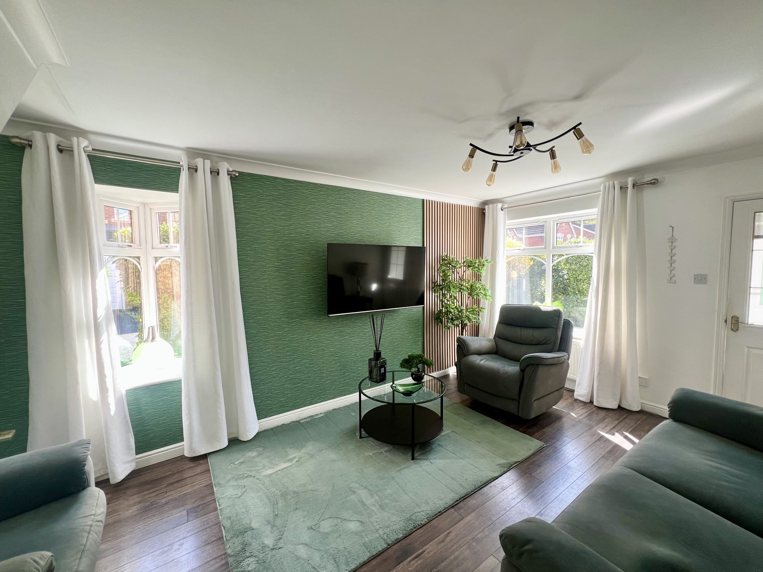 The porch leads through to a spacious and well-lit lounge, benefitting from continued wood-effect flooring, which enhances the sense of continuity. The room features two windows—one to the front and one to the side elevation—allowing for an abundance of natural light. Additional features include a single pendant light fitting and a radiator.