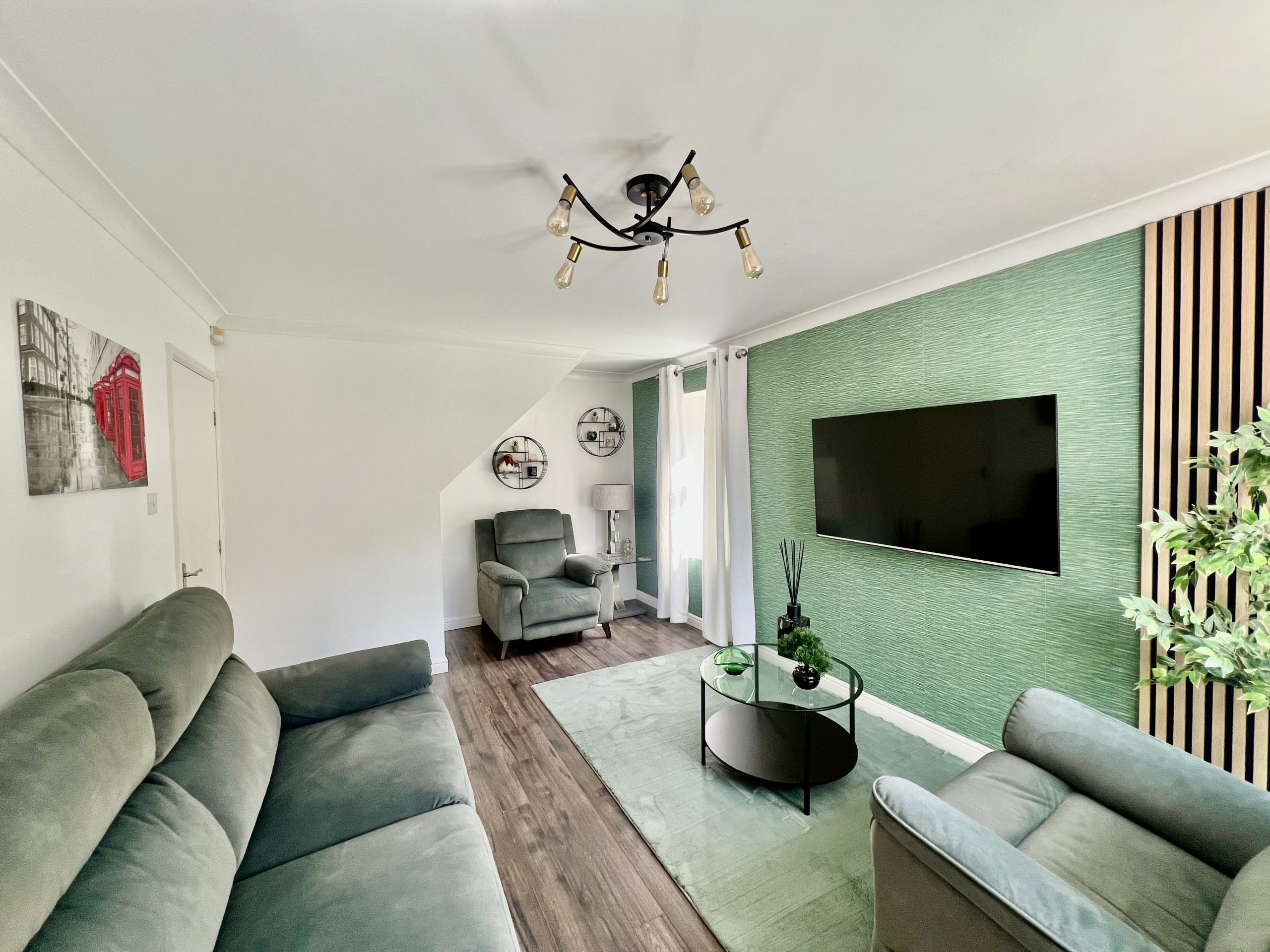 Upon entering the property, you are welcomed into a well-appointed entrance porch, providing a practical space for the storage of coats and footwear. The area features a side-facing window, a radiator, and wood-effect flooring, which continues seamlessly into the lounge, creating a cohesive and stylish finish.
