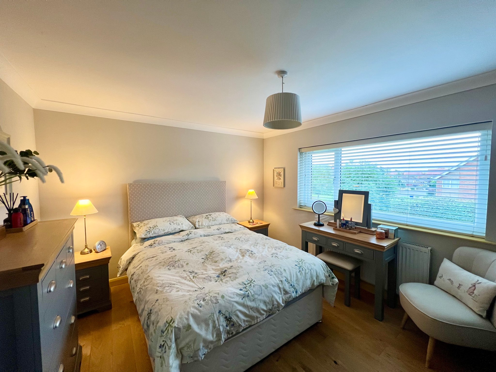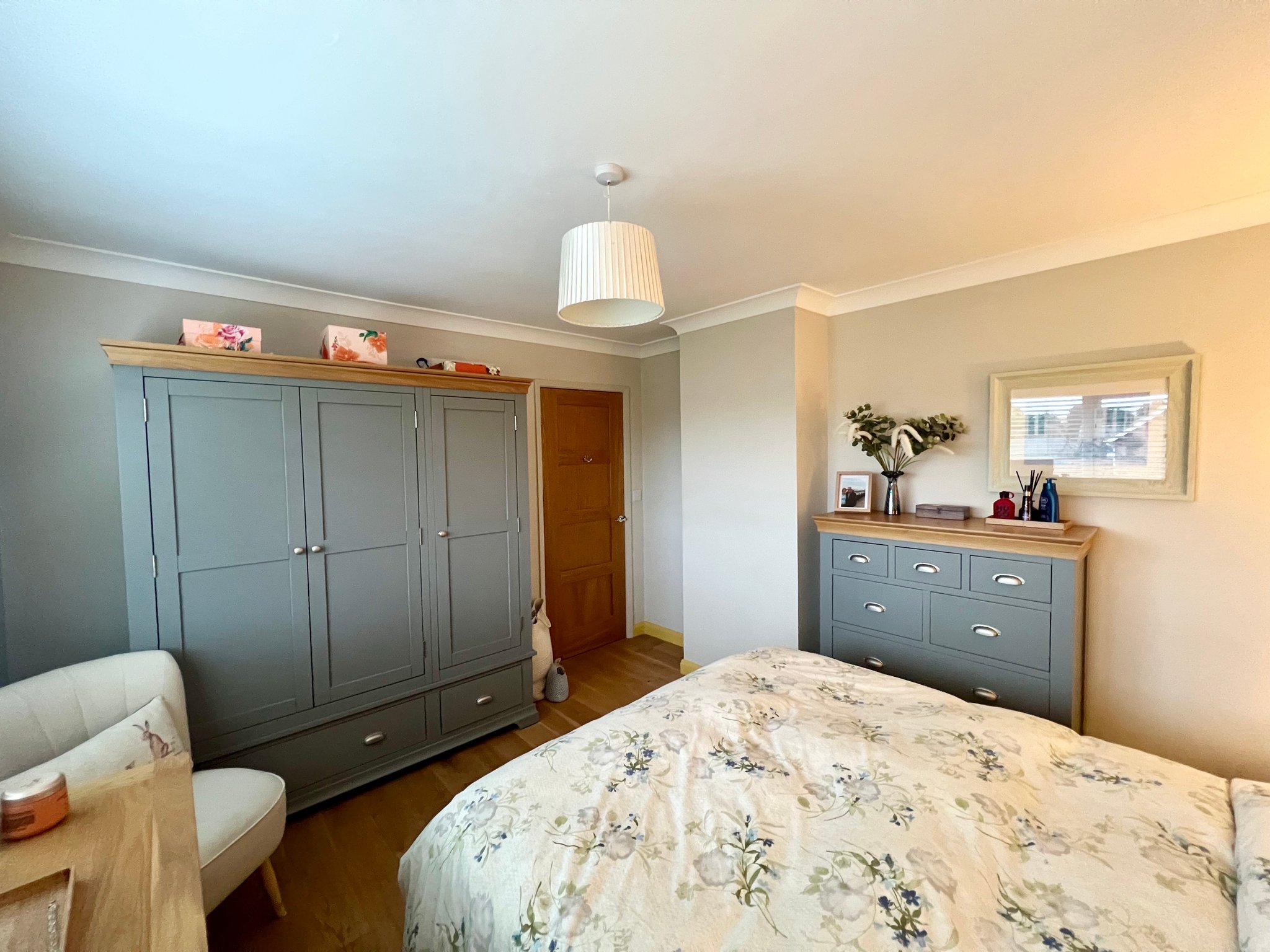 Located at the front of the property, the principal bedroom enjoys a large window overlooking the street, allowing plenty of natural light to fill the space. Finished with wooden flooring and a central pendant light fitting, this generously sized room offers a calm and comfortable retreat.