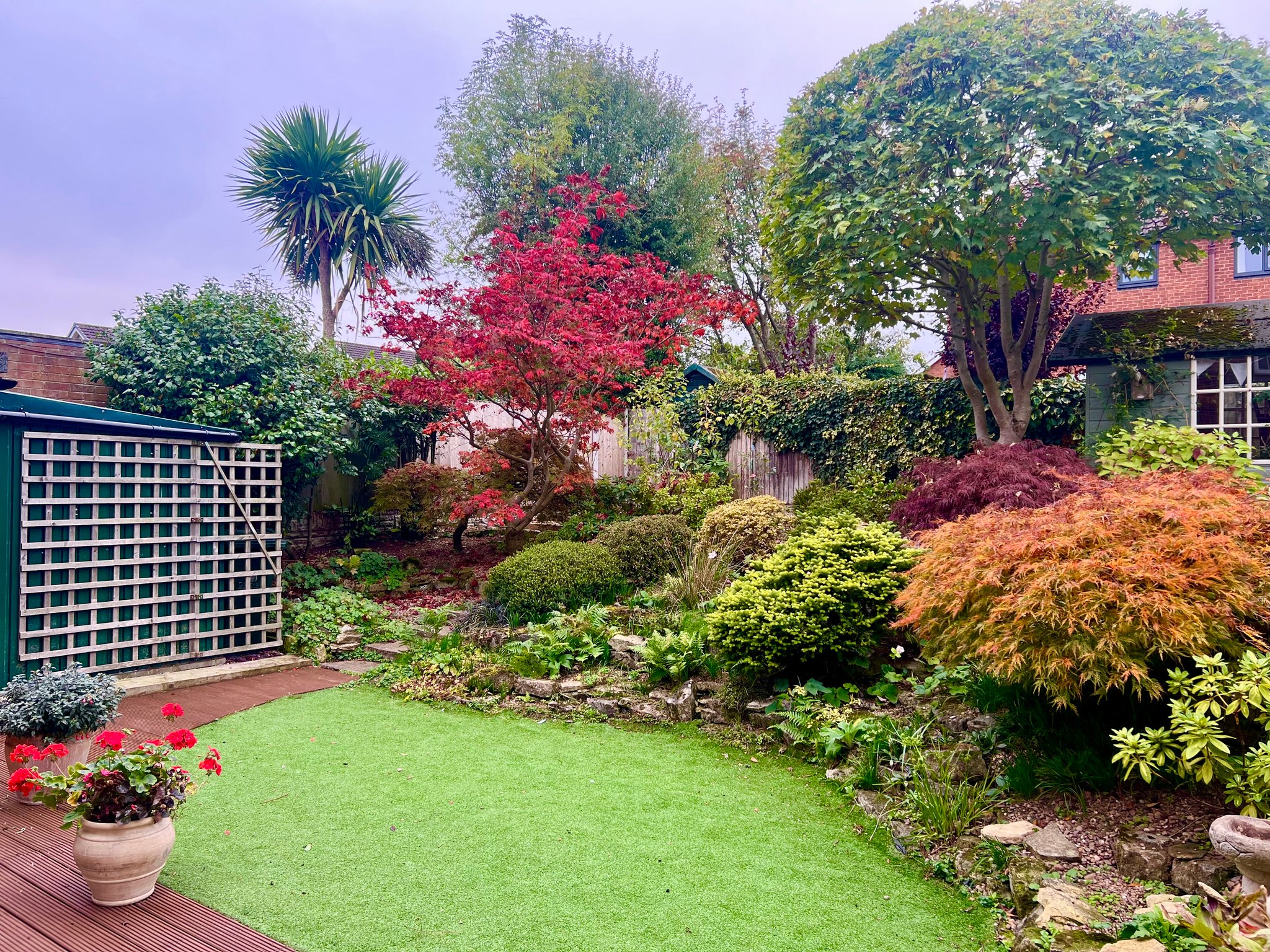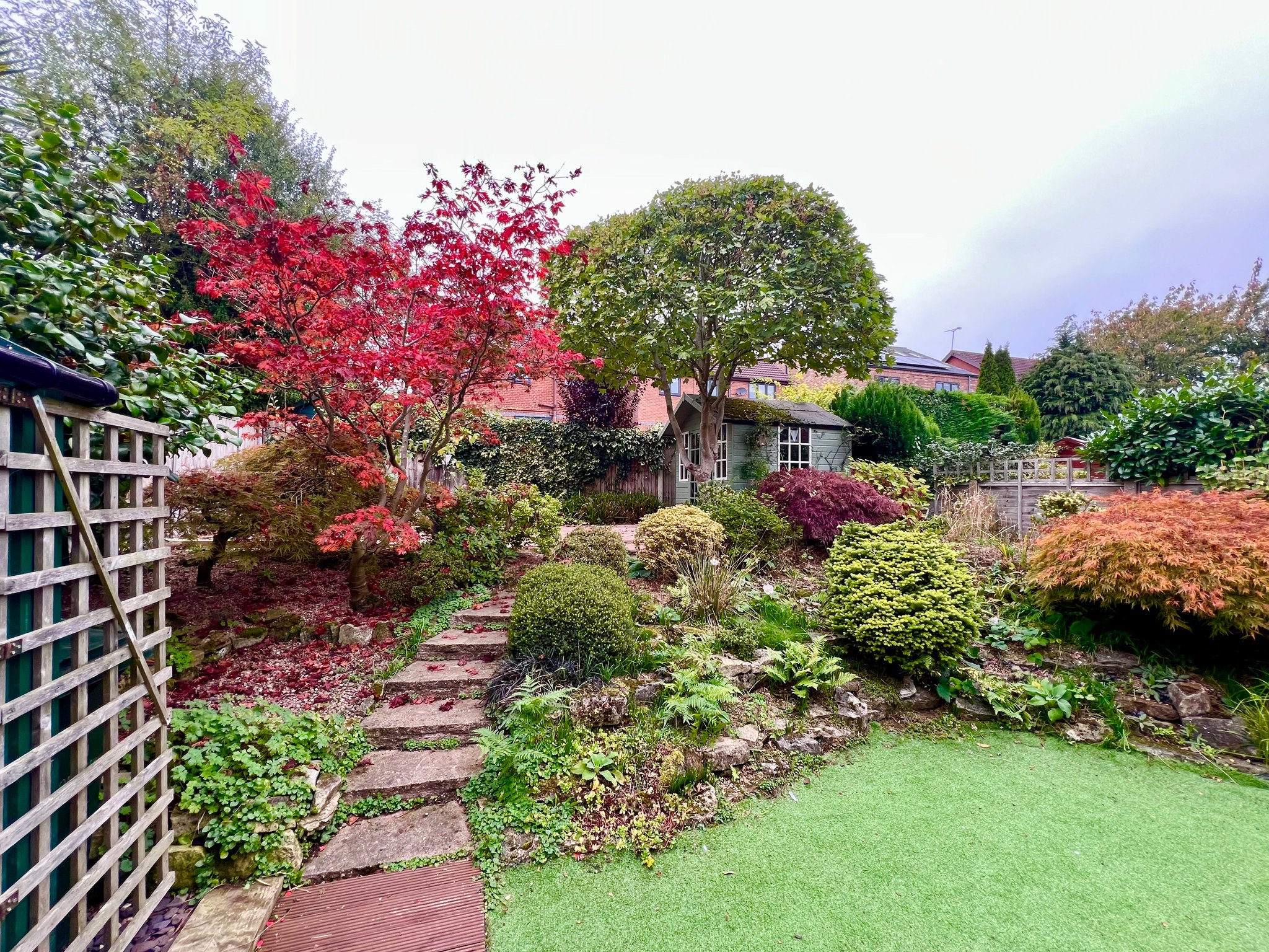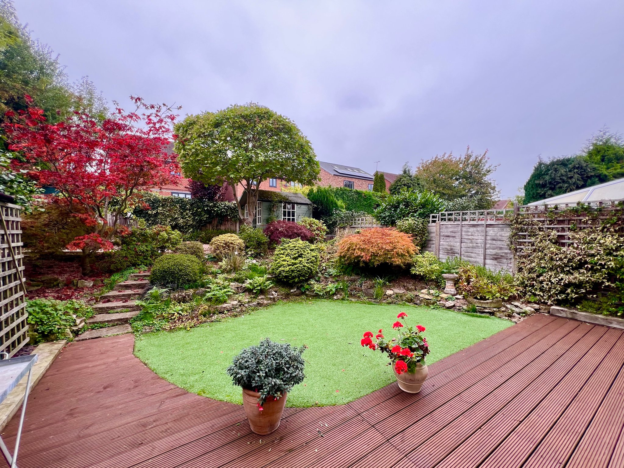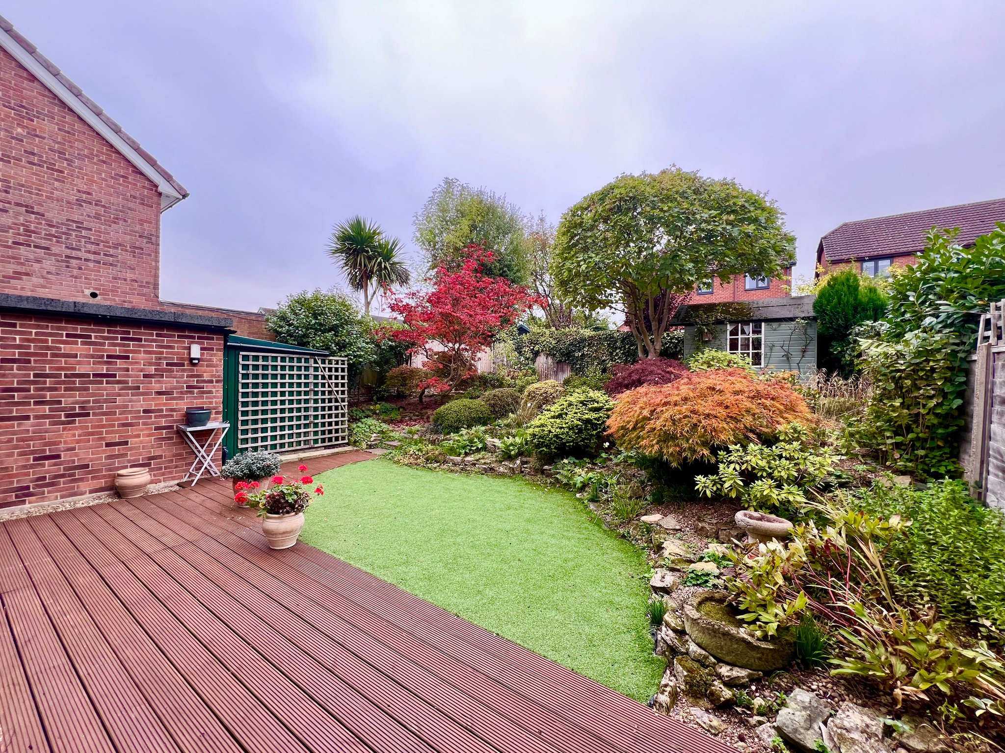 The rear of the property is beautifully landscaped, featuring a decking area just outside the French doors from the kitchen—perfect for outdoor dining and entertaining. The garden includes low-maintenance astro turf, providing a green space that can be enjoyed all year round. Shrubs and bushes add natural beauty, while a pathway leads to an elevated patio area with a summer house that is suitable for use throughout the seasons.
