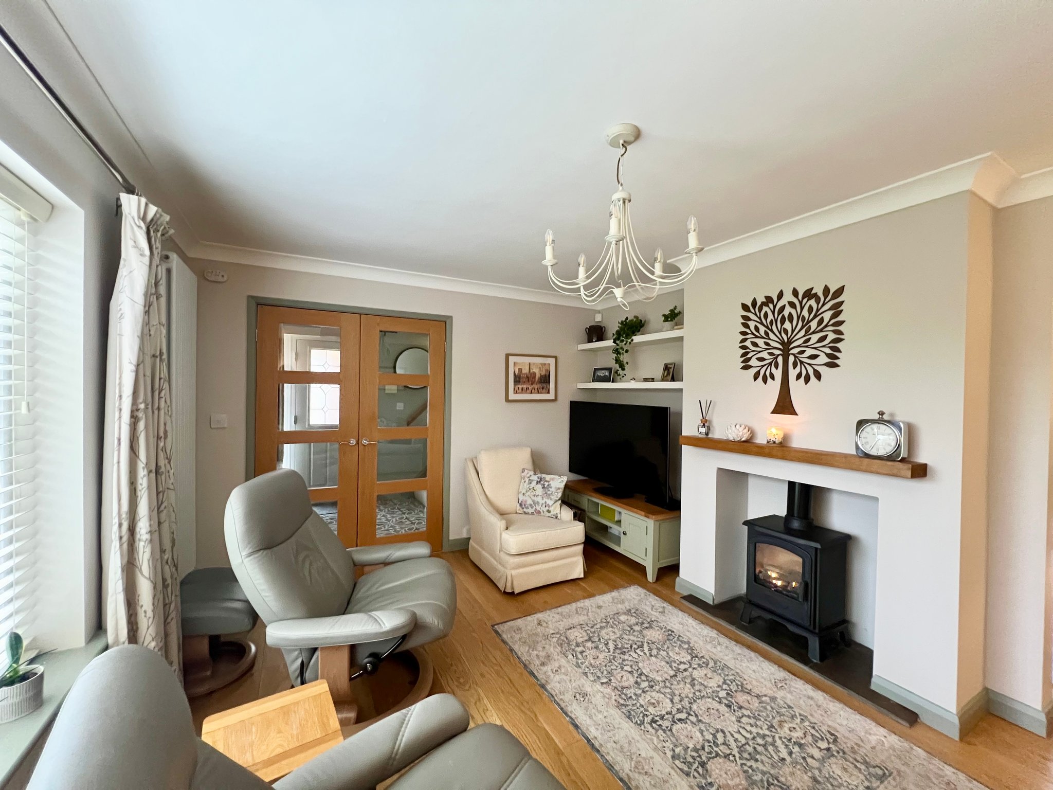 The bright and inviting lounge features a large front-facing window that floods the space with natural light. The room is finished with stylish wooden flooring throughout and a central gas fire that adds both warmth and charm, creating a cosy yet elegant atmosphere. A pendant light fitting complements the space, and there is direct access through to the open-plan kitchen and dining area, making it ideal for both relaxing and entertaining.