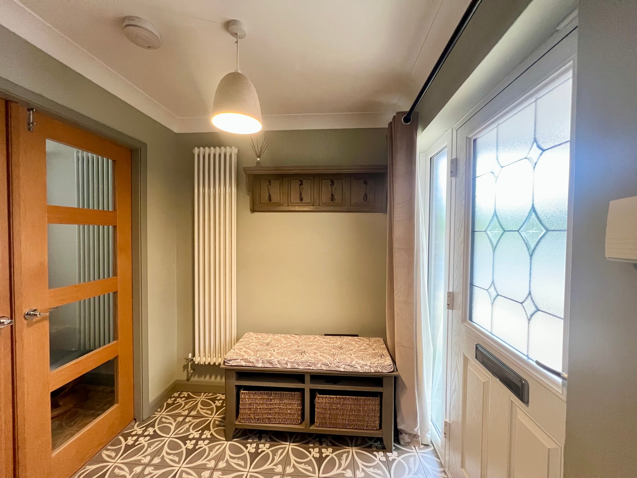Conveniently located just off the kitchen, the downstairs WC is a practical addition to the home. It features a wash basin, toilet, and a compact radiator, all set within a neatly finished space—ideal for guests or busy family life.