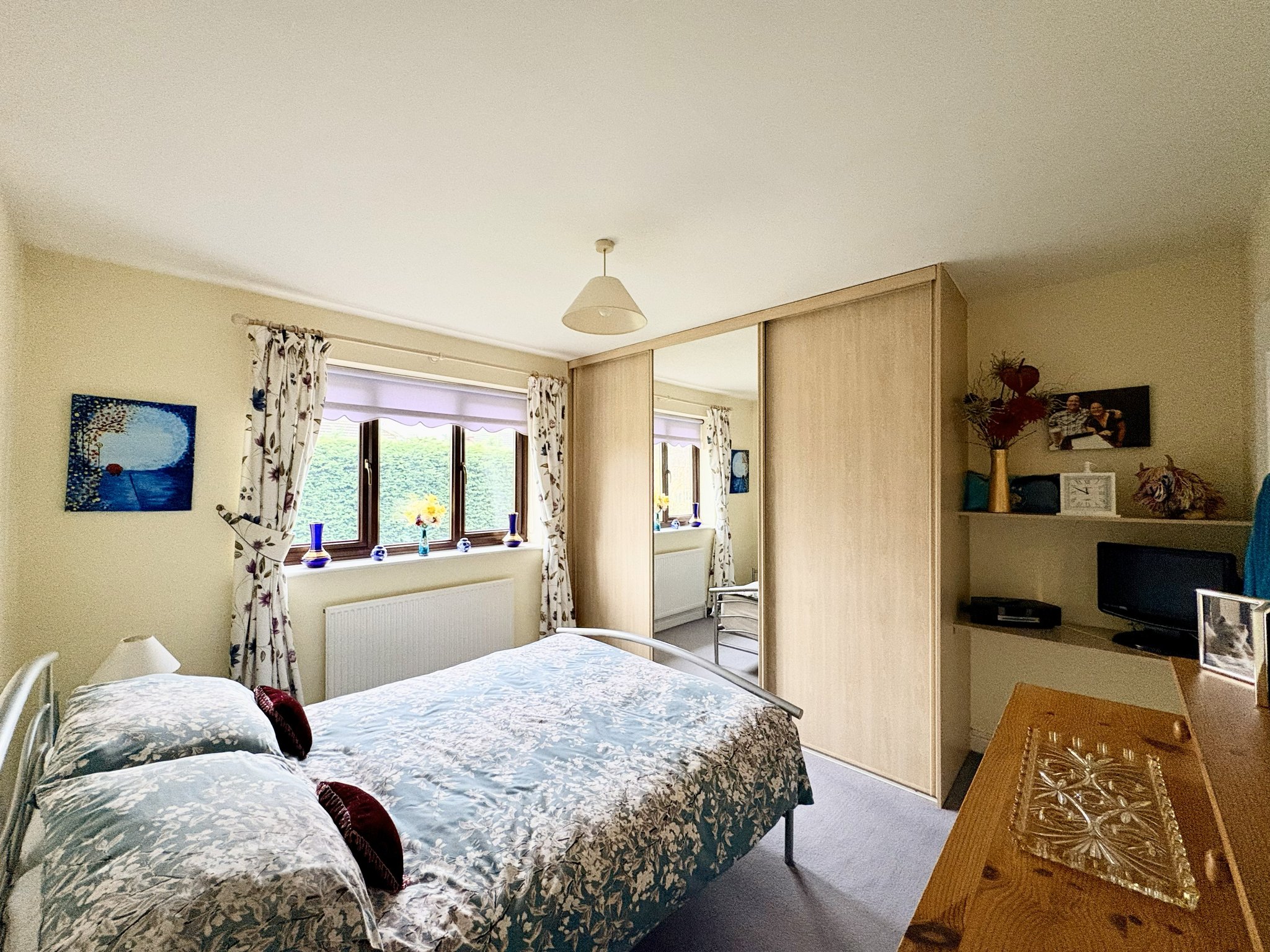 Bedroom Two is a double room with front-aspect window, fitted wardrobes, carpeted flooring, radiator and single pendant light fitting.