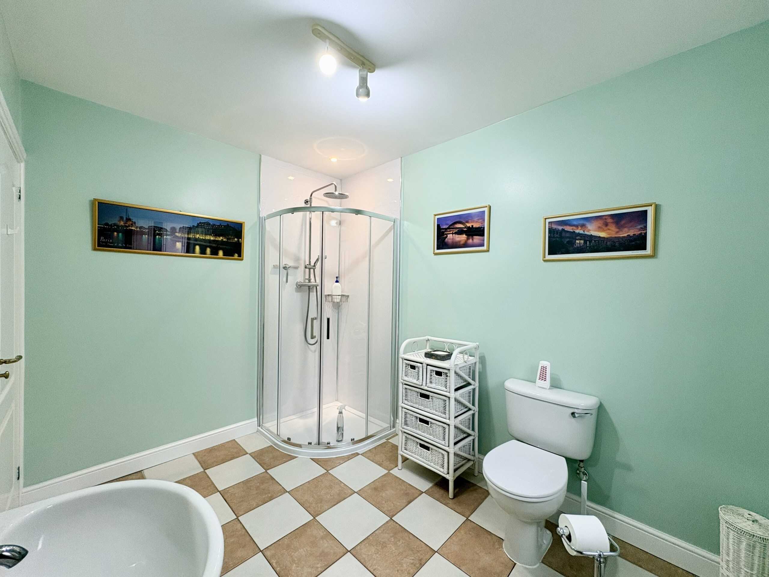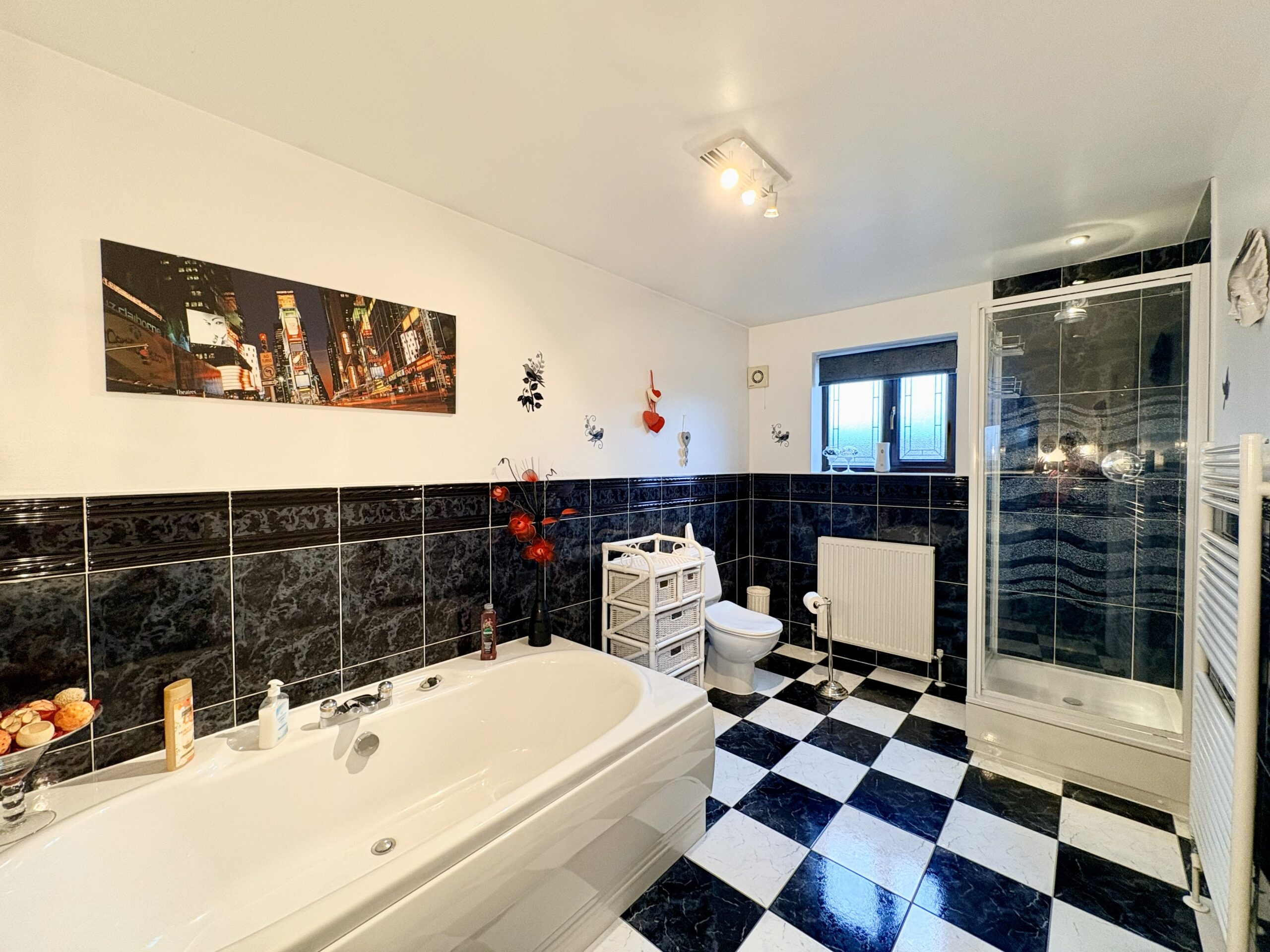 The spacious family bathroom is part tiled and fitted with a white suite comprising a bath, walk-in shower, hand basin and WC. Finished with tiled flooring, rear-aspect obscure window, heated towel rail and single pendant light fitting.
