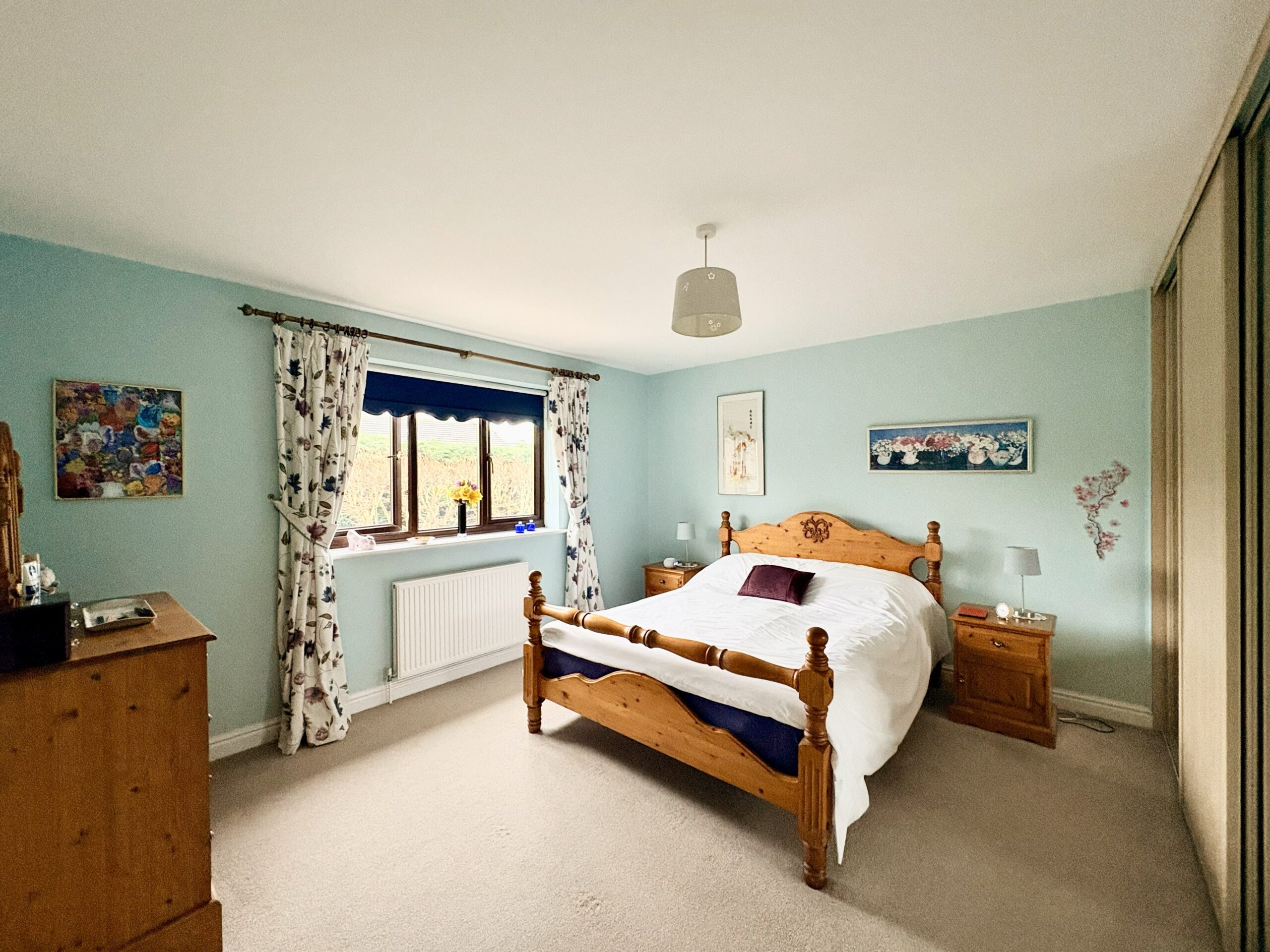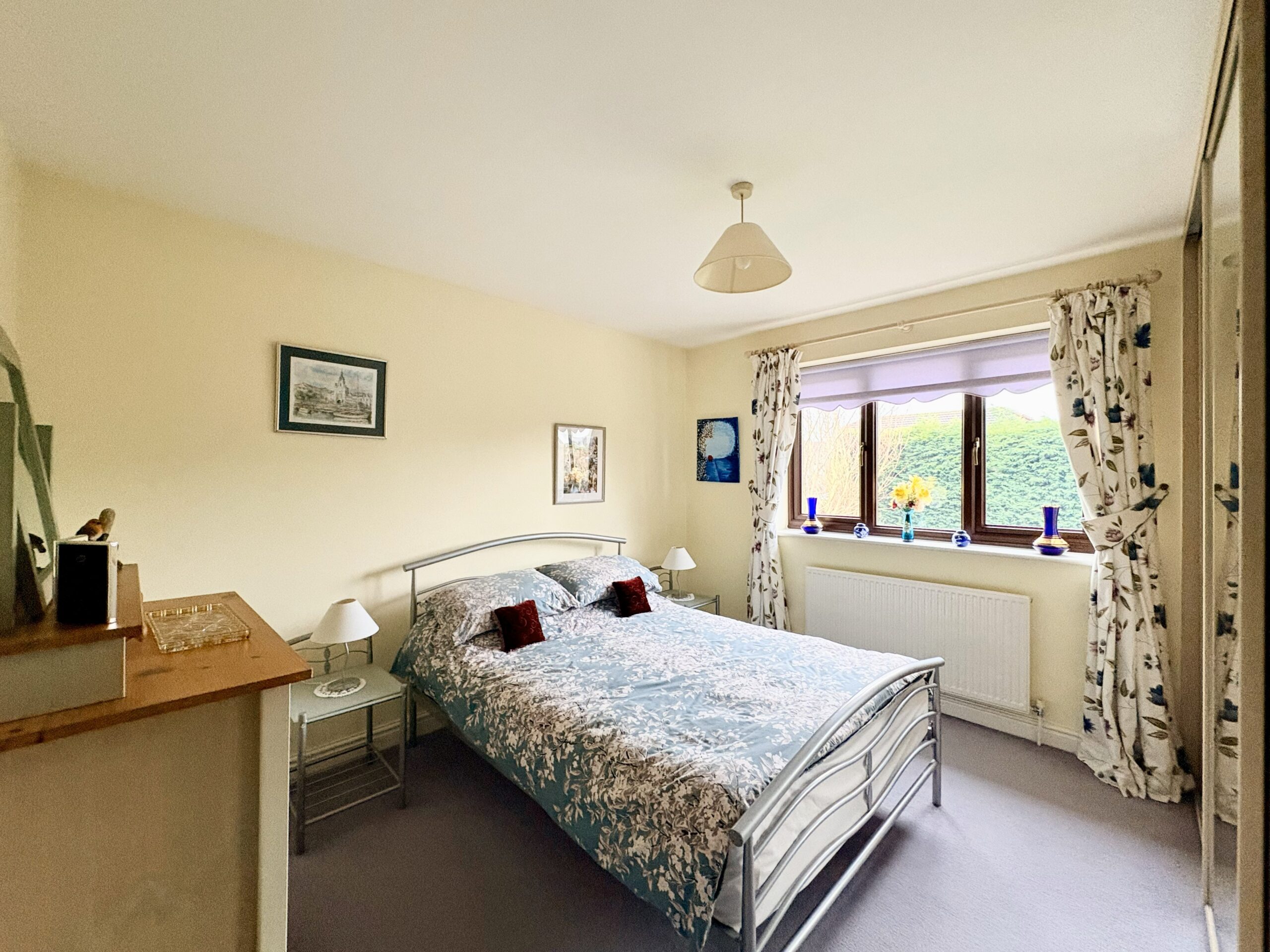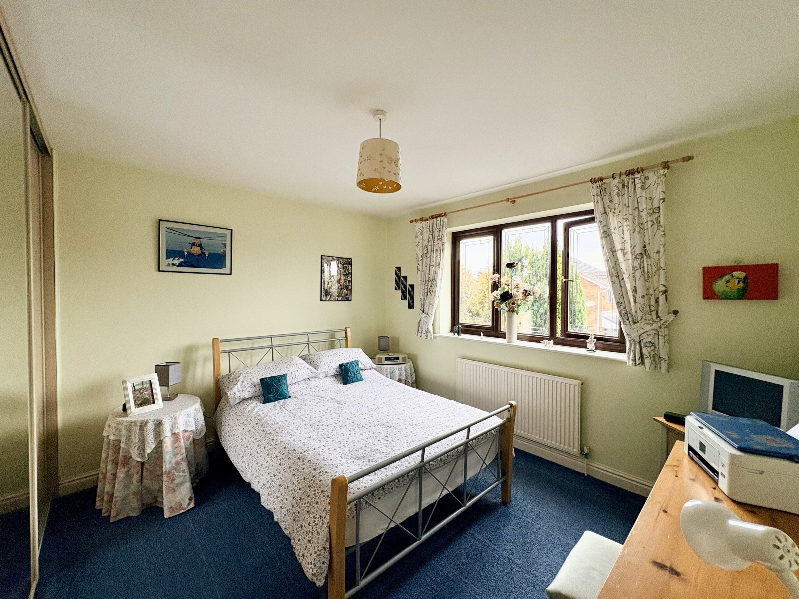 The principal bedroom is a generous double room with rear-aspect window, fitted wardrobes, carpeted flooring, radiator and single pendant light fitting. A door leads to a spacious ensuite, comprising a walk-in shower, hand basin and WC, with rear-aspect window, radiator, tiled flooring and single pendant light fitting.