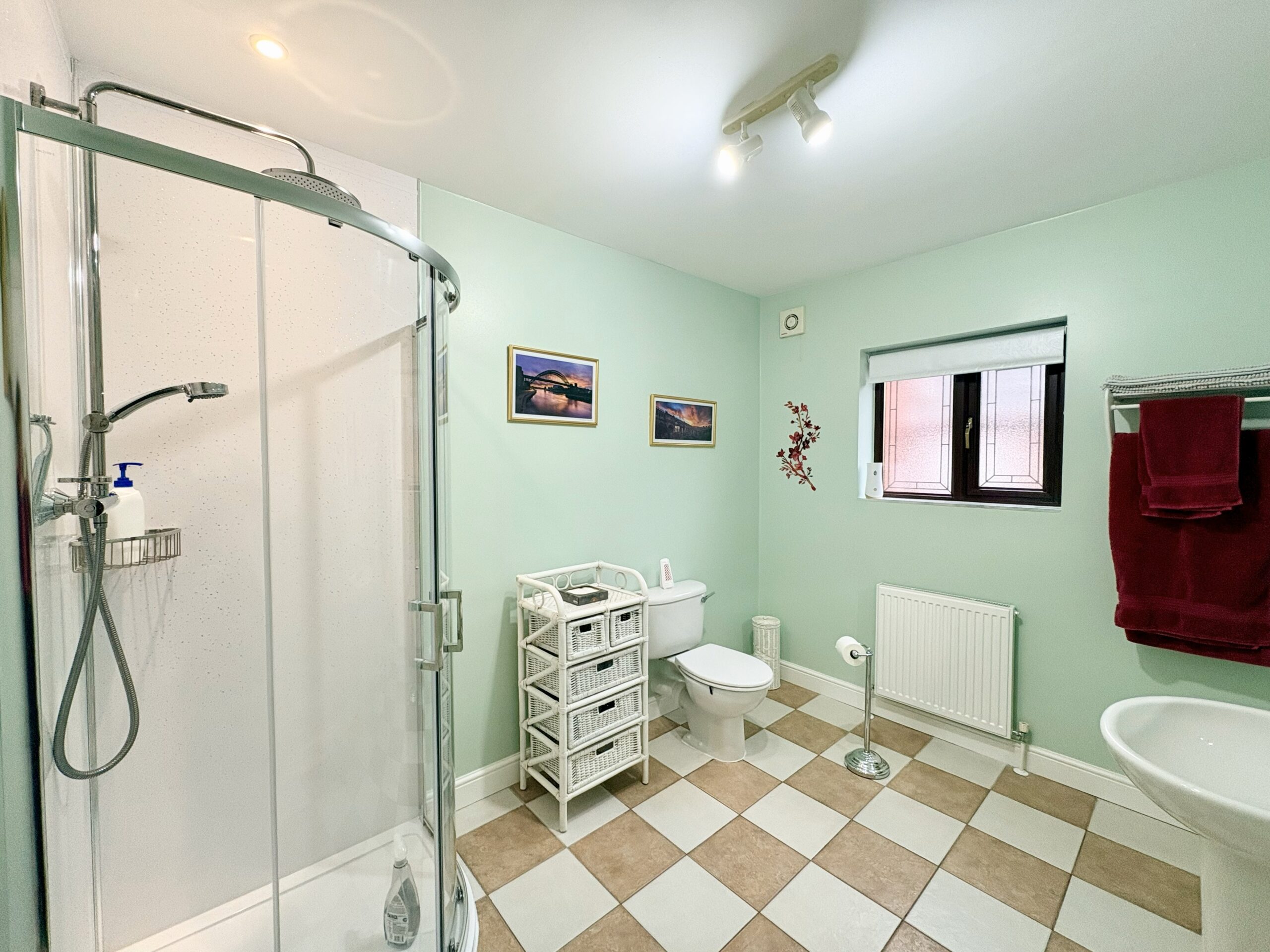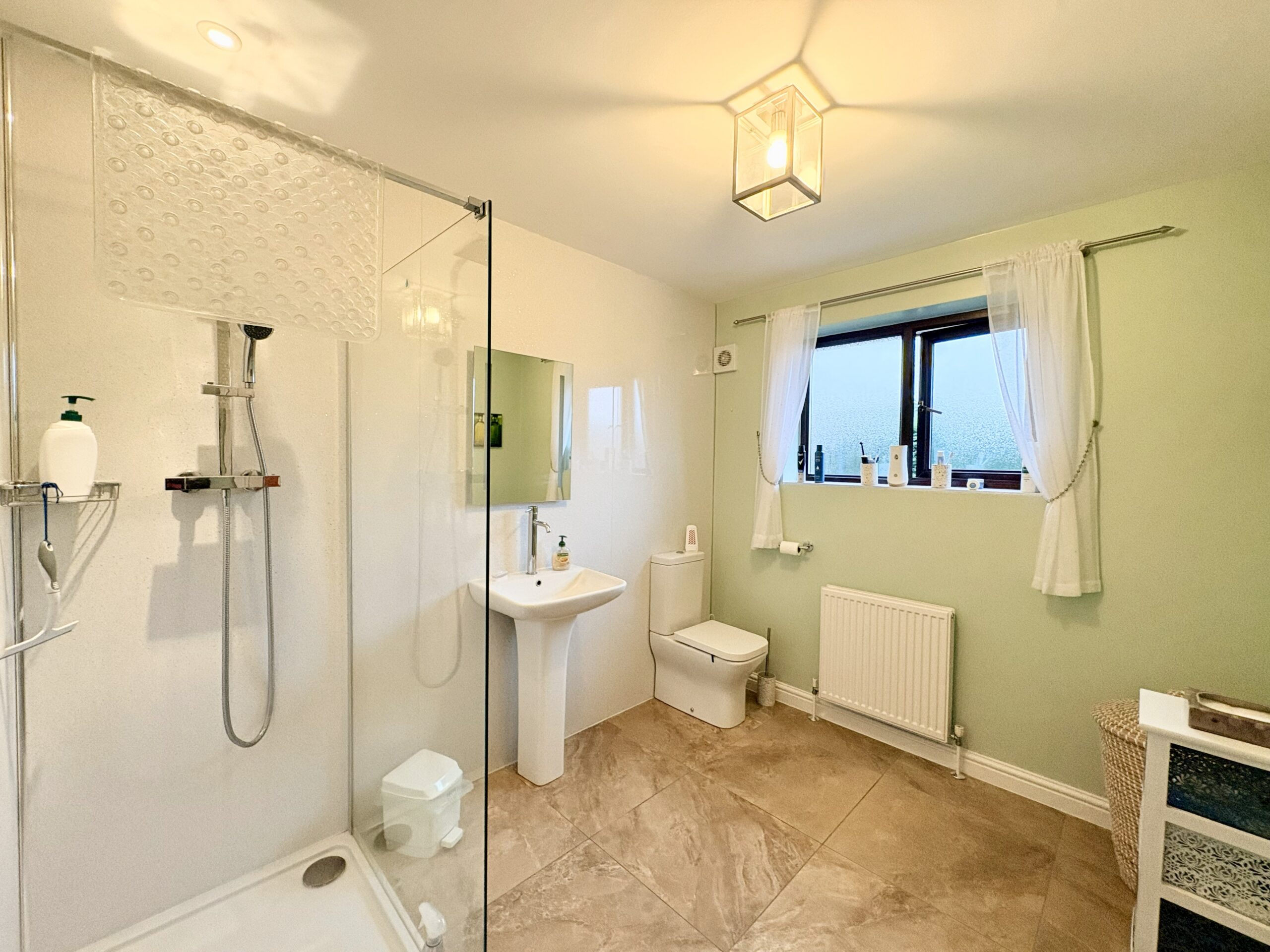 The ground floor shower room comprises a walk in shower, low-level WC and hand basin, with tiled flooring, radiator and single pendant light fitting.