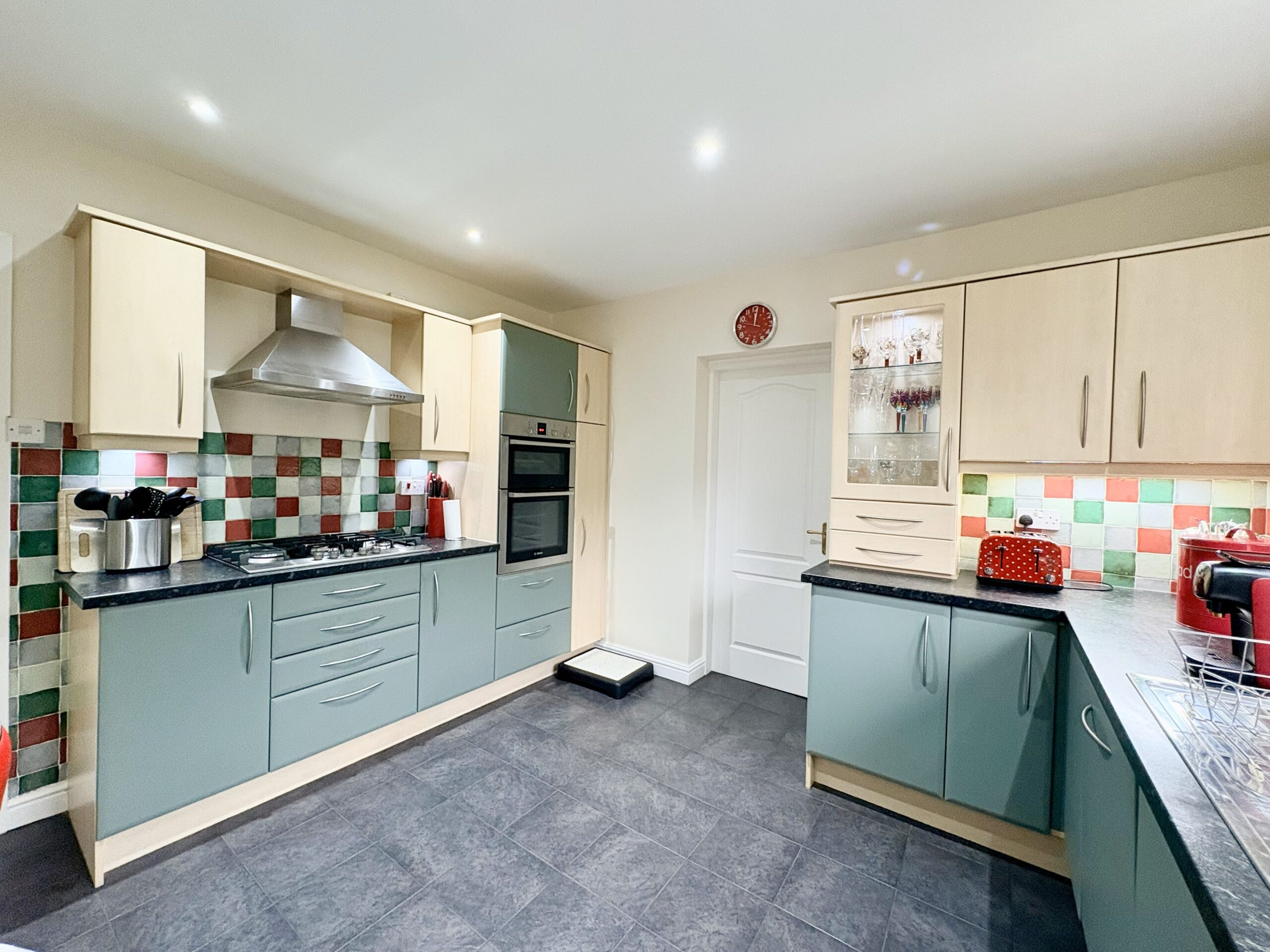 The fully fitted kitchen boasts a wide range of modern wall and base units with coordinating worktops and a large breakfast bar. Integrated appliances include a double oven, 5 ring gas hob, extractor hood and dishwasher. Finished with tiled flooring, rear-aspect window and door leading to utility room. Spotlighting and radiator.