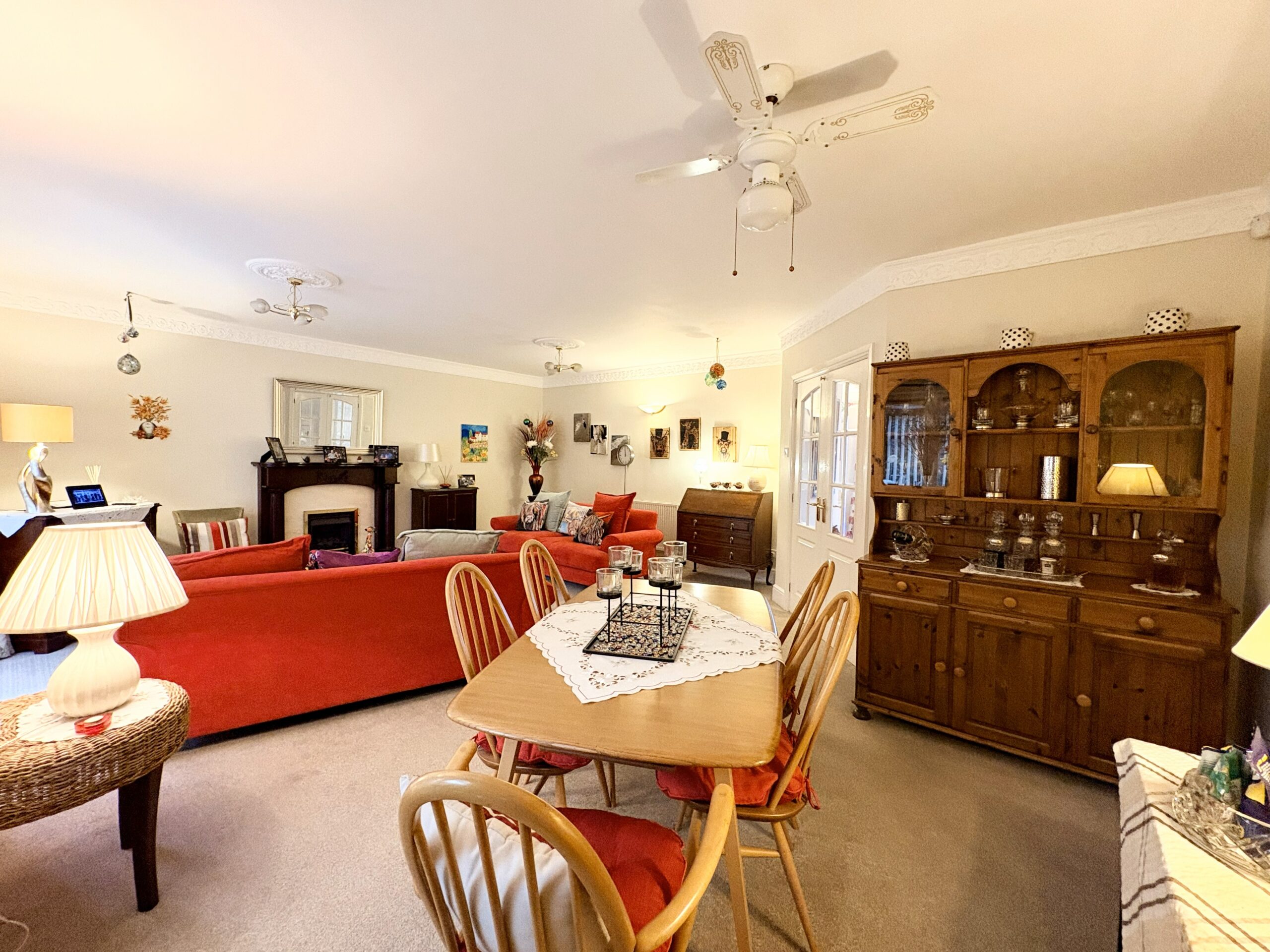 The spacious lounge/dining room benefits from French doors from the hallway and further French doors opening onto the rear aspect conservatory. Featuring a fireplace with gas fire, carpeted flooring, two radiators and two single pendant light fittings. There is a further rear aspect window and plenty of space for large lounge furniture and dining table.