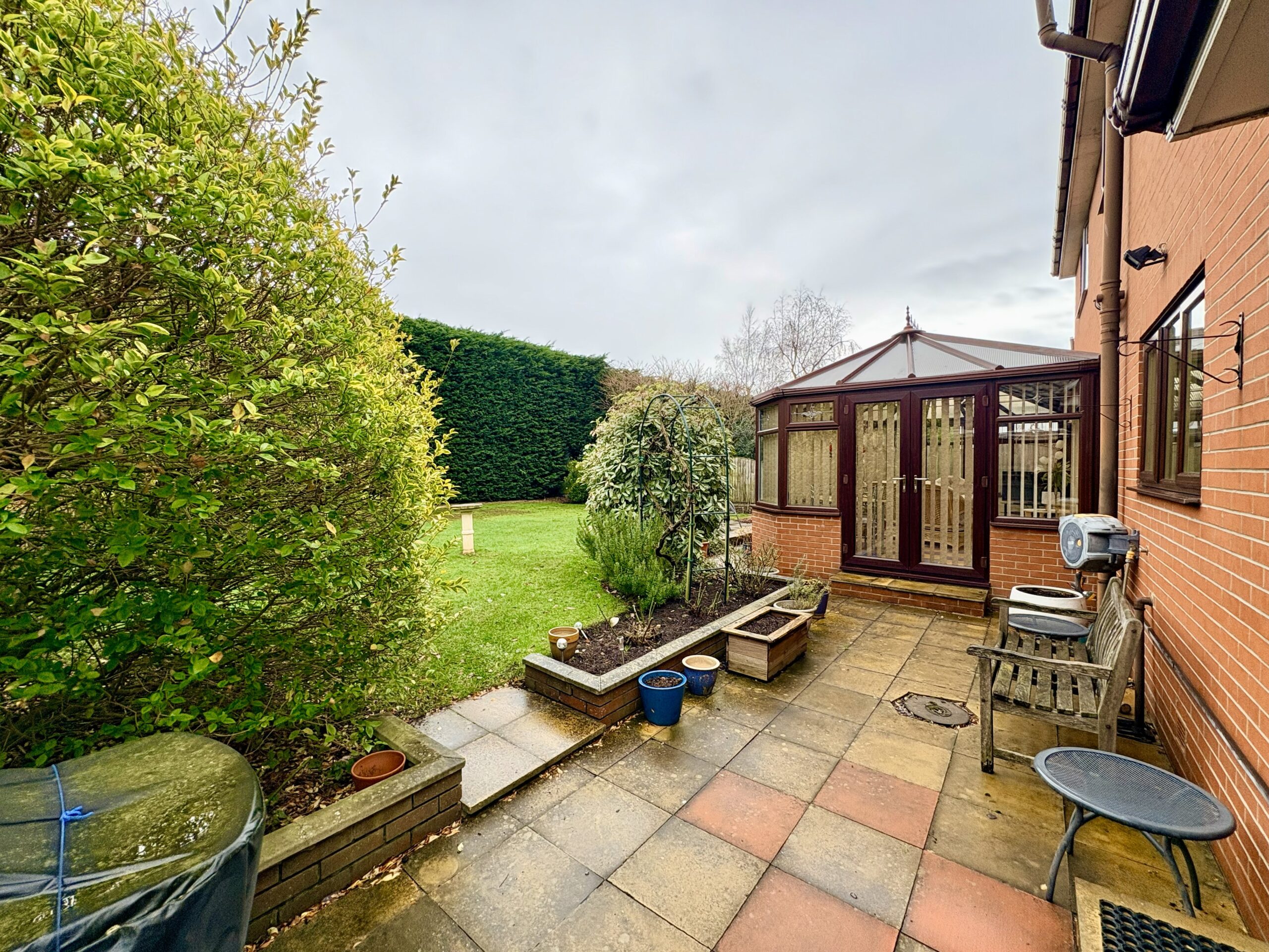 The large conservatory is well maintained and bright, offering a great place to enjoy the garden view, with tiled flooring, radiator, single pendant fan light fitting and French doors opening onto the garden.