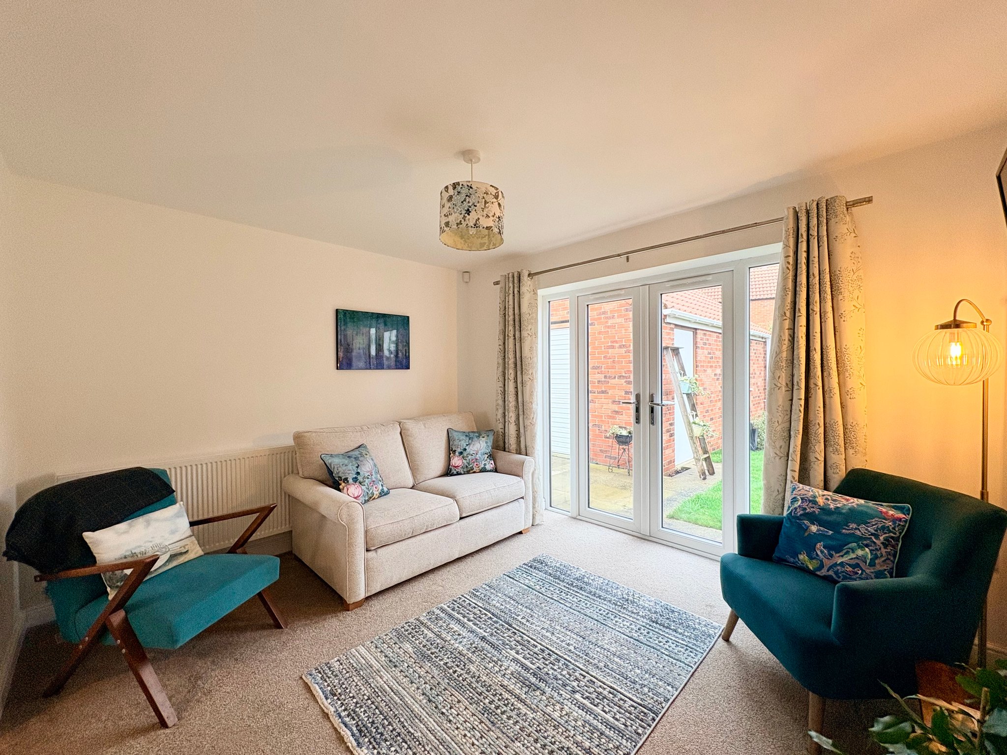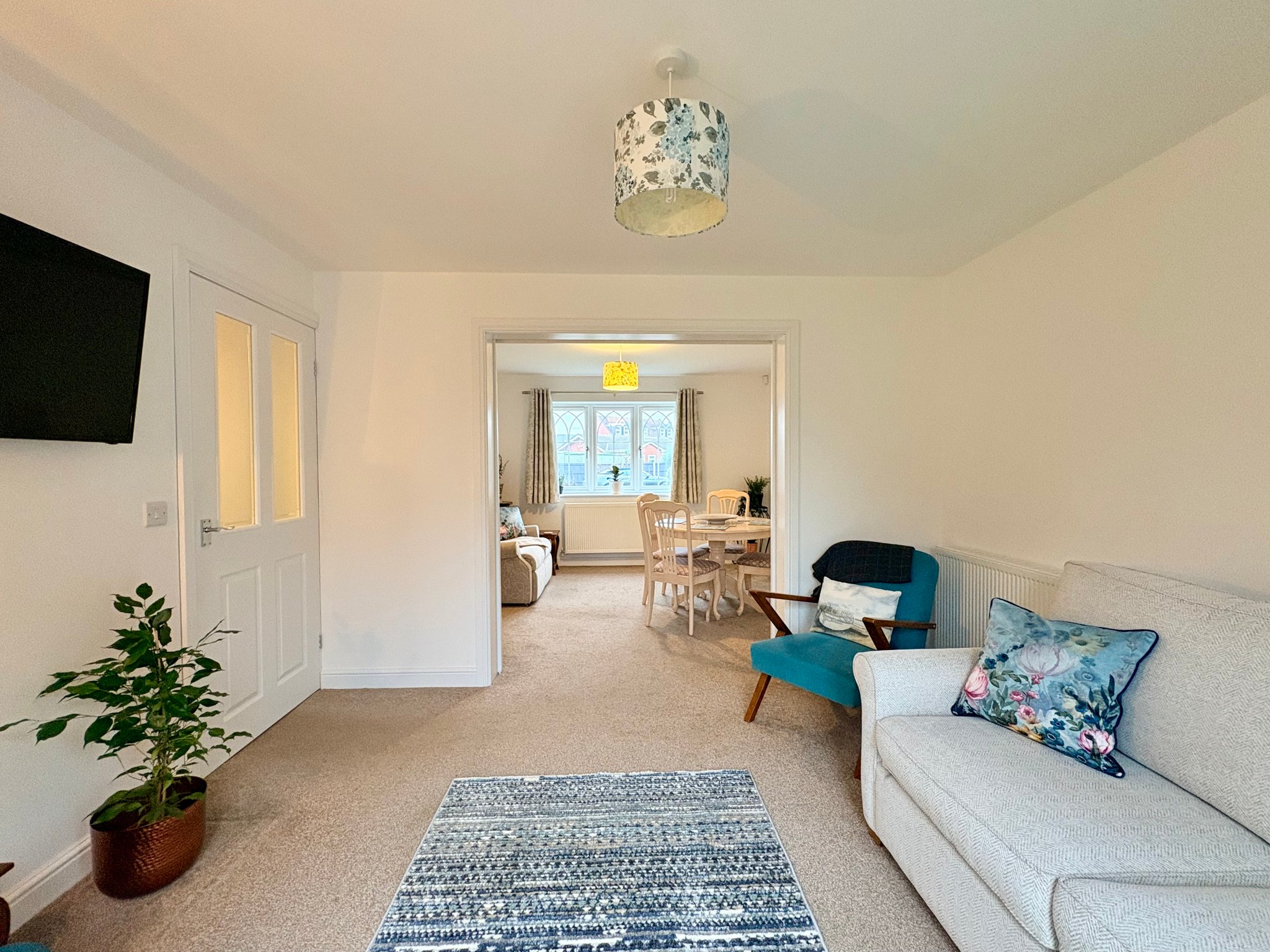 Front aspect lounge with carpet to floor, radiator and single pendant light fitting. There are large sliding doors which separate the lounge and dining room to suit your style.