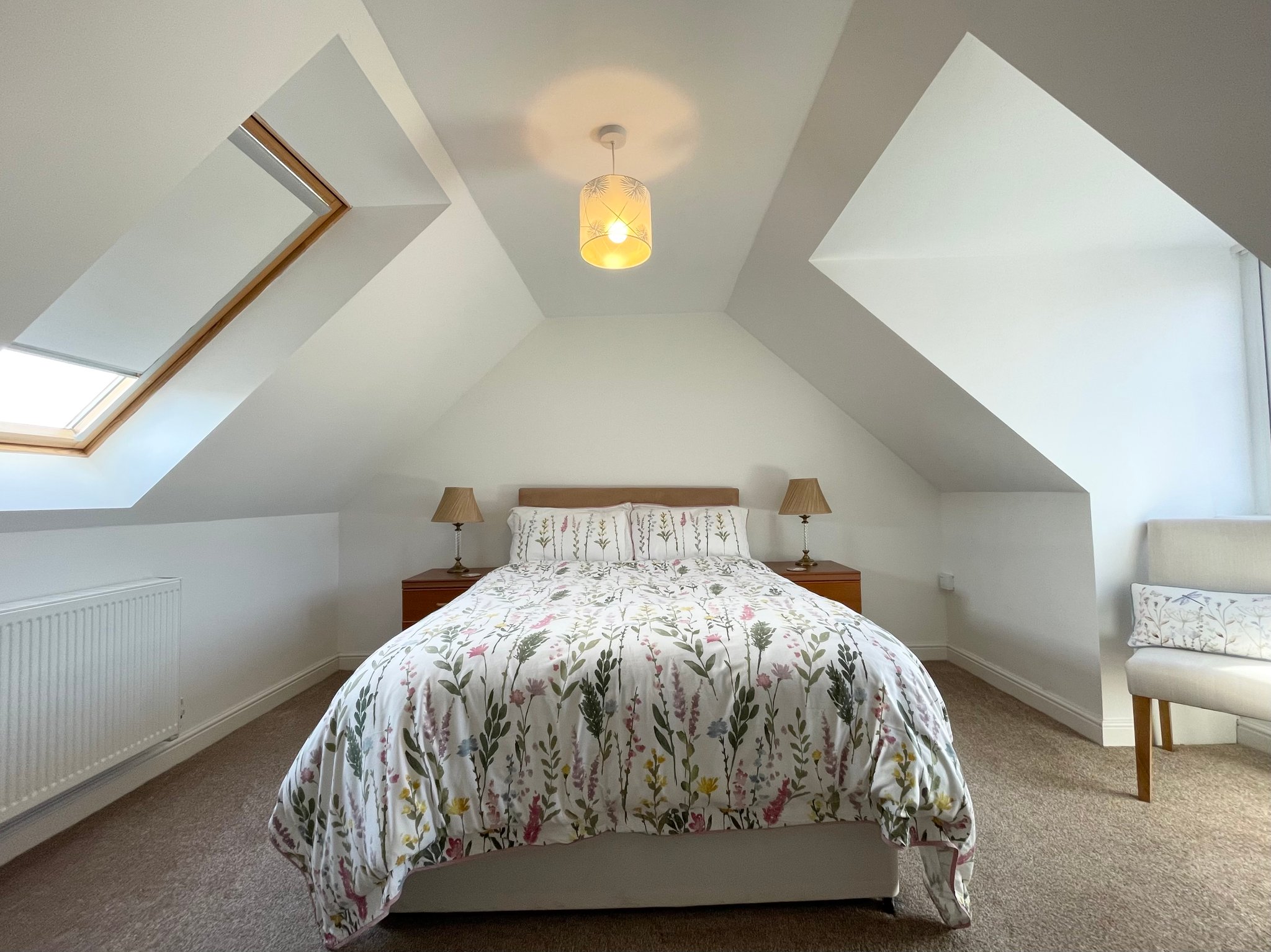 Bedroom 2 is a large double and has front aspect dormer window and rear aspect skylight, carpet, radiator and single pendant light fitting.