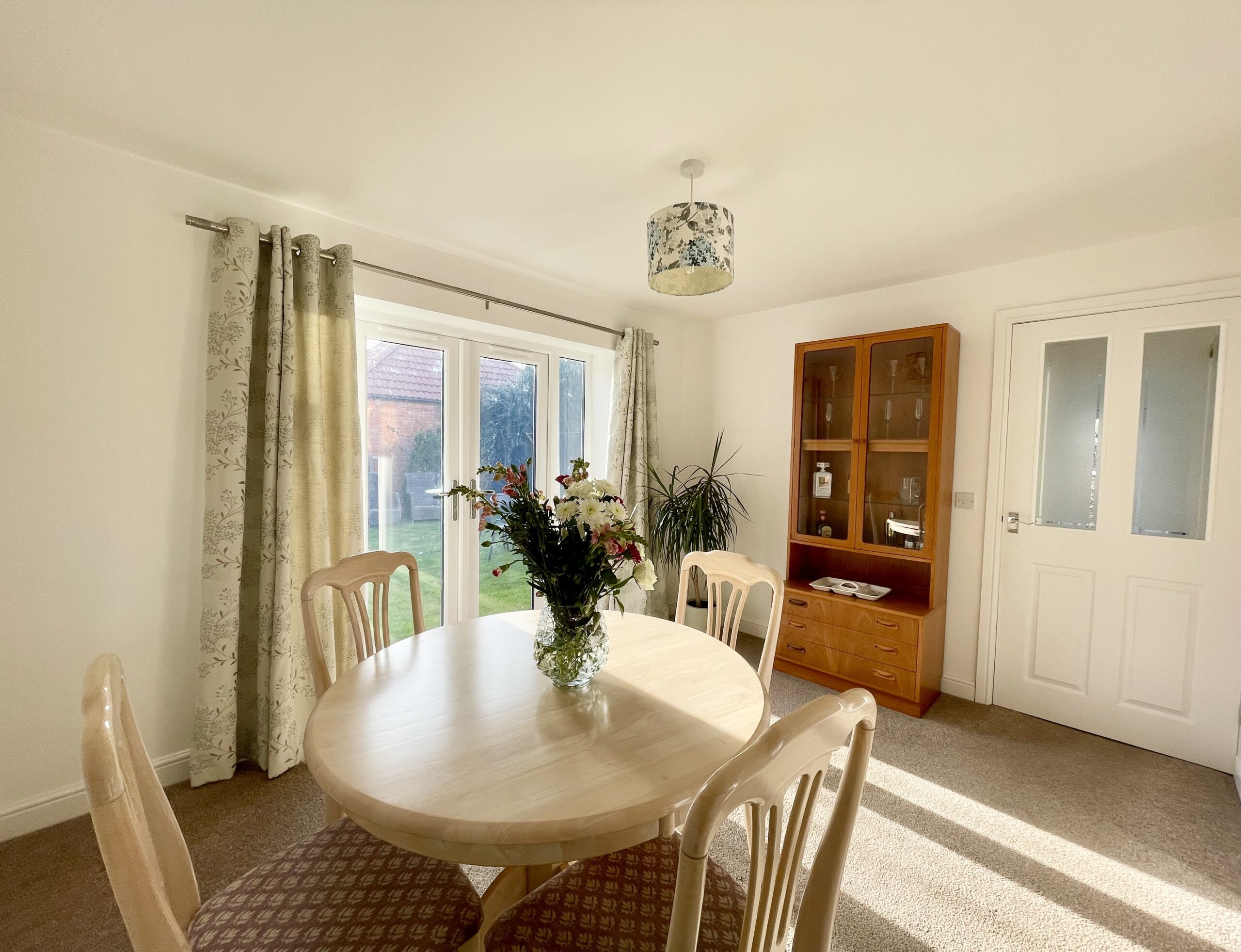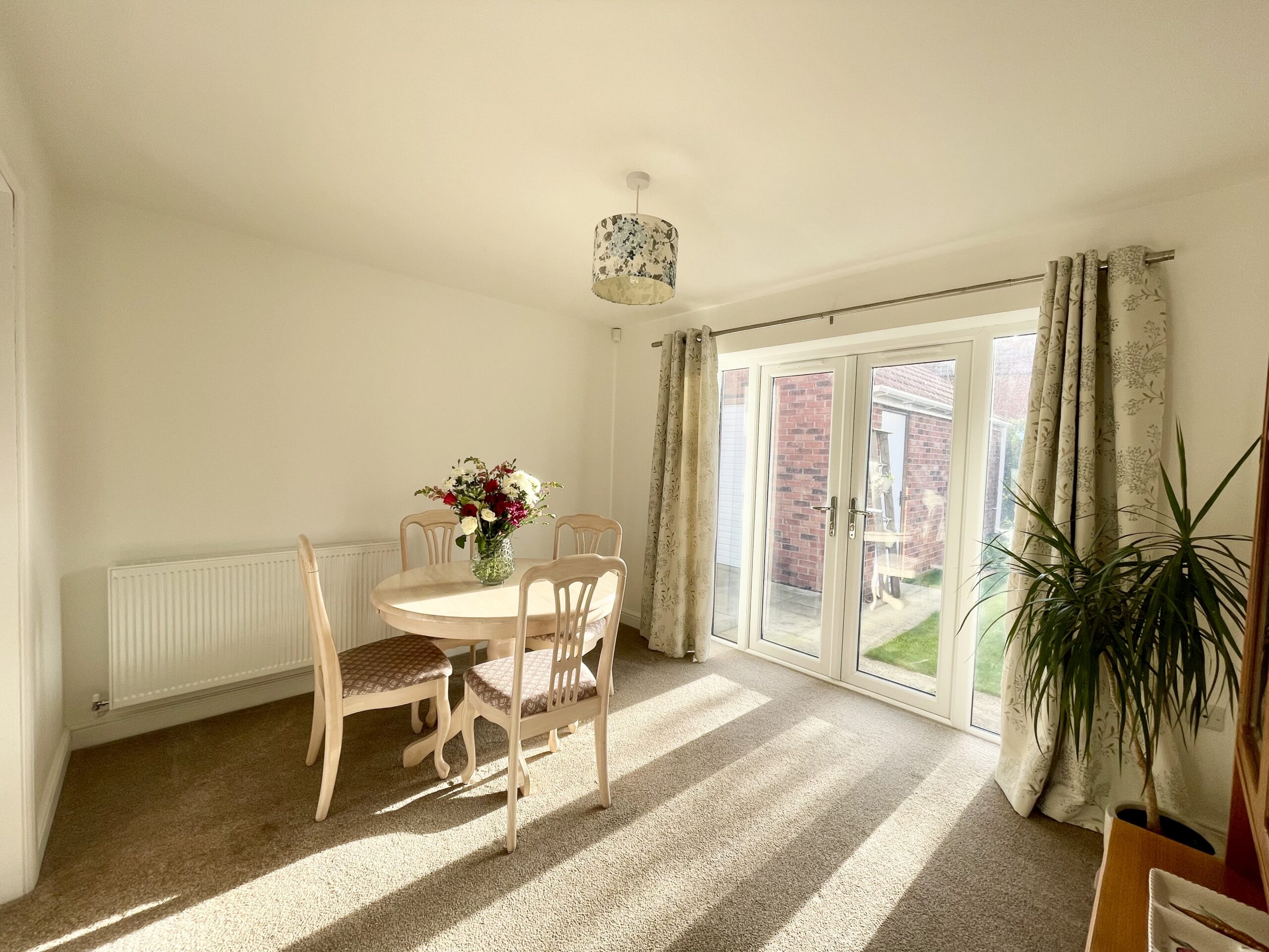 Dining room with French doors onto the garden, carpet to floor, radiator and single pendant light fitting.