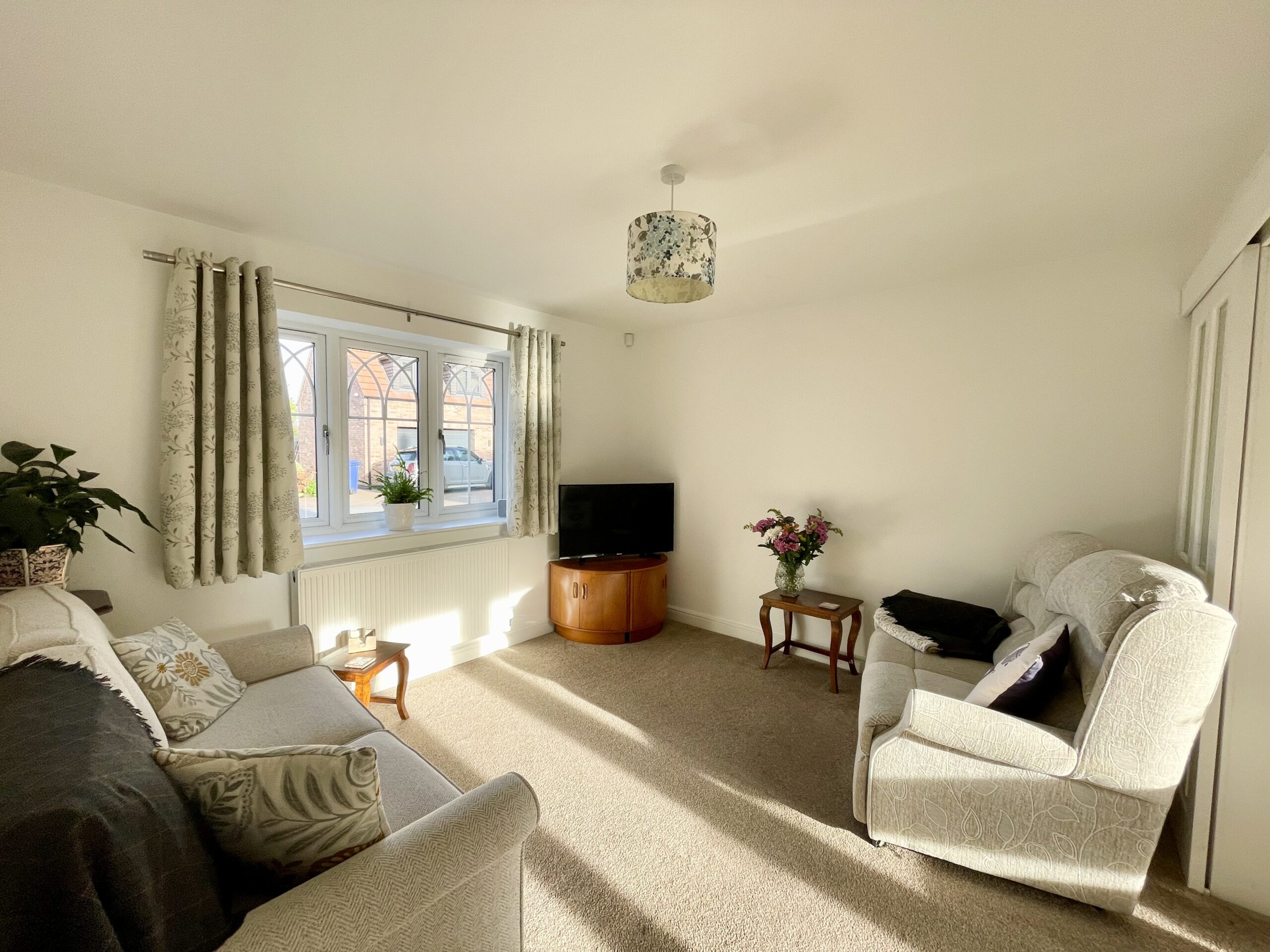 Front aspect lounge with carpet to floor, radiator and single pendant light fitting. There are large sliding doors which separate the lounge and dining room to suit your style.