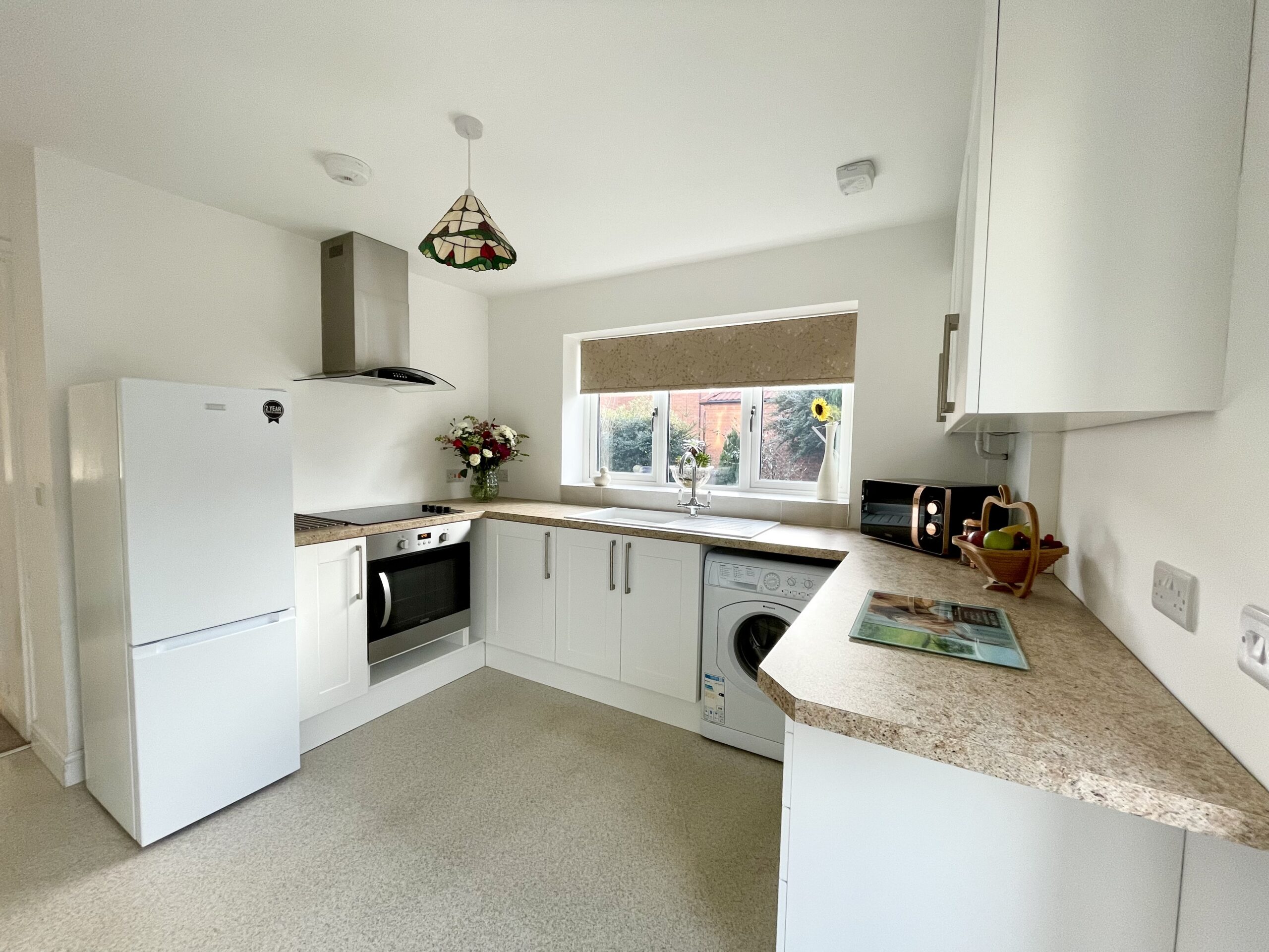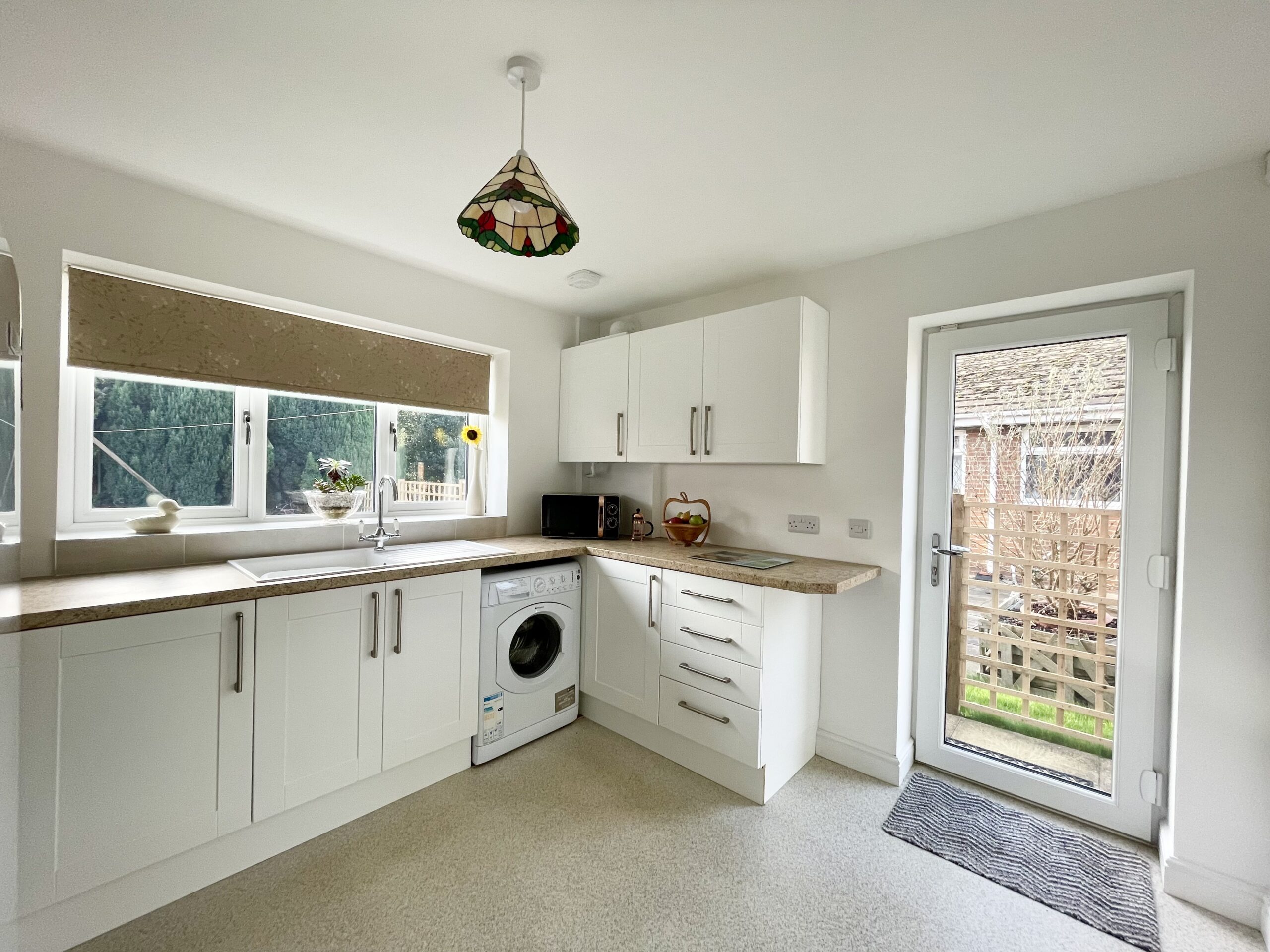 Shaker style fitted kitchen with a range of floor and wall units with contrasting worktops, integrated appliances include oven, hob and extractor hood, plumbing for washing machine and space for fridge freezer, side aspect door onto garden, rear aspect window, radiator, single pendant light fitting and vinyl floor covering.
