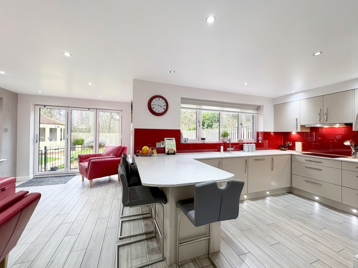The open plan family room, located just off the kitchen, is a superb additional reception space and a standout feature of this home. With bi-fold doors opening onto the garden and two side aspect windows, the room is flooded with natural light and offers wonderful views over the private rear garden. An electric fire provides a focal point, making this an ideal space to relax, entertain or enjoy family time throughout the year.
