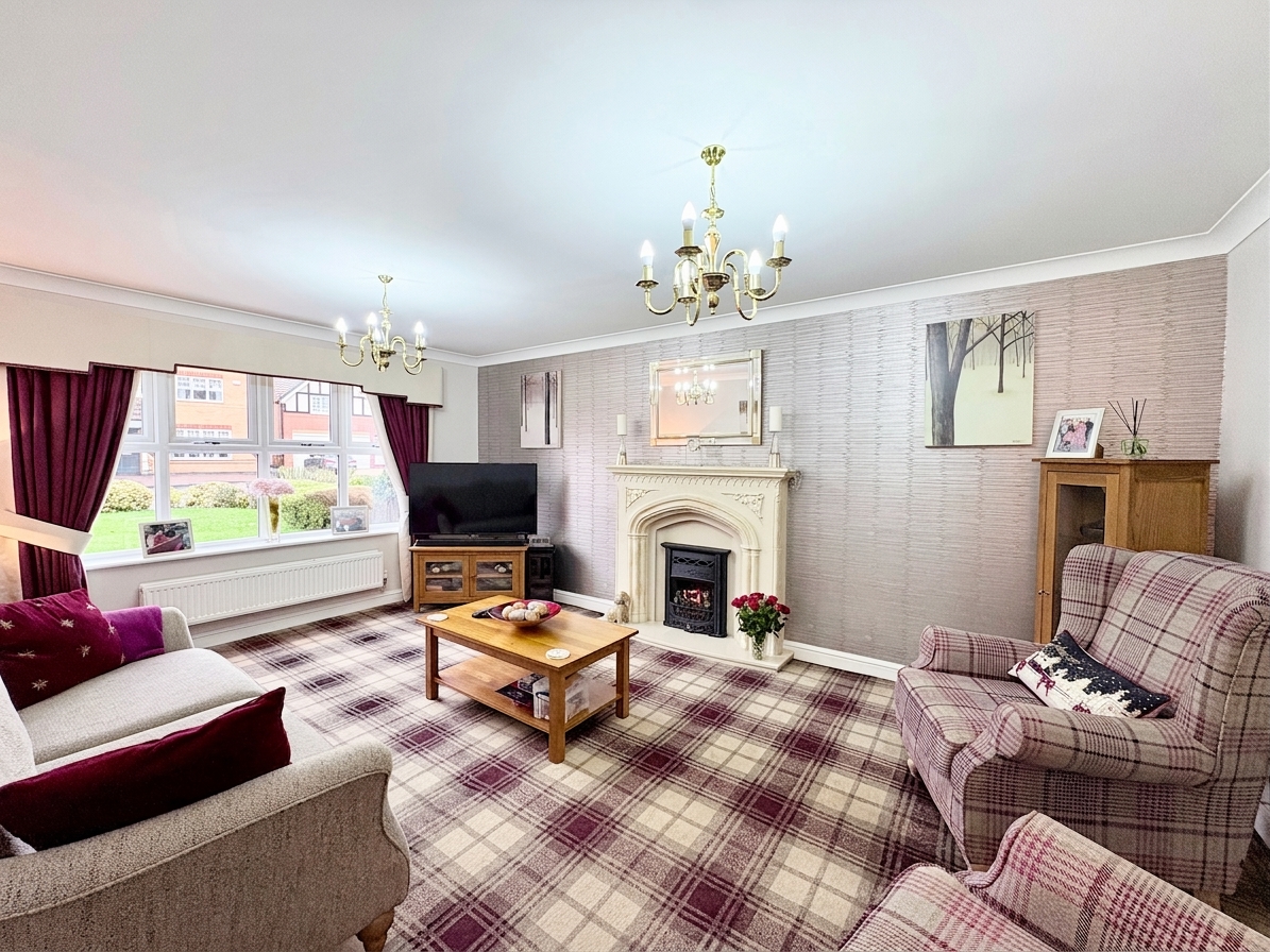 The generous lounge is positioned to the front of the property and benefits from a large front aspect window flooding the room with natural light. A stylish gas fire with marble surround creates an attractive focal point, while French doors open through to the dining room allowing flexibility between open plan and separate living. The room is finished with fitted carpet, two radiators and two single pendant light fittings, creating a warm and inviting family space.