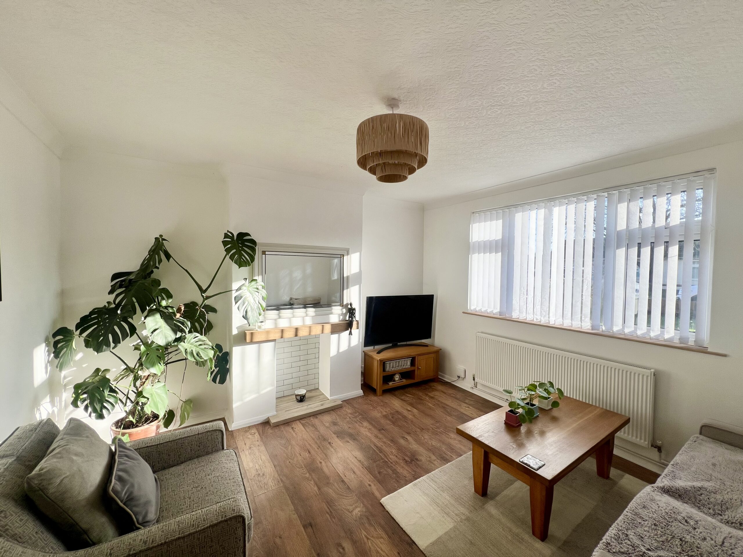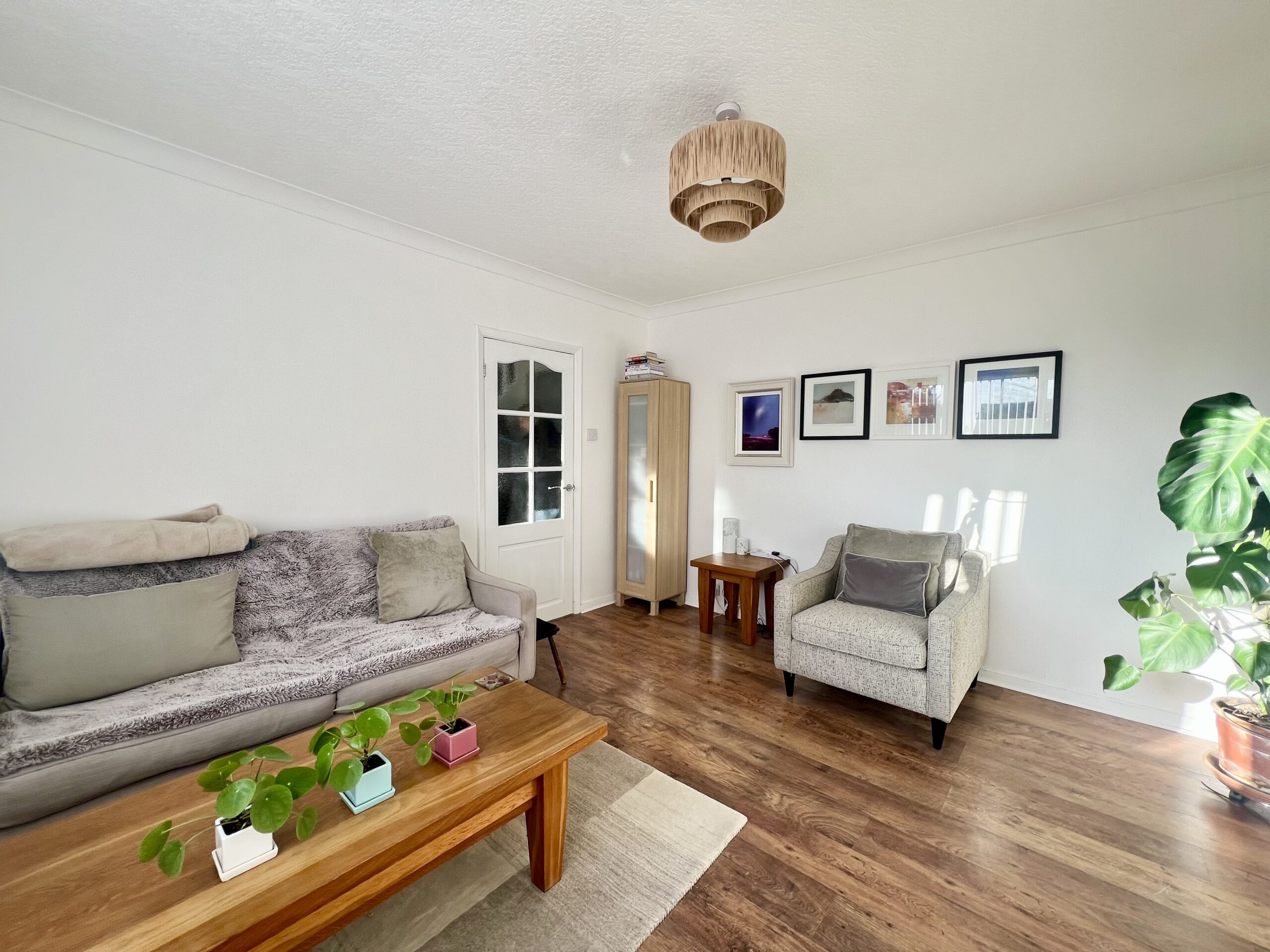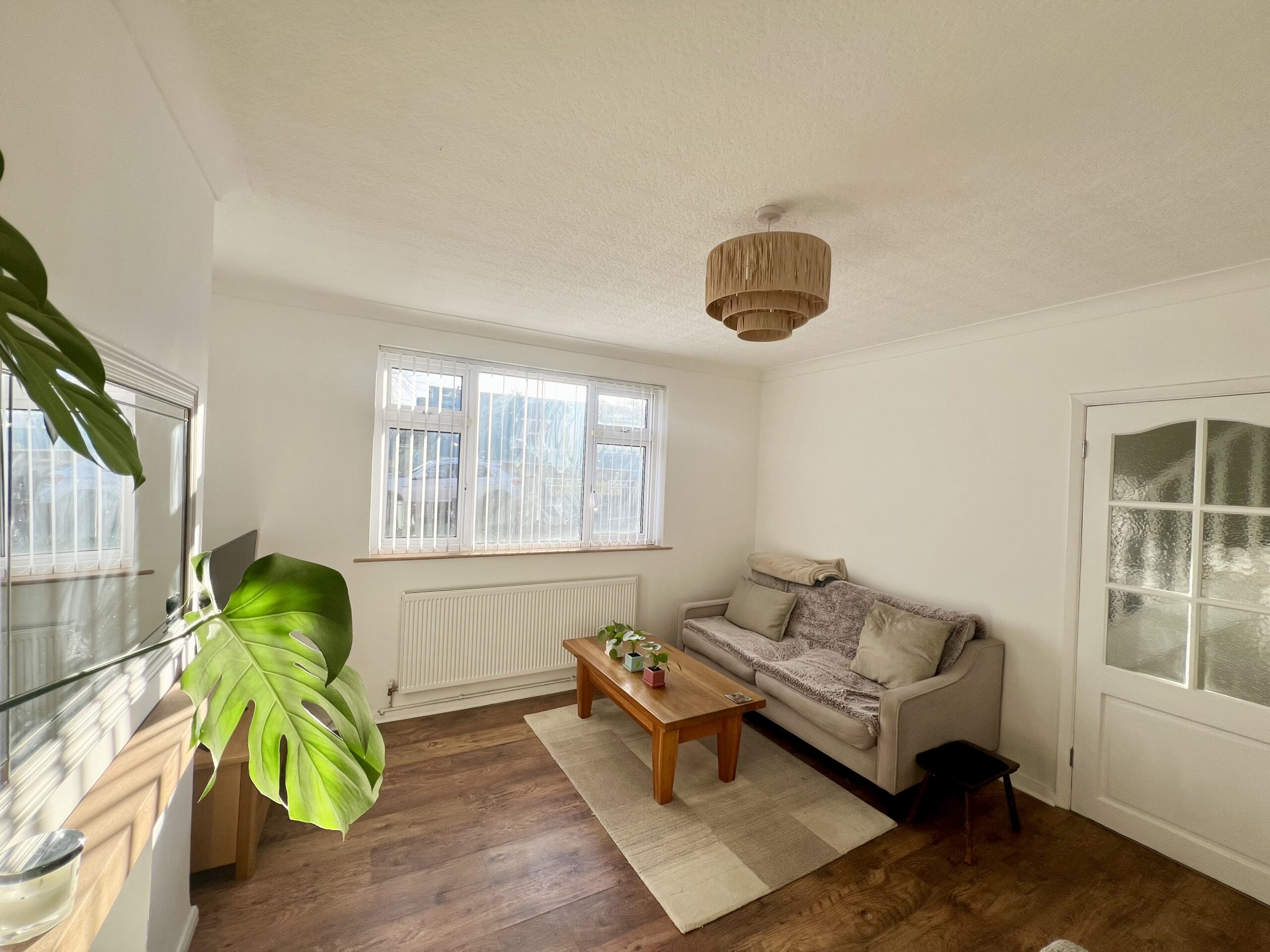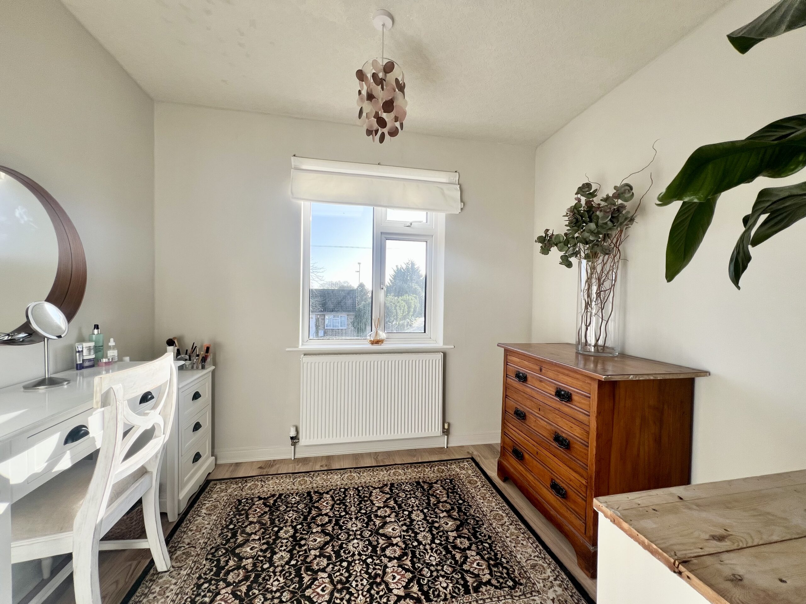 The principal bedroom is positioned at the front of the property and offers a bright and spacious retreat. Featuring a large front-facing window that allows plenty of natural light to pour in, the room is complemented by stylish wood-effect flooring, a radiator and a tasteful pendant light fitting. Fitted wardrobes provide excellent built-in storage, enhancing both practicality and the clean, streamlined finish of this well-presented bedroom. Bedroom two enjoys pleasant views over the rear garden and is a well-proportioned second bedroom, ideal for family members or guests. Finished with attractive wood-effect flooring and a radiator, the room also benefits from a handy storage cupboard, providing practical space while maintaining a comfortable and inviting feel. Bedroom three is positioned at the front of the property and is a versatile, well-sized room that can be used as a bedroom, home office or dressing room, as currently styled by the vendor. It features wood-effect flooring, a front-facing window allowing natural light, a radiator and a single pendant light fitting, creating a bright and adaptable space to suit a variety of needs.
