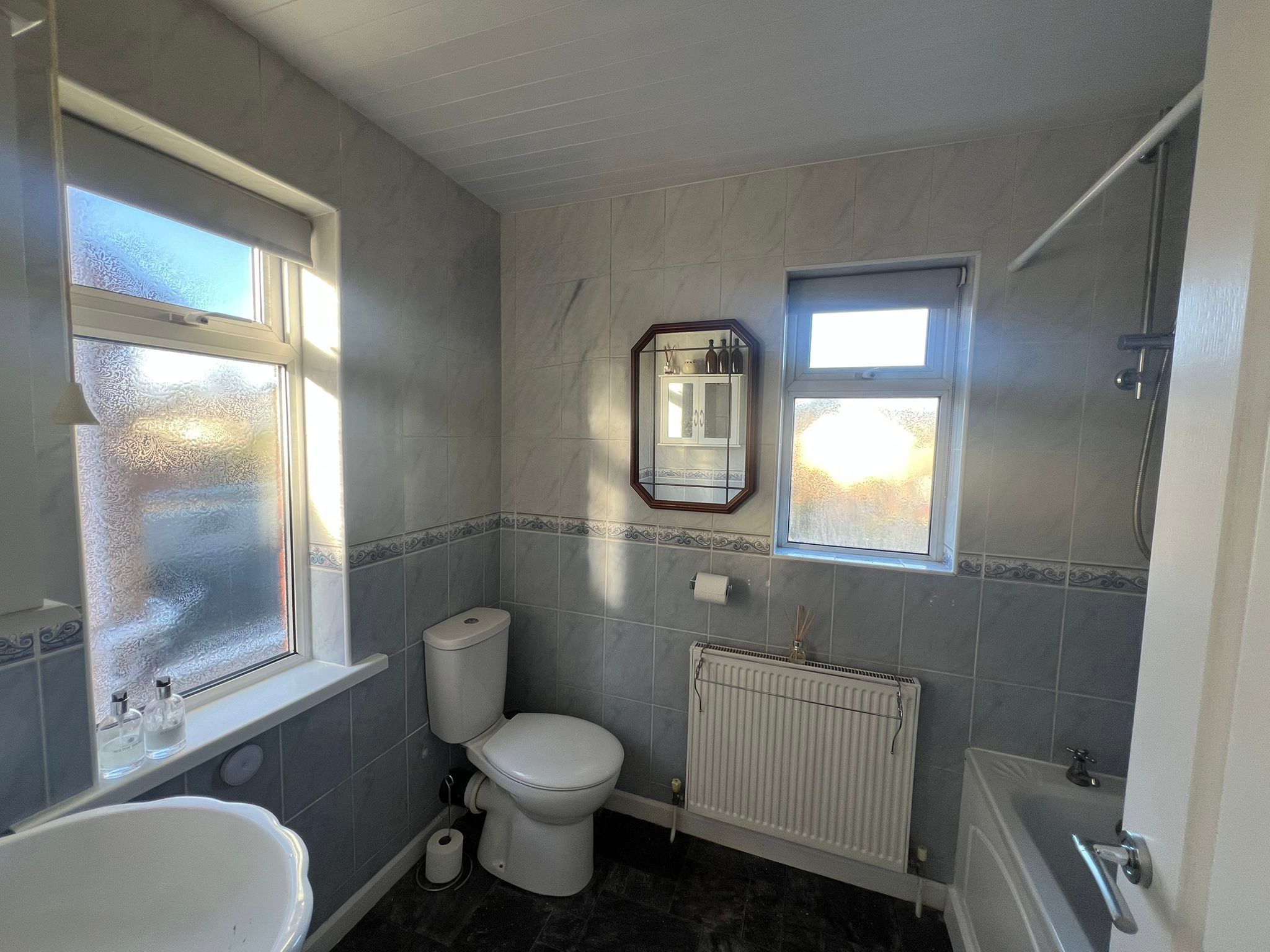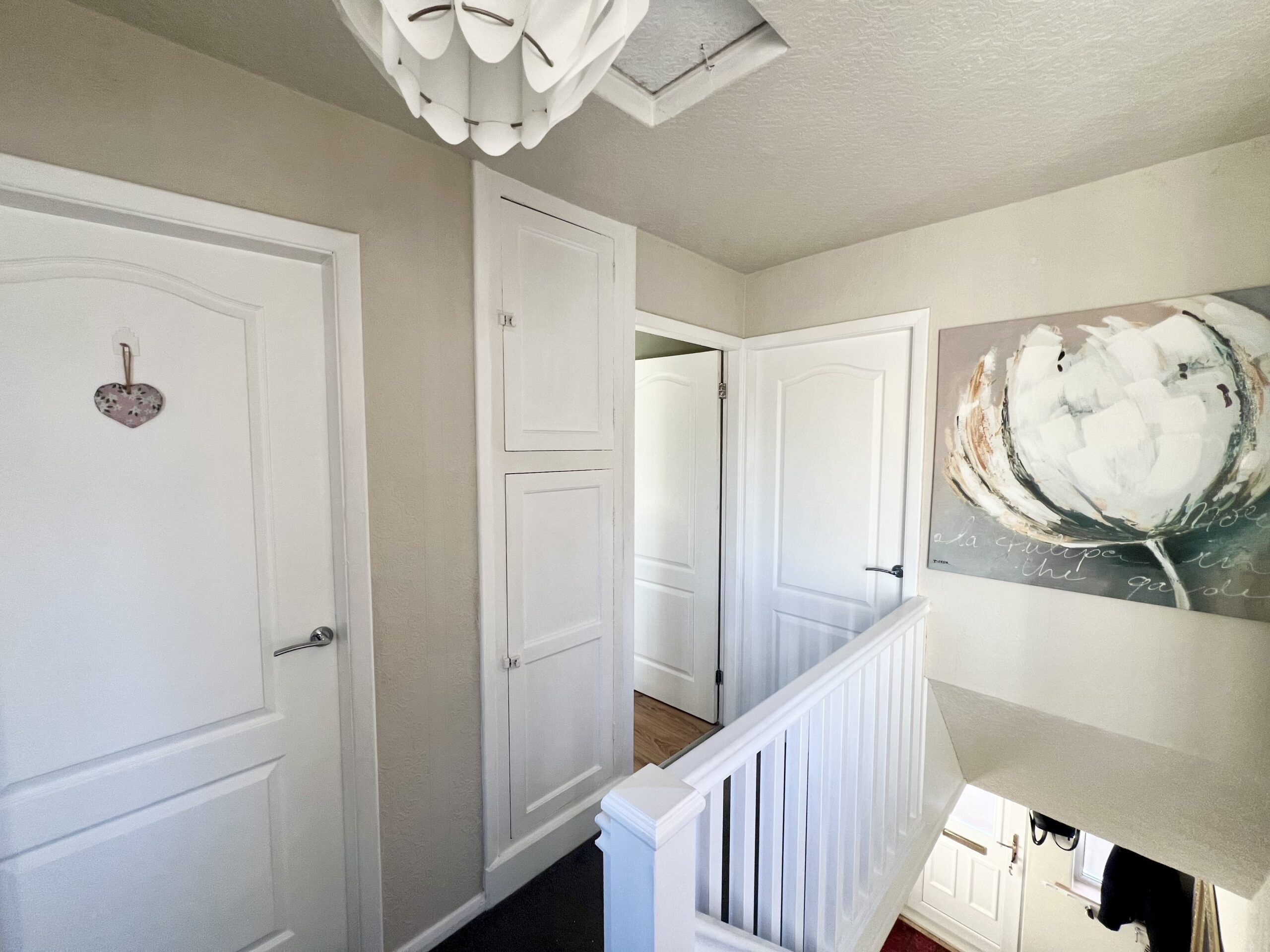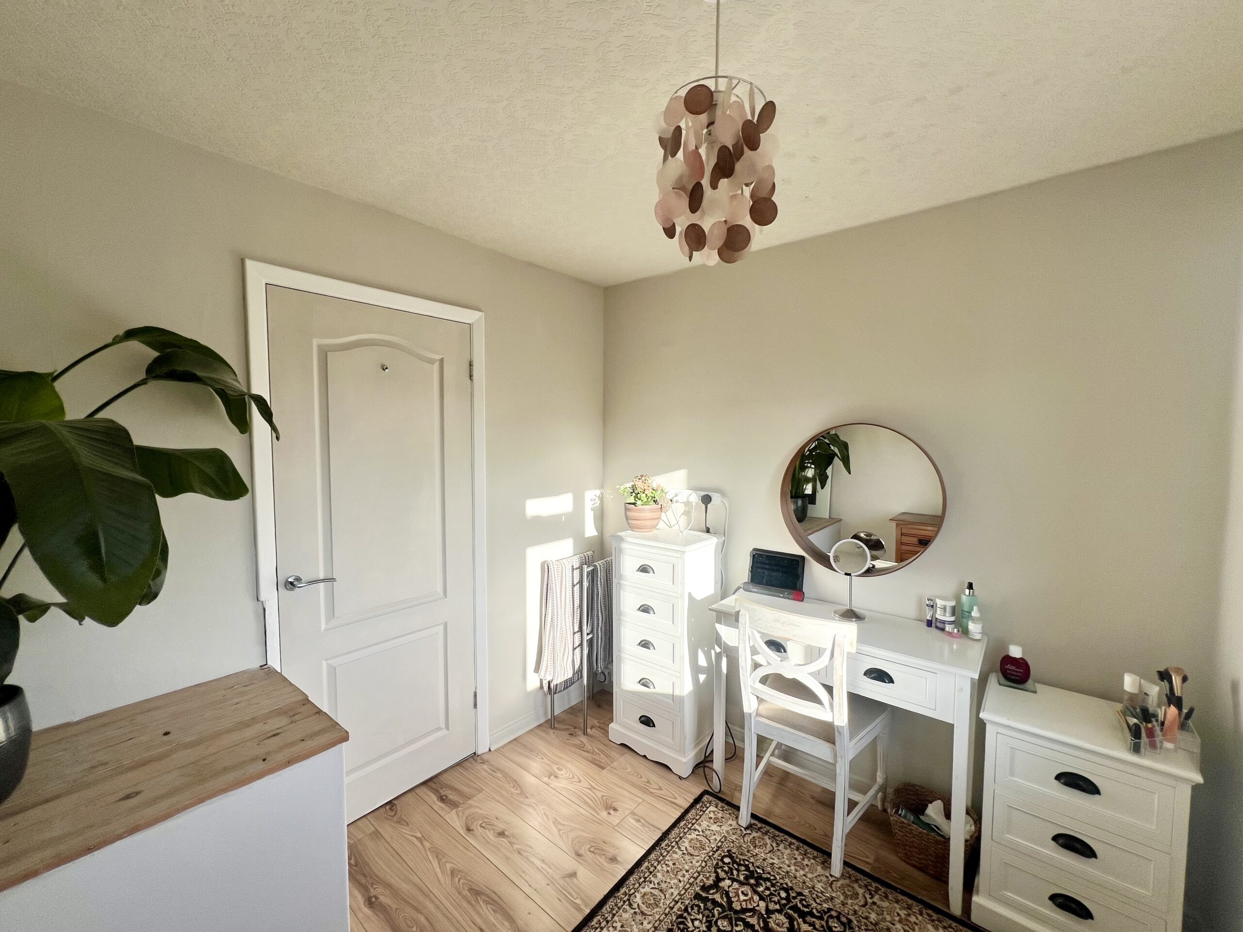 The principal bedroom is positioned at the front of the property and offers a bright and spacious retreat. Featuring a large front-facing window that allows plenty of natural light to pour in, the room is complemented by stylish wood-effect flooring, a radiator and a tasteful pendant light fitting. Fitted wardrobes provide excellent built-in storage, enhancing both practicality and the clean, streamlined finish of this well-presented bedroom. Bedroom two enjoys pleasant views over the rear garden and is a well-proportioned second bedroom, ideal for family members or guests. Finished with attractive wood-effect flooring and a radiator, the room also benefits from a handy storage cupboard, providing practical space while maintaining a comfortable and inviting feel. Bedroom three is positioned at the front of the property and is a versatile, well-sized room that can be used as a bedroom, home office or dressing room, as currently styled by the vendor. It features wood-effect flooring, a front-facing window allowing natural light, a radiator and a single pendant light fitting, creating a bright and adaptable space to suit a variety of needs.