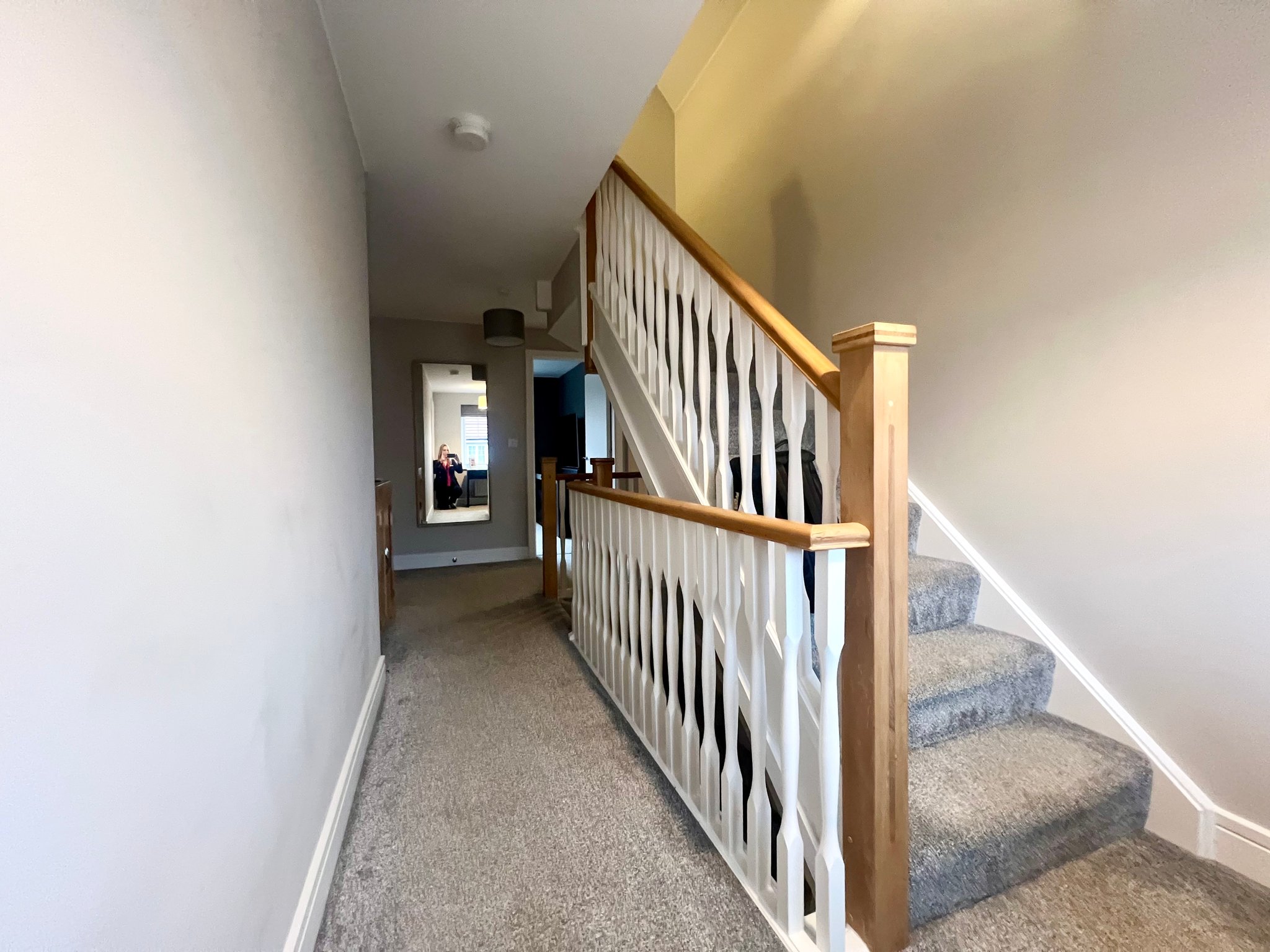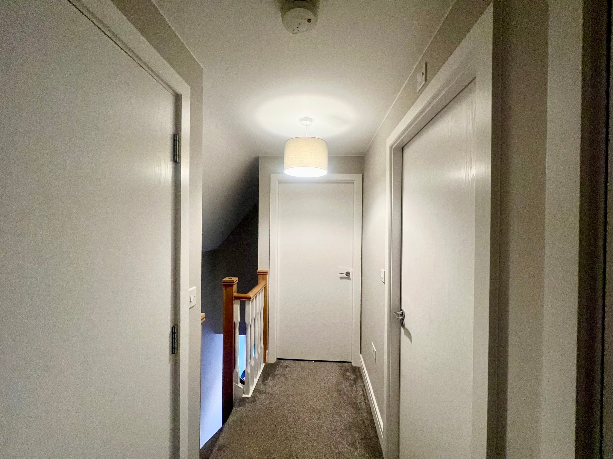 The spacious landing on the upper floor provides access to two generous double bedrooms and a family bathroom, with ample built-in storage currently used as a wardrobe. Carpet is laid to the floor and a single pendant light fitting adds a simple, elegant touch, creating a bright and functional landing area.