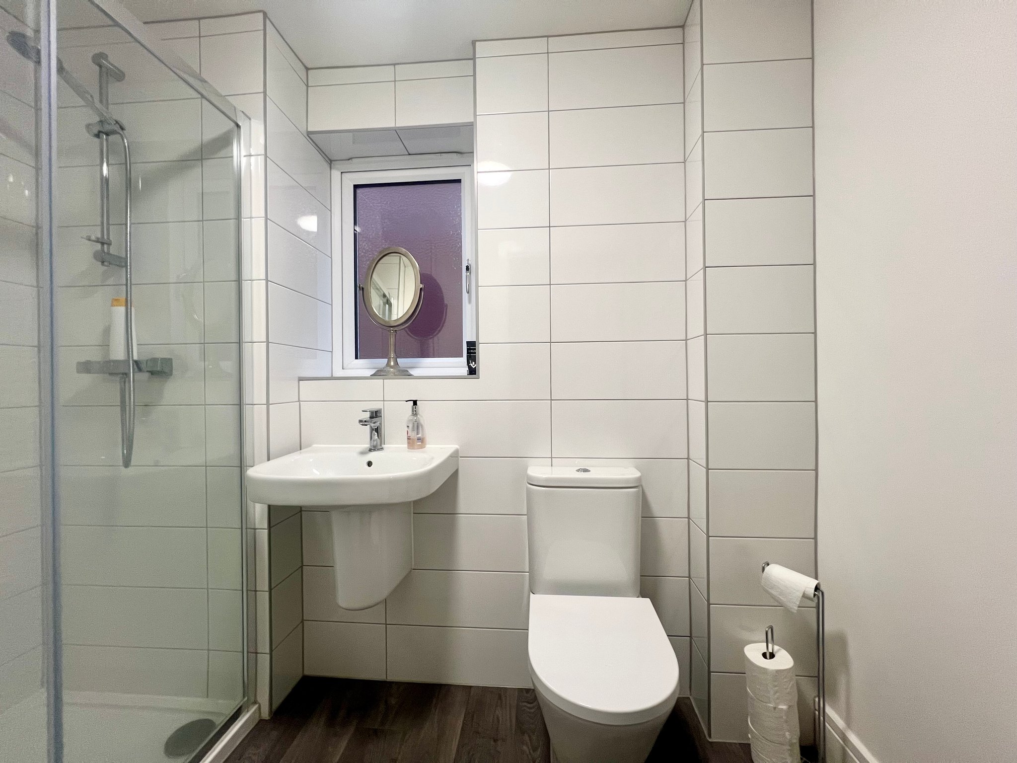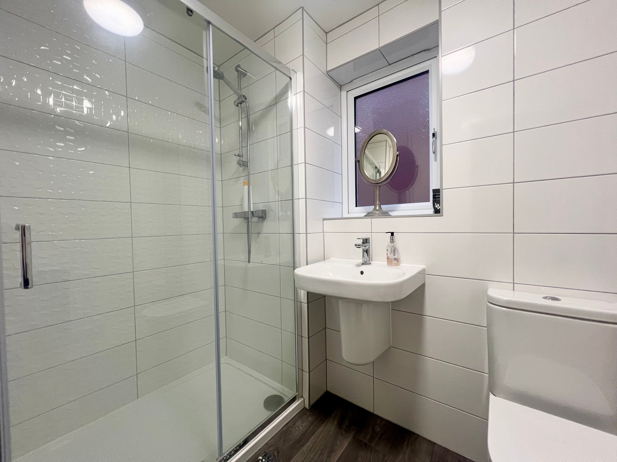 Also on the first floor, there is a modern and stylish family bathroom, featuring a shower cubicle, WC and hand basin, complemented by a radiator and wood-effect flooring. A side-facing obscure window allows natural light while maintaining privacy, making this a practical and elegant space perfectly suited to the needs of a busy family.