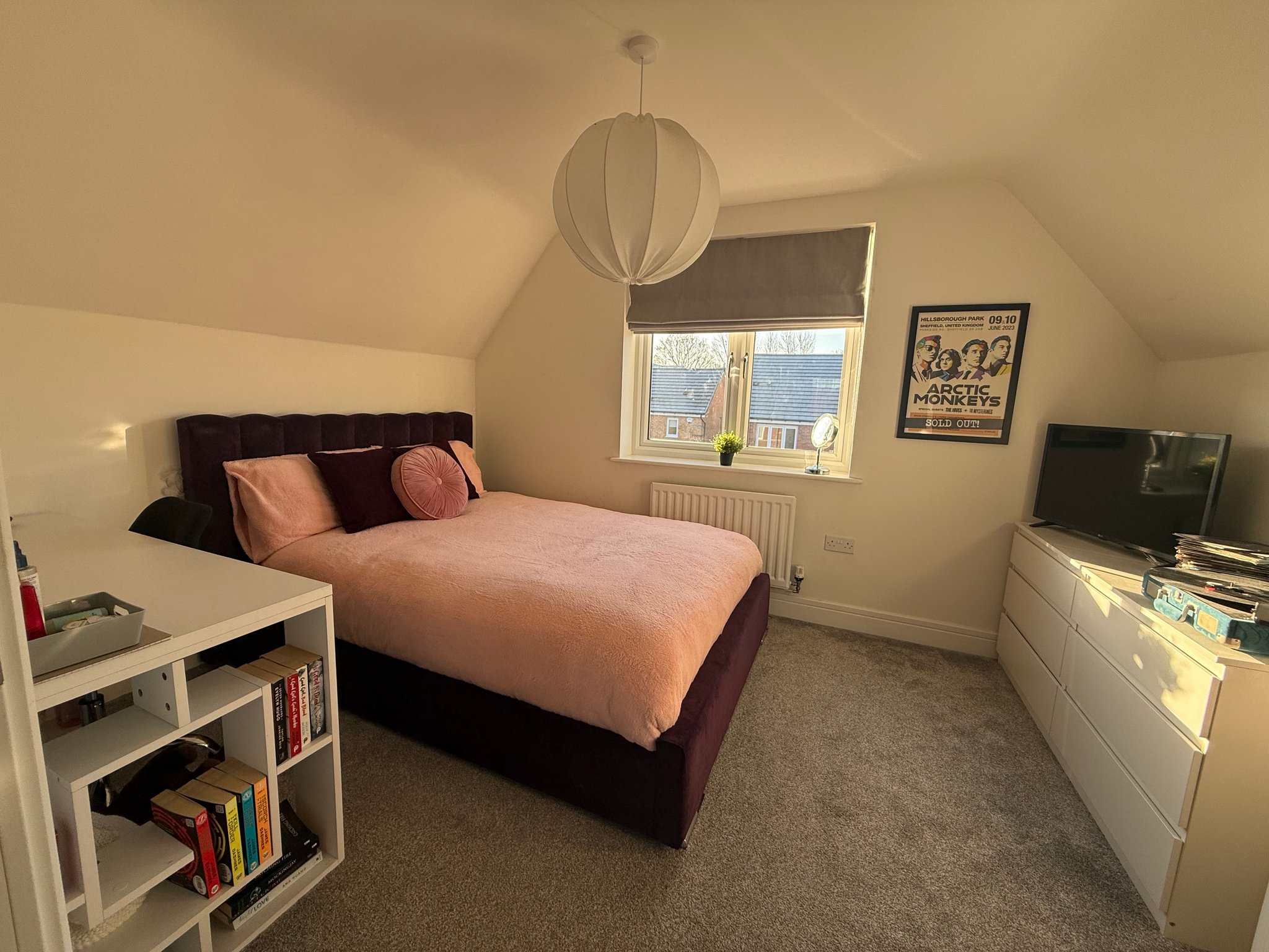 Bedroom Three is a spacious room located at the front of the property, featuring a large window that fills the space with natural light. It is finished with carpeted flooring, a radiator, and a single pendant light fitting, creating a bright and inviting double bedroom.