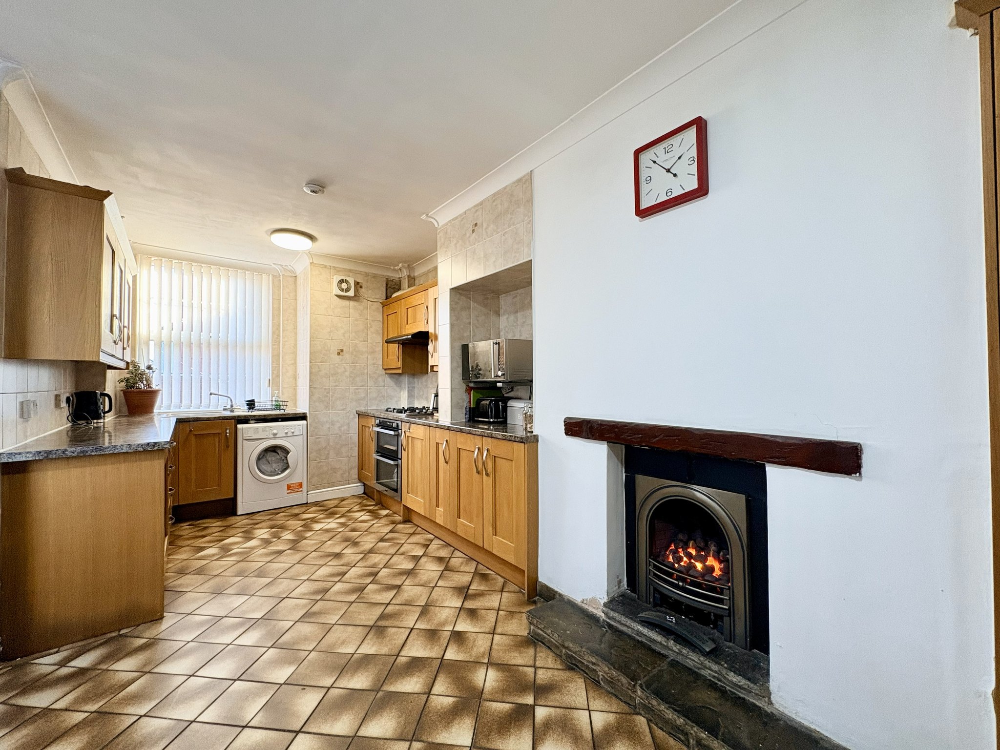 The spacious kitchen/breakfast room is fitted with a range of wall and base units with contrasting worktops. Additional features include plumbing for a washing machine, integrated oven and hob with extractor hood, tiled flooring, an open coal fire with surround, side and rear aspect windows and a door leading to the rear lobby.