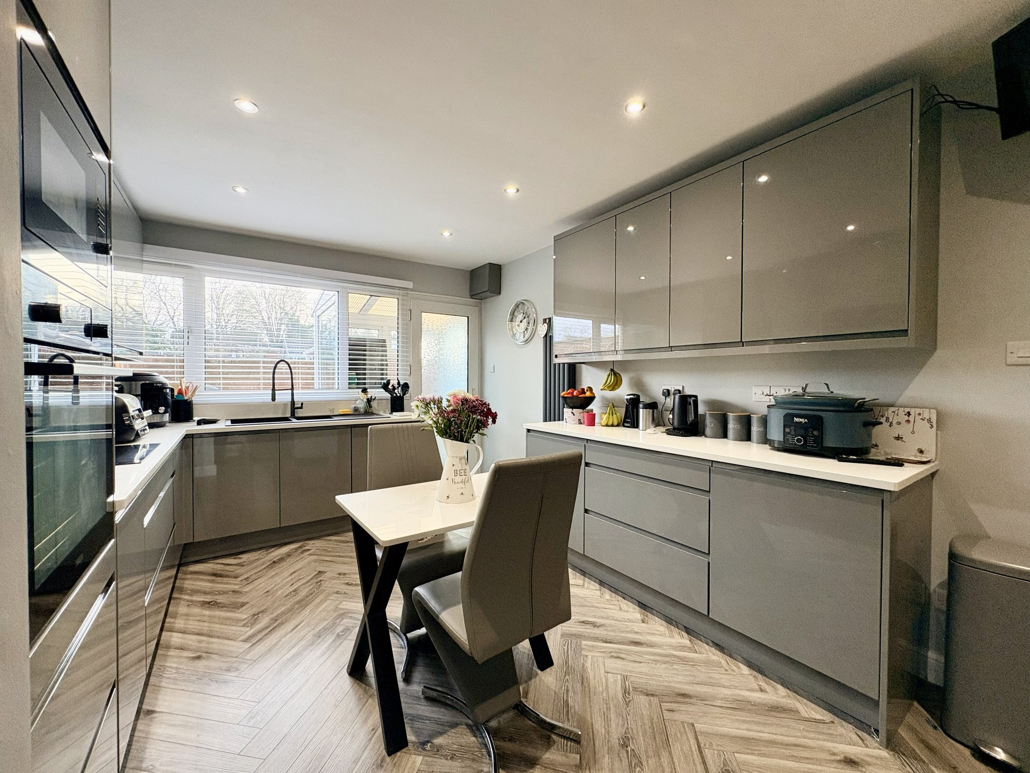 The newly installed kitchen/diner is a real centrepiece of the home, fitted with sleek, modern handleless wall and base units complemented by stunning white quartz worktops. Integrated appliances include a dishwasher, oven, microwave, and electric hob with extractor, along with space within a matching unit for an American-style fridge freezer and a dining table. High-quality LVT wood-effect flooring runs throughout, while spot lighting creates a bright and contemporary feel. A side-aspect window provides natural light, and there is access to the inner hallway, dining room, and lounge.