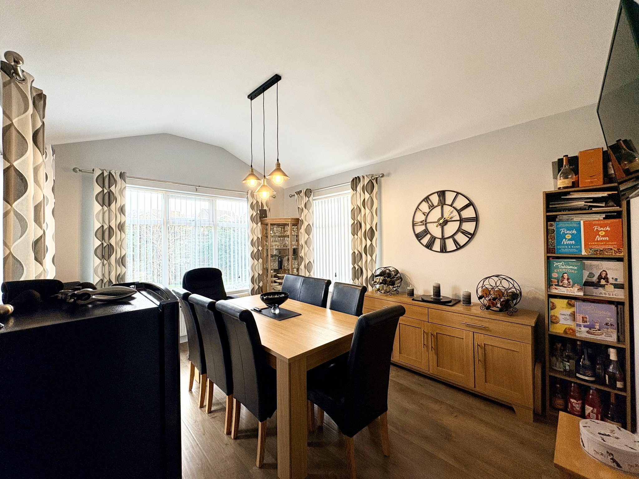 The lounge is a spacious L-shaped room offering excellent flexibility and currently arranged as a lounge and sun room. This area could easily be reconfigured to include formal dining space if required. A striking media wall with living-flame electric fire provides a stylish focal point. The room is carpeted throughout and benefits from sliding doors opening onto the rear garden, two side-aspect windows, two pendant light fittings, and two radiators. A door from the lounge leads to a fully fitted study, complete with built-in desk, cabinets, drawers, and storage, along with a rear-aspect window, wood-effect laminate flooring, and radiator.