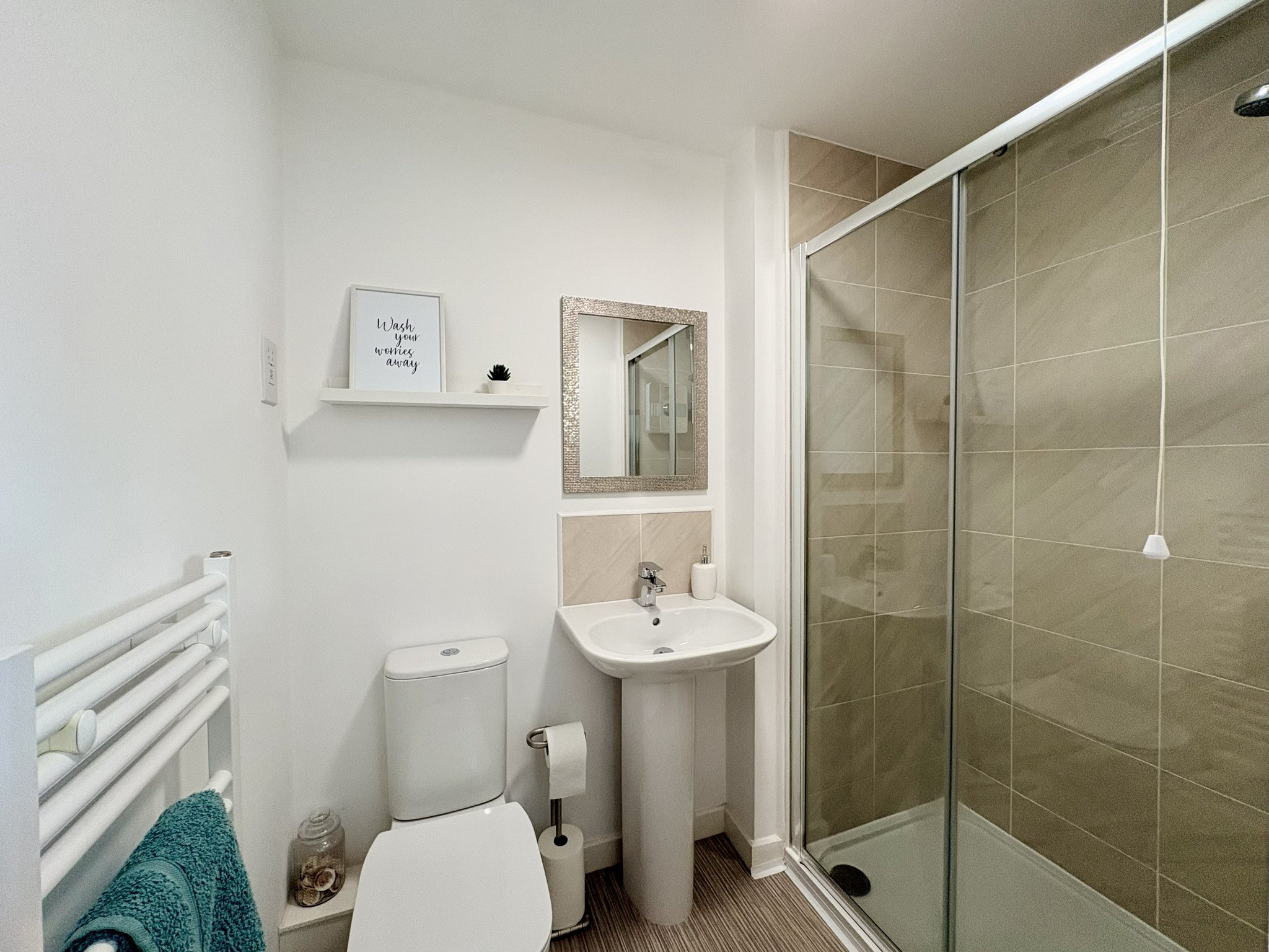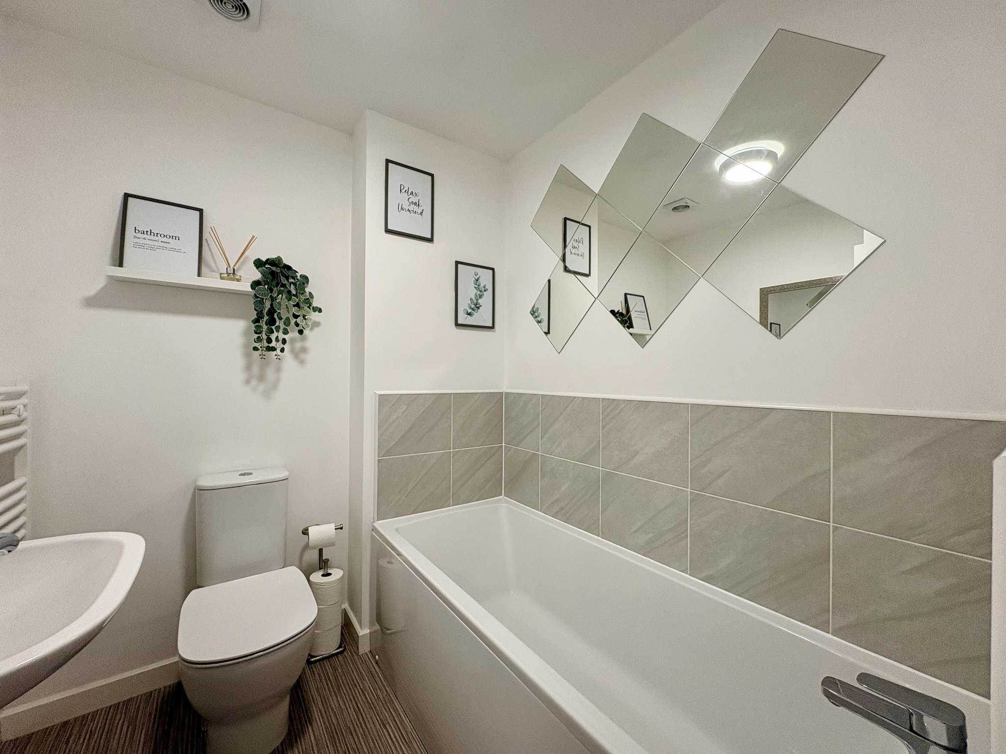 The family bathroom is part tiled and fitted with a white suite comprising a bathtub, wash basin and WC. The room includes vinyl flooring, a heated towel rail and a pendant light fitting.