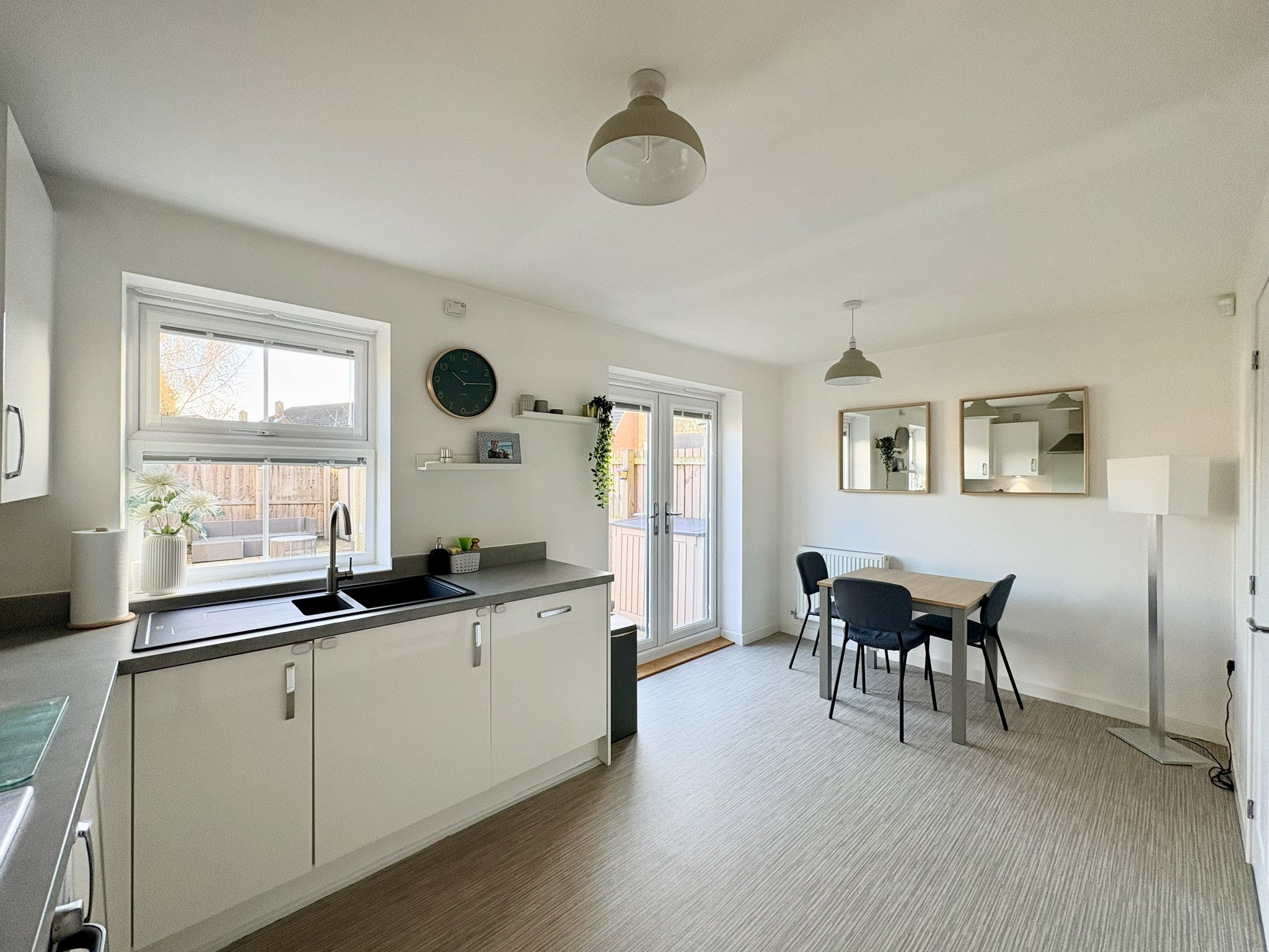 The stylish kitchen/diner is fitted with contemporary white high-gloss wall and base units with contrasting worktops. Integrated appliances include an oven with gas hob and extractor hood above, a dishwasher, fridge, freezer and plumbing for a washing machine. French doors open directly onto the rear garden, allowing plenty of natural light into the space. The kitchen/dining area offers room for a dining table, with vinyl flooring, a radiator and pendant lighting.