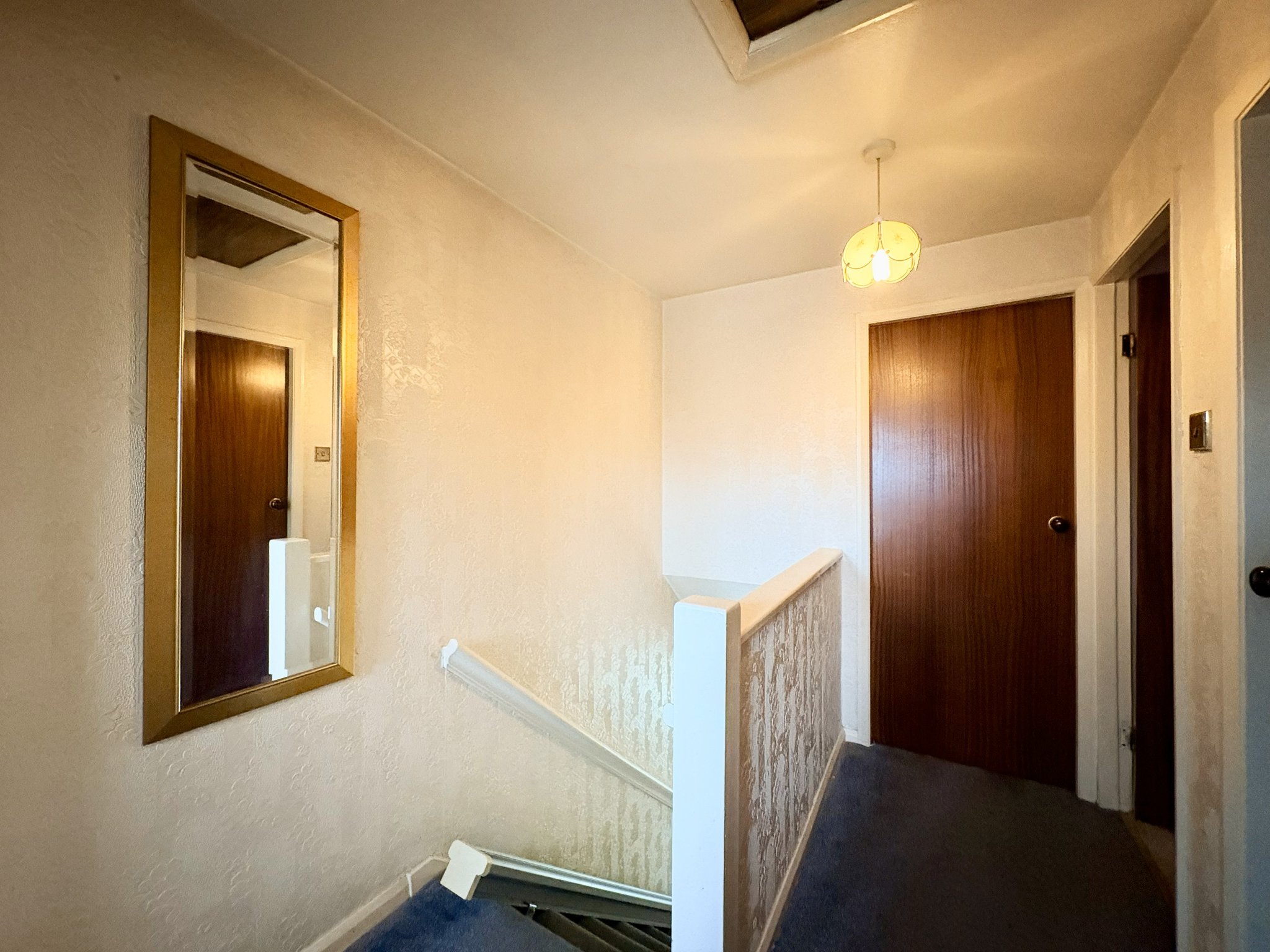 To the first floor, the landing has carpeted flooring, loft access, and a single pendant light fitting.