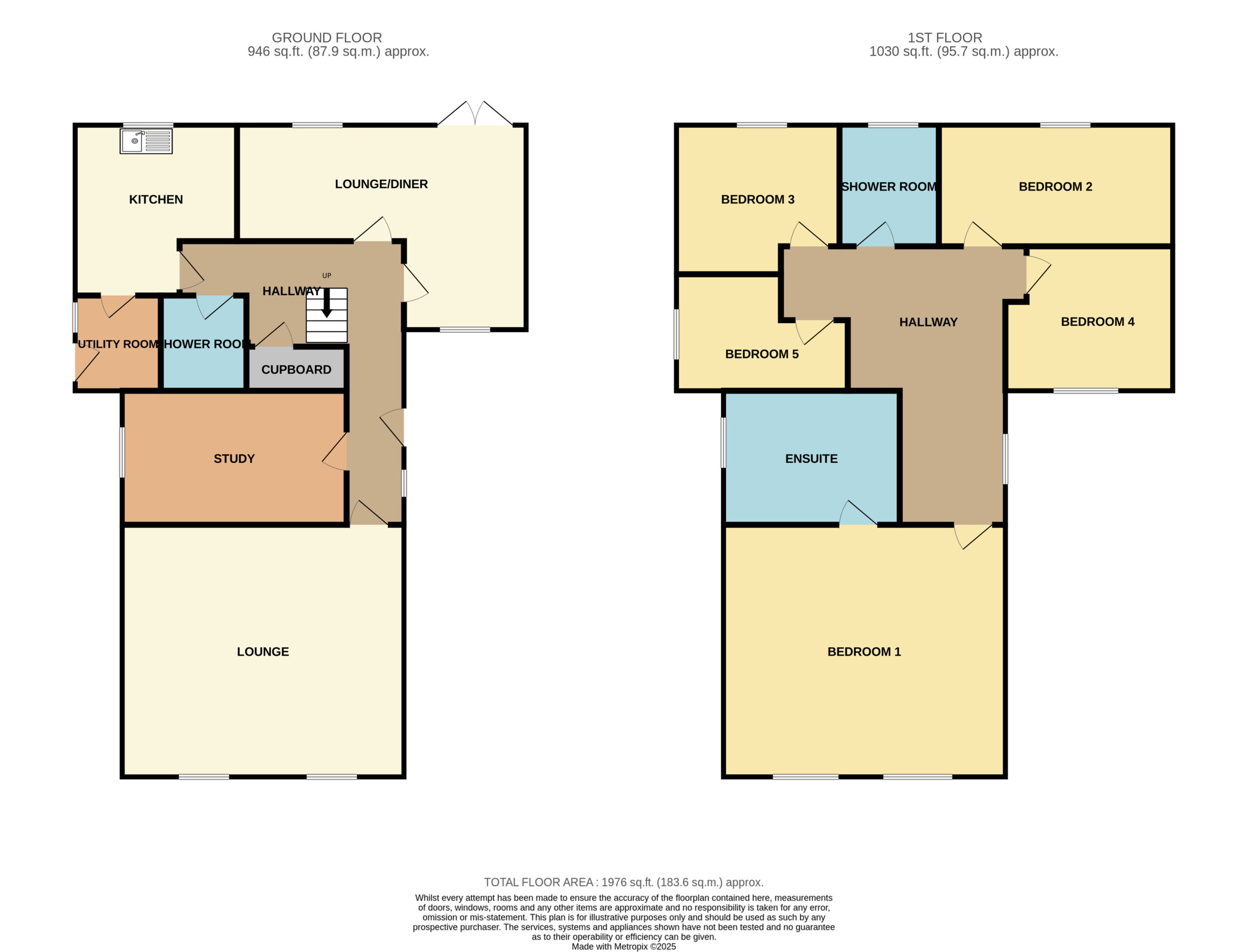 LOUNGE 1 5.031m x 5.104m (16' 6" x 16' 9") STUDY 2.677m x 3.695m (8' 9" x 12' 1") UTILITY ROOM 2.114m x 0.620m (6' 11" x 2' 0") SHOWER ROOM 1.34m x 2.013m (4' 5" x 6' 7") CUPBOARD KITCHEN 2.960m x 3.679m (9' 9" x 12' 1") 2.768m x 3.28m (9' 1" x 10' 9") LOUNGE 2 3.01m x 3.958m (9' 11" x 13' 0") BEDROOM 1 4.483m x 5.596m (14' 8" x 18' 4") ENSUITE 1.577m x 3.263m (5' 2" x 10' 8") BEDROOM 2 2.929m x 4.352m (9' 7" x 14' 3") BEDROOM 3 2.84m x 3.574m (9' 4" x 11' 9") BEDROOM 4 2.975m x 3.026m (9' 9" x 9' 11") BEDROOM 5 2.520m x 3.007m (8' 3" x 9' 10")