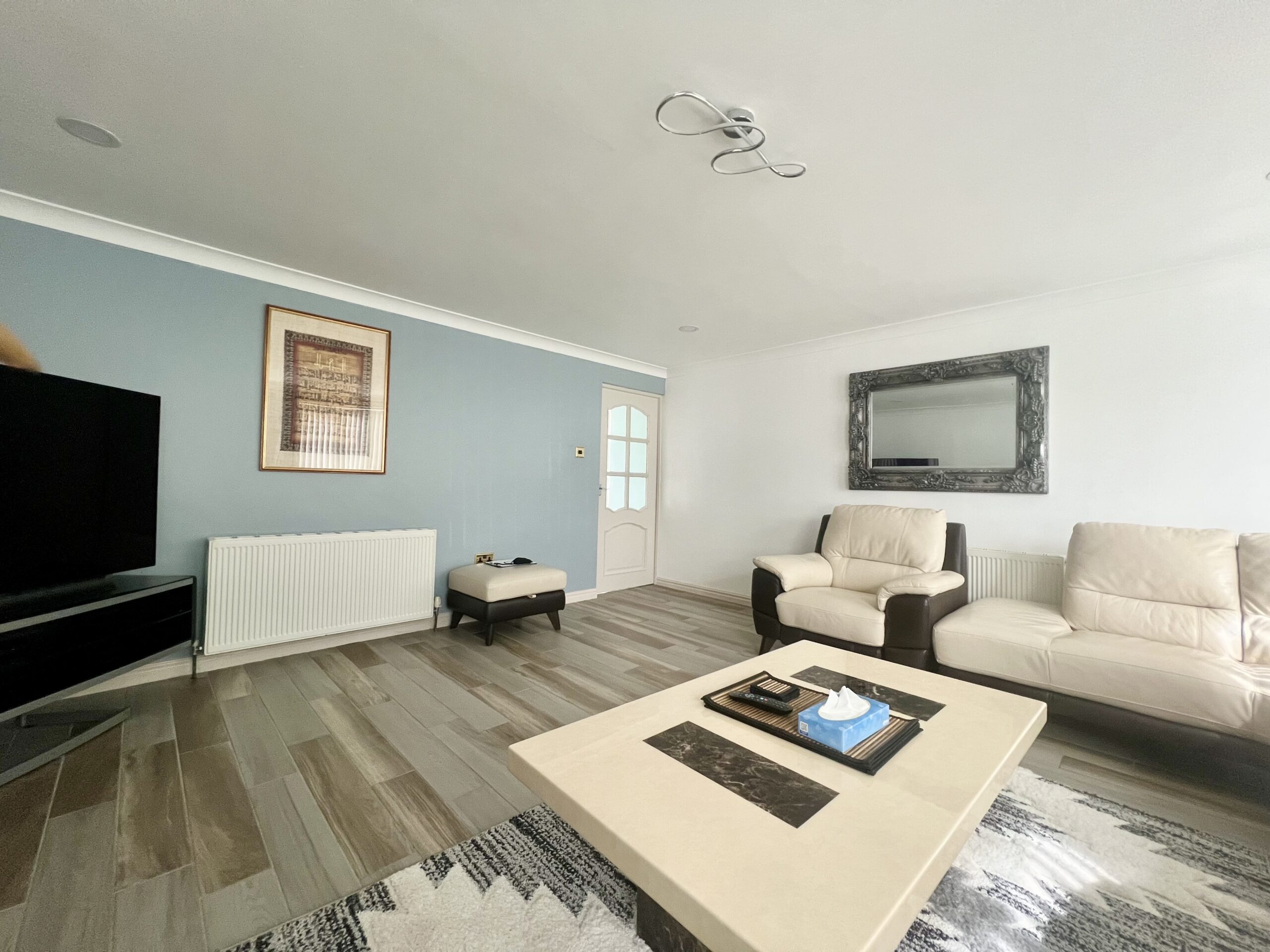 The first lounge is a standout feature of the home, offering a warm and welcoming space enhanced by two large double windows to the front of the property. Finished with stylish wooden flooring that continues throughout most of the ground floor, the room benefits from both a central pendant light fitting and spotlights, creating a cosy yet versatile ambiance. A radiator adds to the comfort, making this an ideal space for relaxing or entertaining.