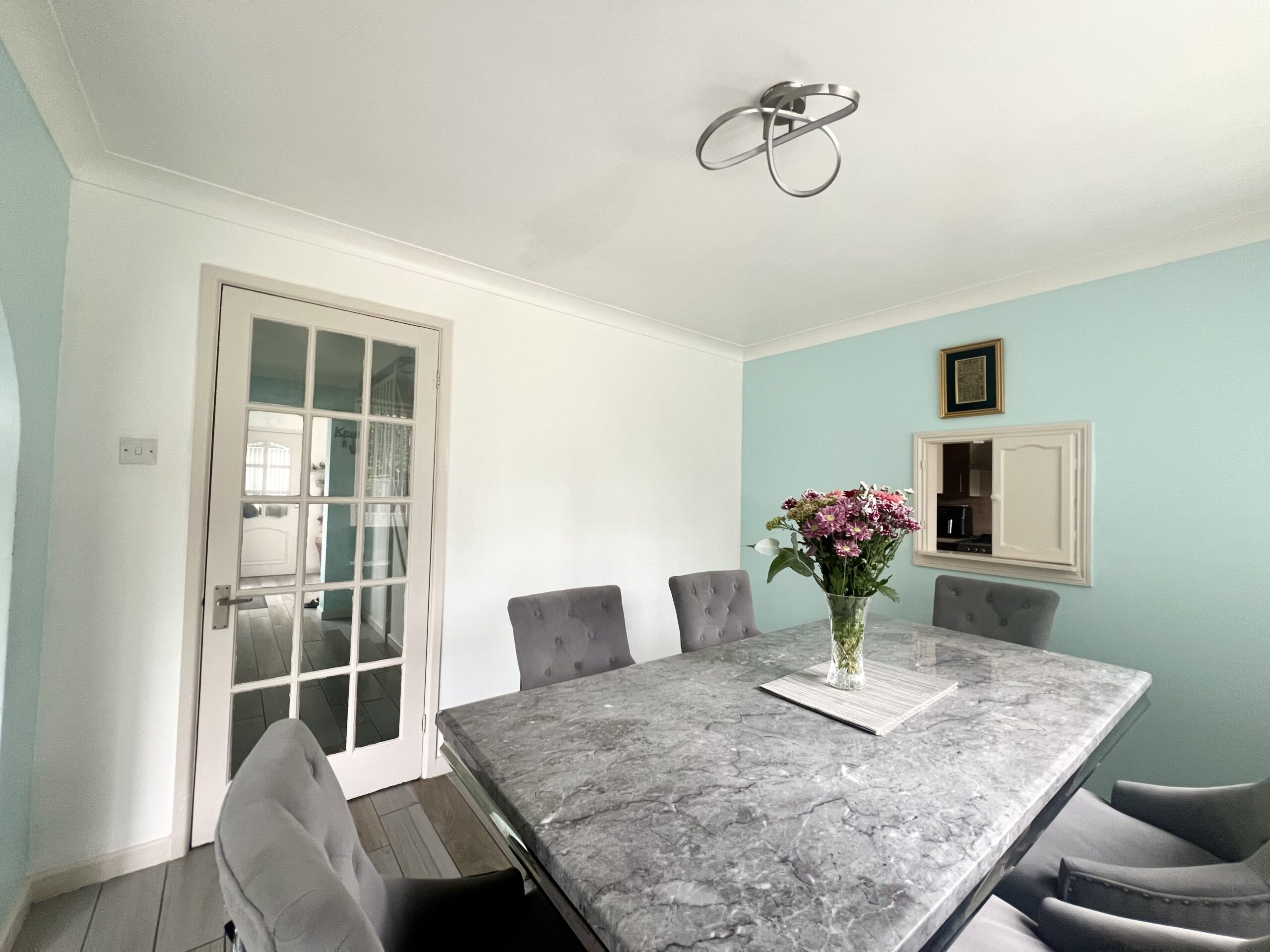The dining area, located just off the second lounge, features a rear-facing window and a convenient hatch offering a view through to the kitchen. The wooden flooring continues seamlessly, complemented by a single pendant light fitting and a radiator, creating a practical and welcoming space for family meals or entertaining guests.