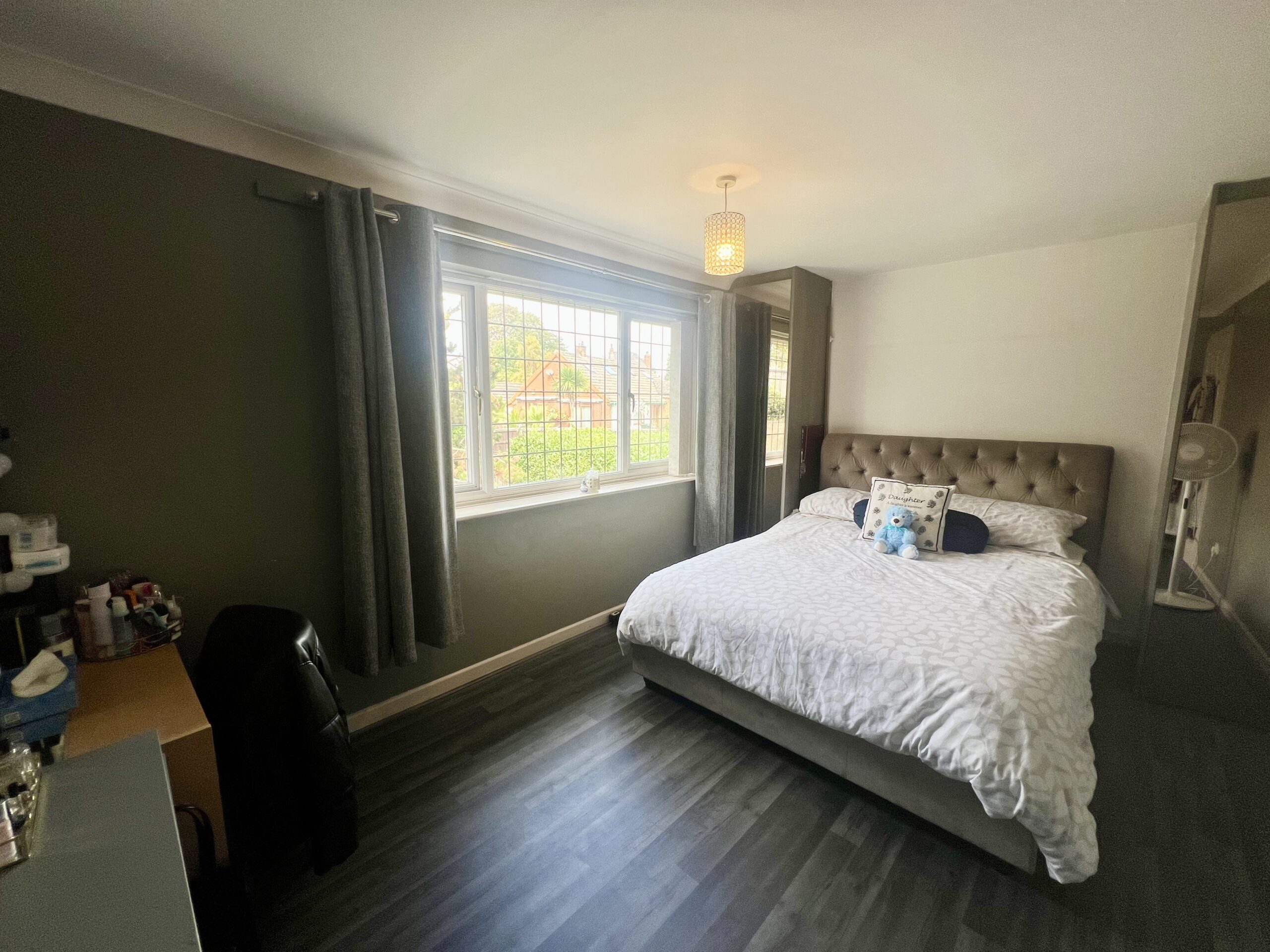 Bedroom four is a double room featuring fitted wardrobes, wooden flooring, a single pendant light fitting, and a window overlooking the front of the property.