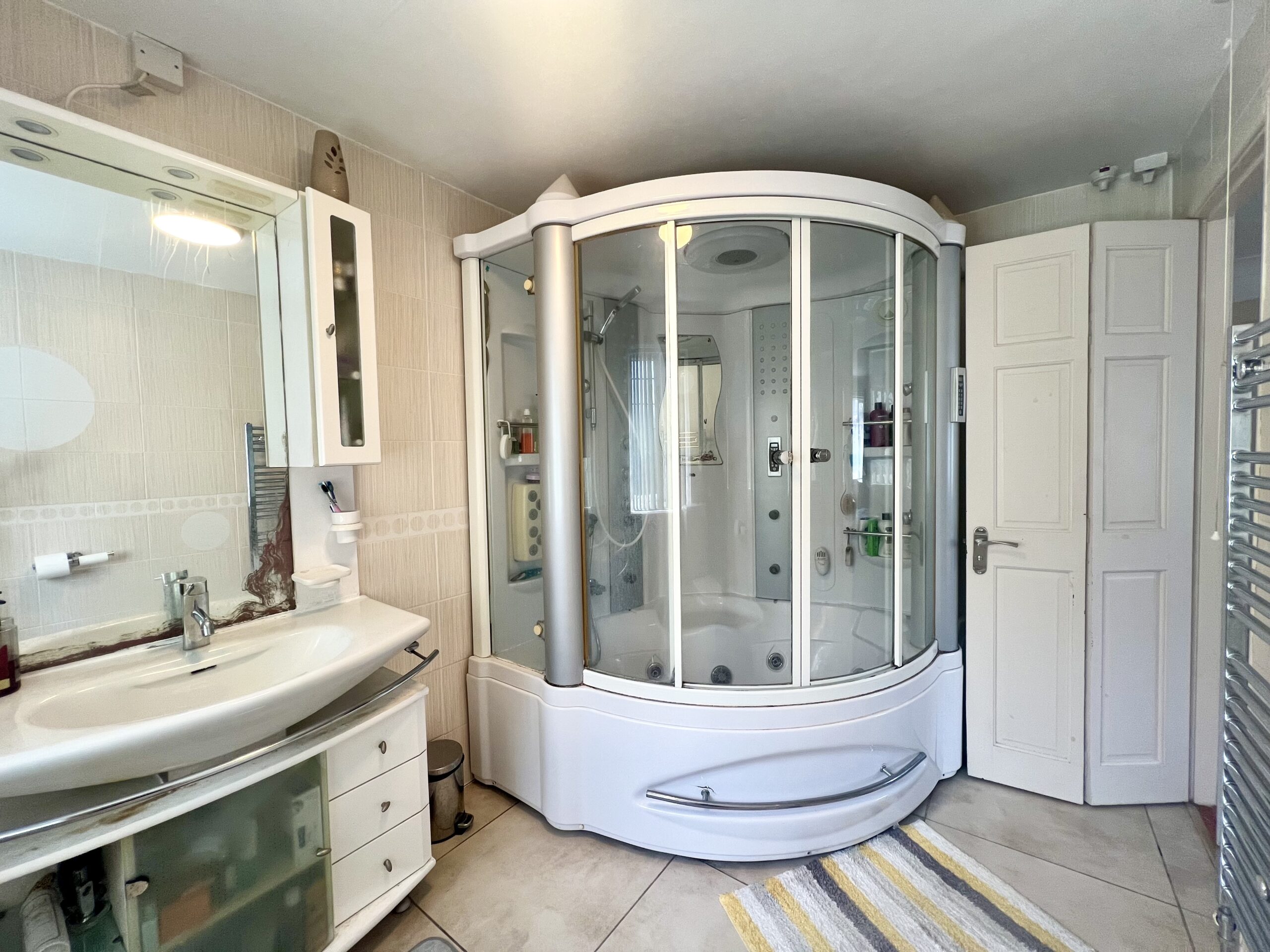 The property benefits from a well-appointed downstairs shower room, featuring a walk-in shower cubicle, WC, and wash basin. Fully tiled throughout for a clean and modern finish, the room is completed with a single pendant light fitting.