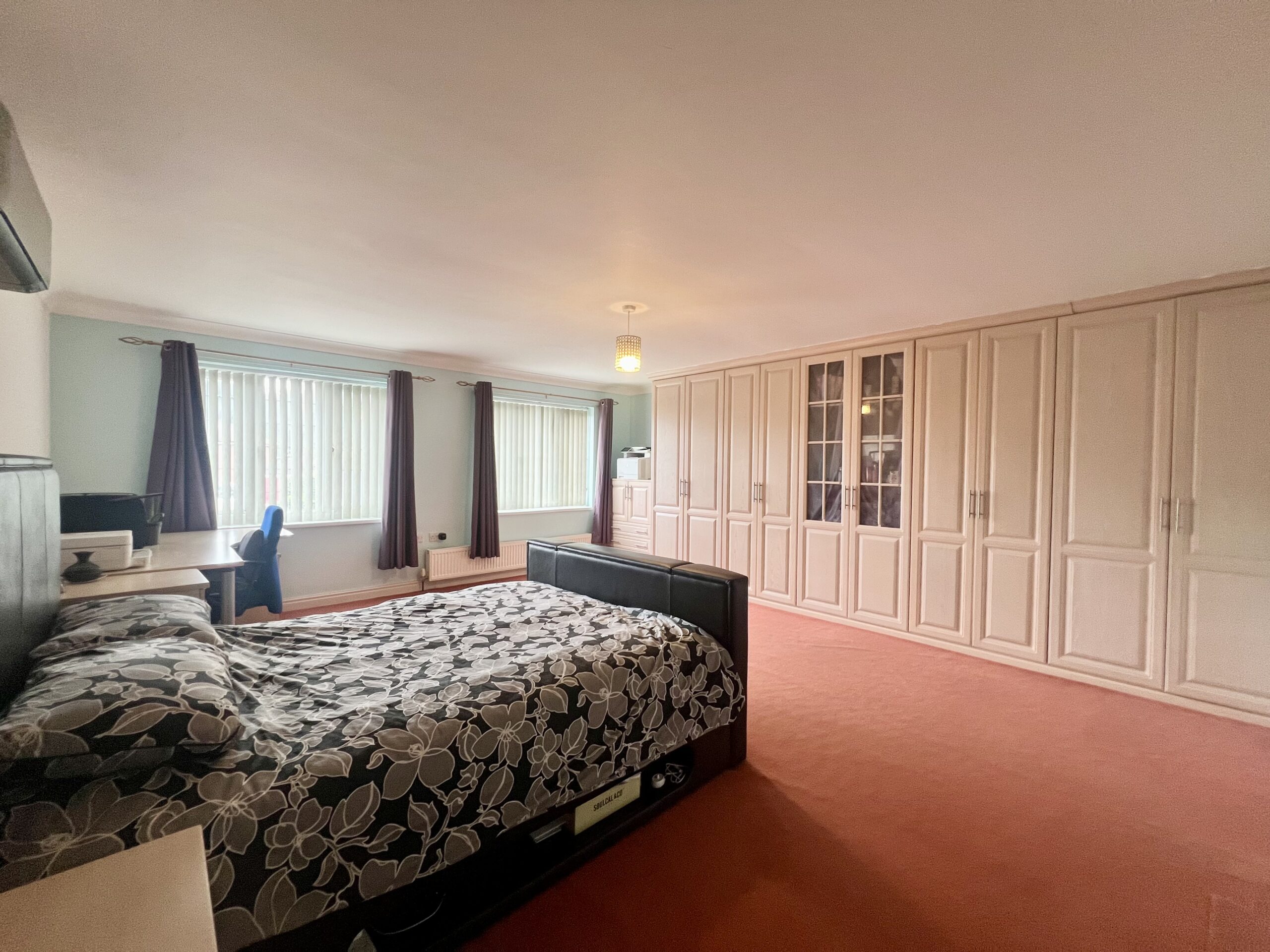 The principal bedroom features two double windows overlooking the front, allowing plenty of natural light to fill the room. It benefits from fitted wardrobes, air conditioning, and carpeted flooring for added comfort. Two single pendant light fittings provide balanced lighting, and there is convenient access to the ensuite bathroom.