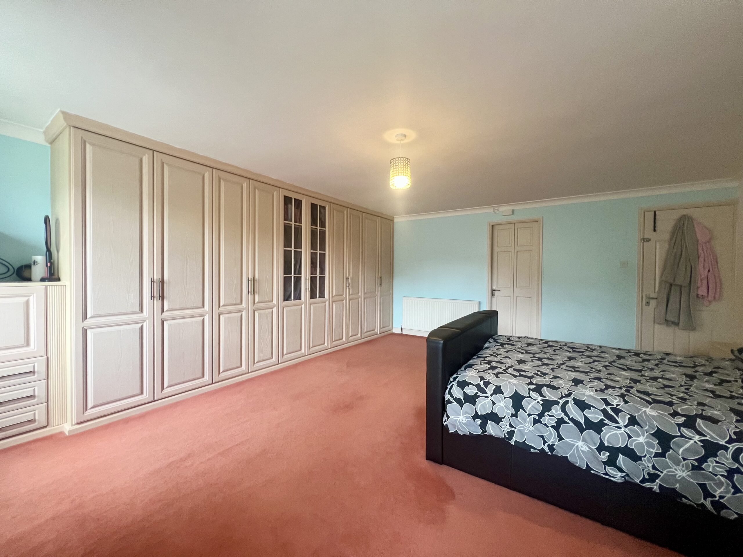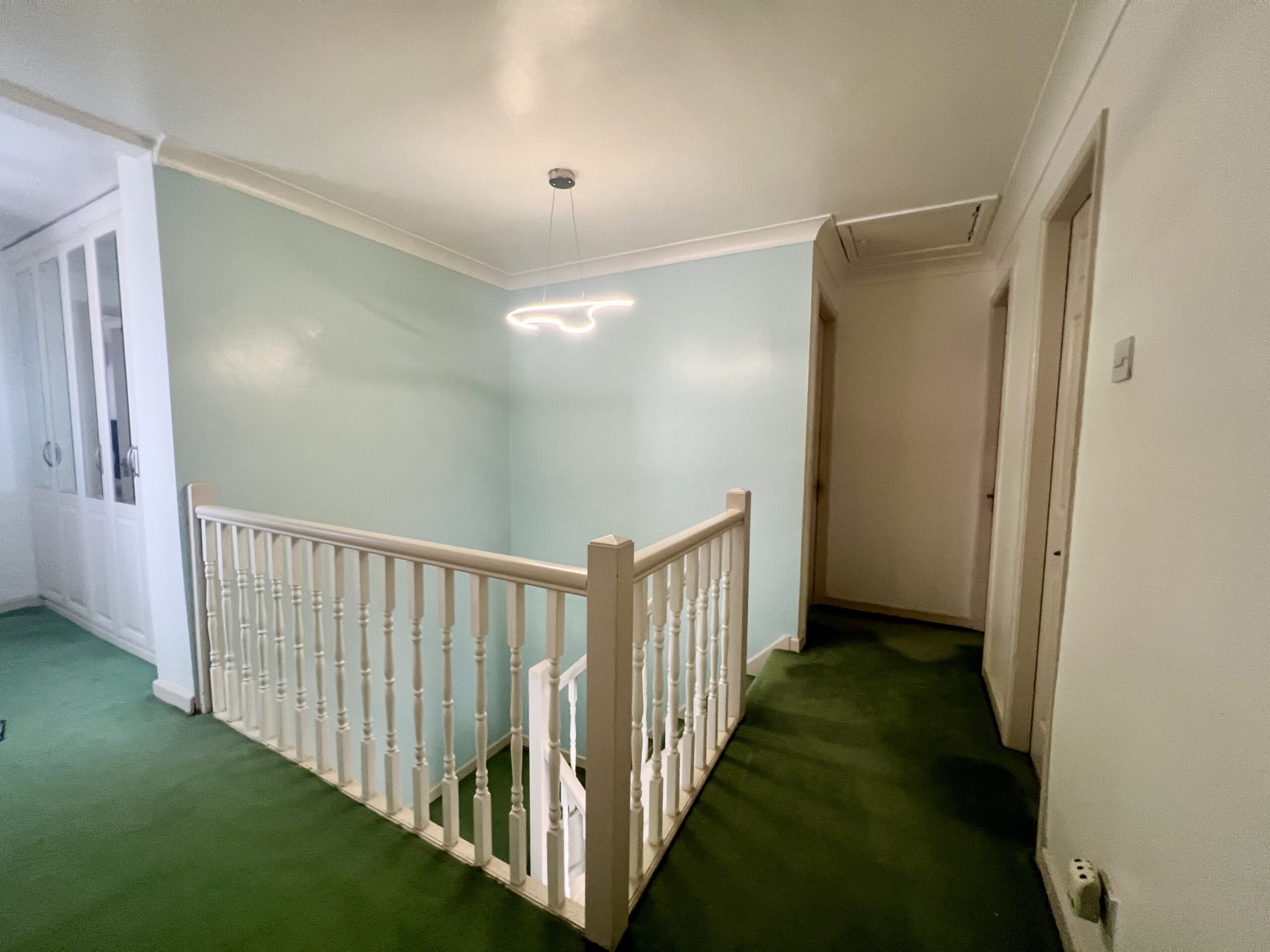 The galleried landing provides access to four of the five bedrooms, along with the family shower room. The principal bedroom is reached via a separate corridor, which includes fitted wardrobes and useful storage space. The landing is finished with carpeted flooring and features two pendant light fittings, adding to the sense of space and comfort.