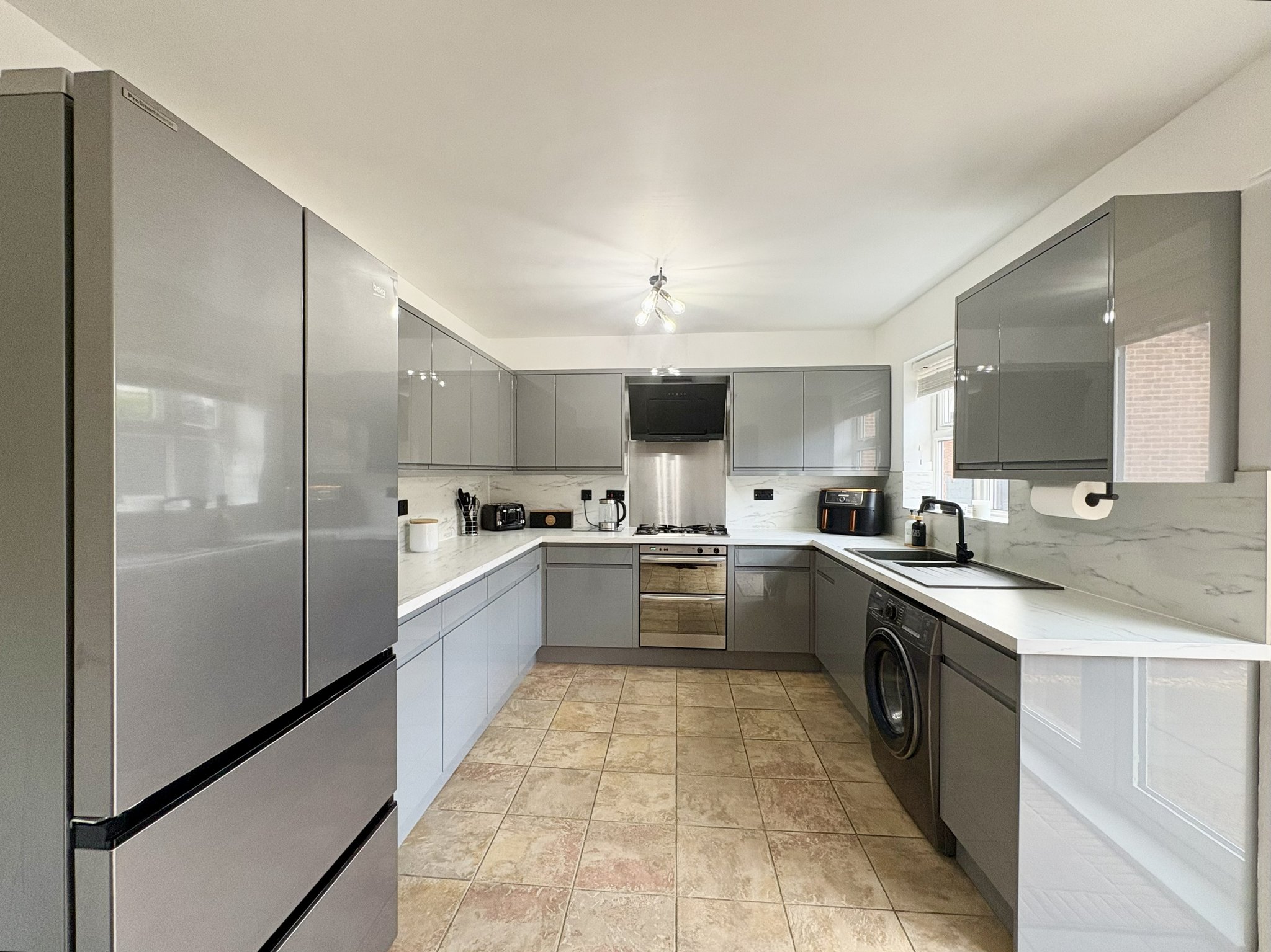 The rear aspect kitchen/dining room is fitted with stylish floor and wall units and fully functional with ample storage, contrasting worktops, and space for appliances. There is an integrated oven, 5 ring gas hob and extractor hood. The dining area provides plenty of space for a dining table with French doors that lead conveniently to the outside of the property, providing direct access to the well maintained garden and patio. Tiled flooring throughout.
