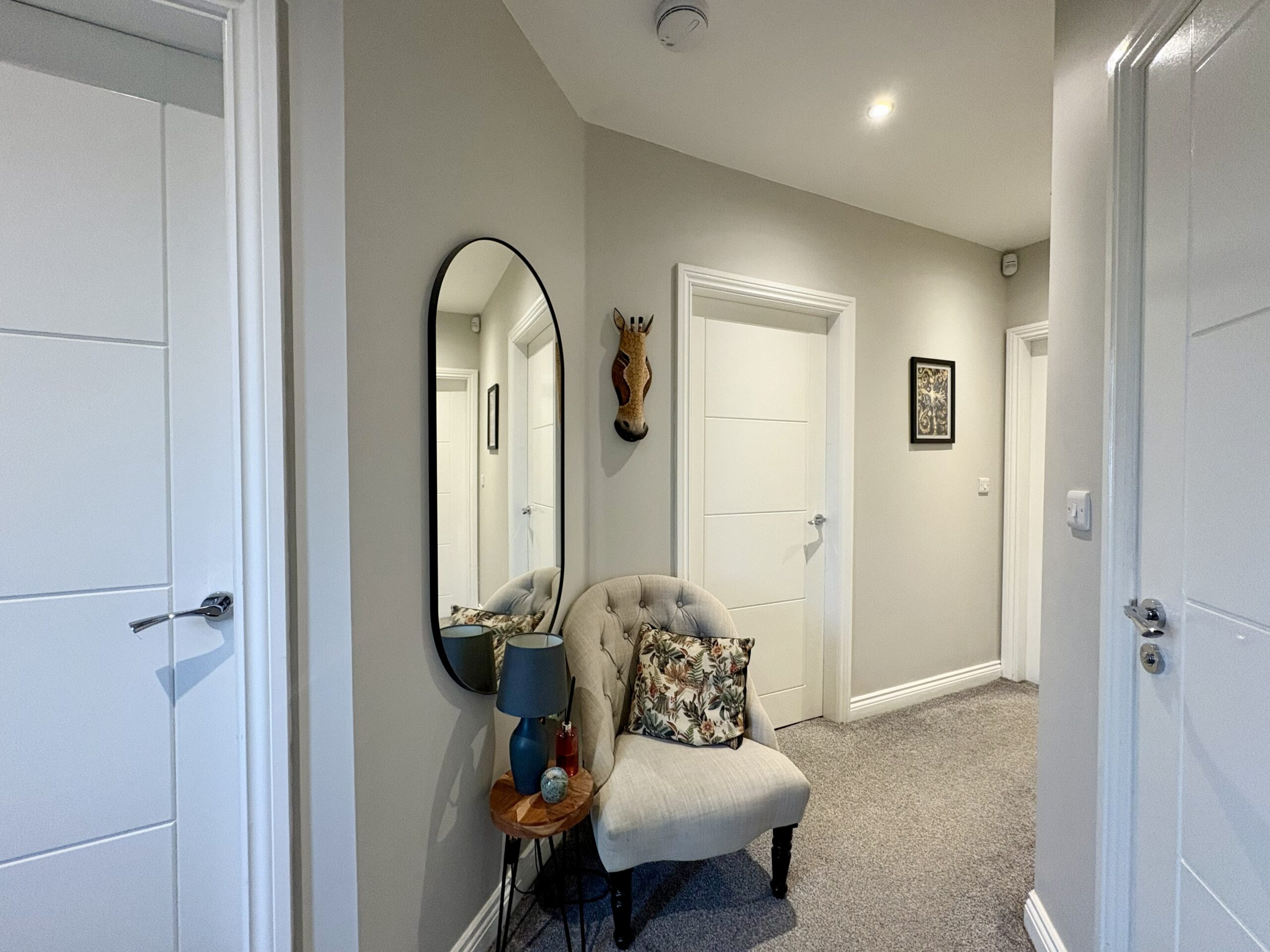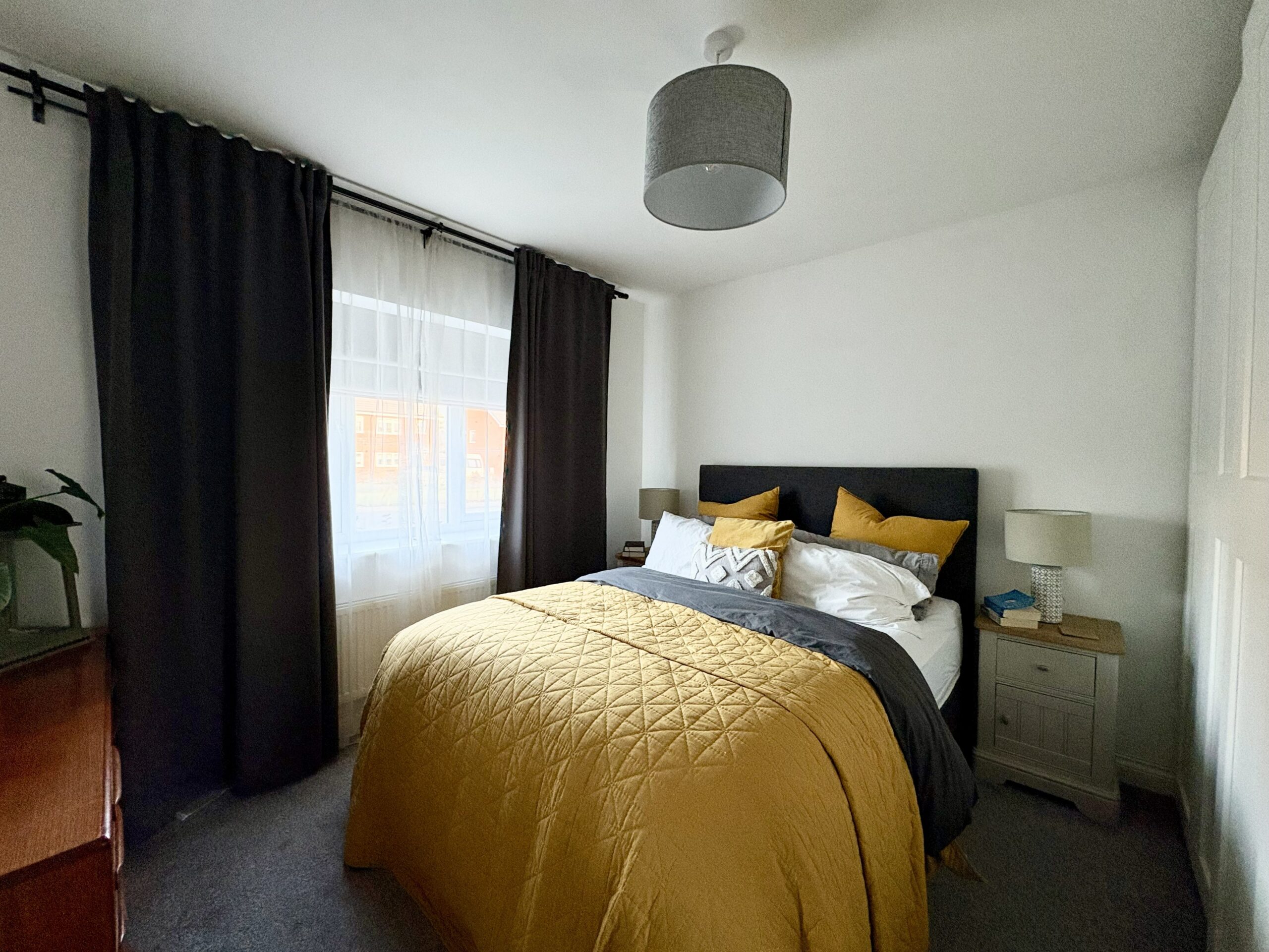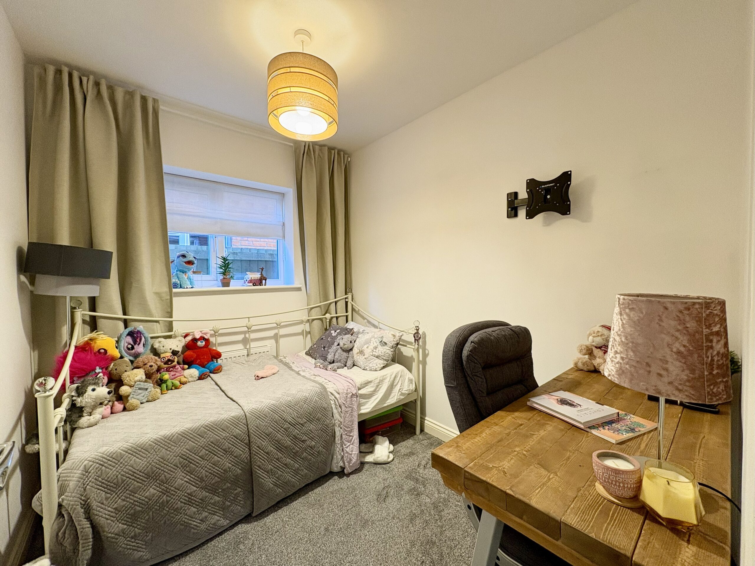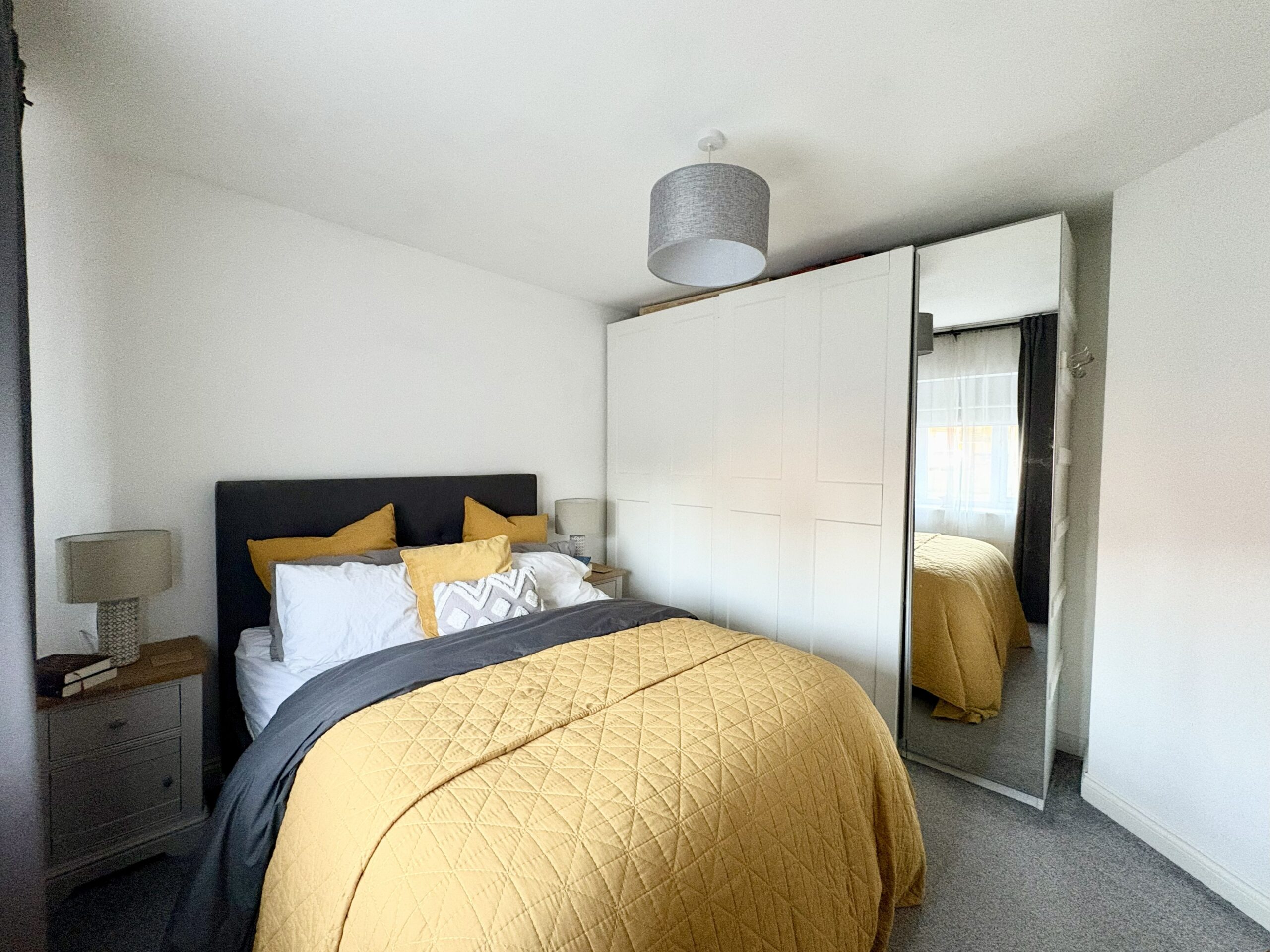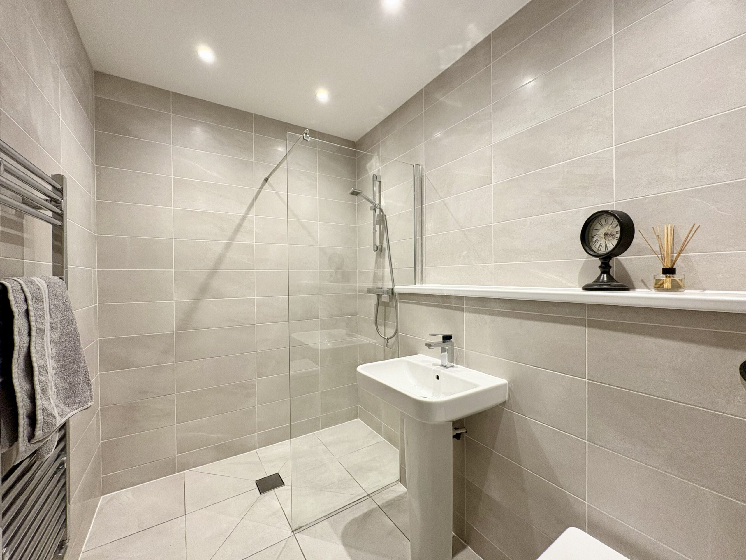 The principal bedroom is a generous double with pleasant views over the front garden and features fitted wardrobes and carpet. The second bedroom, positioned to the side, is currently used flexibly as a guest room or home office and also includes carpet and radiator. A stunning, contemporary shower room serves the home, fitted with a walk-in shower, WC, wash basin, heated towel rail, spot lighting, and full wall and floor tiling for a clean, modern finish.